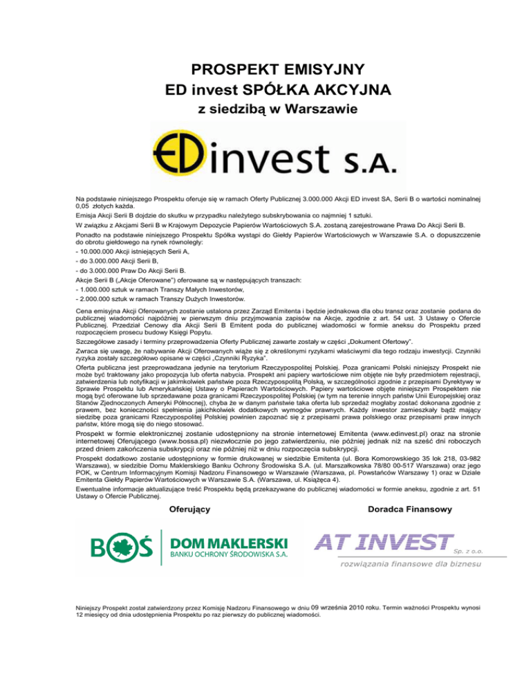 PROSPEKT EMISYJNY ED invest SPÓŁKA AKCYJNA z siedzibą w Warszawie Na podstawie niniejszego Prospektu oferuje się w ramach Oferty Publicznej 3.000.000 Akcji ED invest SA, Serii B o wartości nominalnej 0,05 złotych kaŜda. Emisja Akcji Serii B dojdzie do skutku w przypadku naleŜytego subskrybowania co najmniej 1 sztuki. W związku z Akcjami Serii B w Krajowym Depozycie Papierów Wartościowych S.A. zostaną zarejestrowane Prawa Do Akcji Serii B. Ponadto na podstawie niniejszego Prospektu Spółka wystąpi do Giełdy Papierów Wartościowych w Warszawie S.A. o dopuszczenie do obrotu giełdowego na rynek równoległy: - 10.000.000 Akcji istniejących Serii A, - do 3.000.000 Akcji Serii B, - do 3.000.000 Praw Do Akcji Serii B. Akcje Serii B („Akcje Oferowane”) oferowane są w następujących transzach: - 1.000.000 sztuk w ramach Transzy Małych Inwestorów, - 2.000.000 sztuk w ramach Transzy DuŜych Inwestorów. Cena emisyjna Akcji Oferowanych zostanie ustalona przez Zarząd Emitenta i będzie jednakowa dla obu transz oraz zostanie podana do publicznej wiadomości najpóźniej w pierwszym dniu przyjmowania zapisów na Akcje, zgodnie z art. 54 ust. 3 Ustawy o Ofercie Publicznej. Przedział Cenowy dla Akcji Serii B Emitent poda do publicznej wiadomości w formie aneksu do Prospektu przed rozpoczęciem prosecu budowy Księgi Popytu. Szczegółowe zasady i terminy przeprowadzenia Oferty Publicznej zawarte zostały w części „Dokument Ofertowy”. Zwraca się uwagę, Ŝe nabywanie Akcji Oferowanych wiąŜe się z określonymi ryzykami właściwymi dla tego rodzaju inwestycji. Czynniki ryzyka zostały szczegółowo opisane w części „Czynniki Ryzyka”. Oferta publiczna jest przeprowadzana jedynie na terytorium Rzeczypospolitej Polskiej. Poza granicami Polski niniejszy Prospekt nie moŜe być traktowany jako propozycja lub oferta nabycia. Prospekt ani papiery wartościowe nim objęte nie były przedmiotem rejestracji, zatwierdzenia lub notyfikacji w jakimkolwiek państwie poza Rzeczypospolitą Polską, w szczególności zgodnie z przepisami Dyrektywy w Sprawie Prospektu lub Amerykańskiej Ustawy o Papierach Wartościowych. Papiery wartościowe objęte niniejszym Prospektem nie mogą być oferowane lub sprzedawane poza granicami Rzeczypospolitej Polskiej (w tym na terenie innych państw Unii Europejskiej oraz Stanów Zjednoczonych Ameryki Północnej), chyba Ŝe w danym państwie taka oferta lub sprzedaŜ mogłaby zostać dokonana zgodnie z prawem, bez konieczności spełnienia jakichkolwiek dodatkowych wymogów prawnych. KaŜdy inwestor zamieszkały bądź mający siedzibę poza granicami Rzeczypospolitej Polskiej powinien zapoznać się z przepisami prawa polskiego oraz przepisami praw innych państw, które mogą się do niego stosować. Prospekt w formie elektronicznej zostanie udostępniony na stronie internetowej Emitenta (www.edinvest.pl) oraz na stronie internetowej Oferującego (www.bossa.pl) niezwłocznie po jego zatwierdzeniu, nie później jednak niŜ na sześć dni roboczych przed dniem zakończenia subskrypcji oraz nie później niŜ w dniu rozpoczęcia subskrypcji. Prospekt dodatkowo zostanie udostępniony w formie drukowanej w siedzibie Emitenta (ul. Bora Komorowskiego 35 lok 218, 03-982 Warszawa), w siedzibie Domu Maklerskiego Banku Ochrony Środowiska S.A. (ul. Marszałkowska 78/80 00-517 Warszawa) oraz jego POK, w Centrum Informacyjnym Komisji Nadzoru Finansowego w Warszawie (Warszawa, pl. Powstańców Warszawy 1) oraz w Dziale Emitenta Giełdy Papierów Wartościowych w Warszawie S.A. (Warszawa, ul. KsiąŜęca 4). Ewentualne informacje aktualizujące treść Prospektu będą przekazywane do publicznej wiadomości w formie aneksu, zgodnie z art. 51 Ustawy o Ofercie Publicznej. Oferujący Doradca Finansowy Niniejszy Prospekt został zatwierdzony przez Komisję Nadzoru Finansowego w dniu 09 września 2010 roku. Termin waŜności Prospektu wynosi 12 miesięcy od dnia udostępnienia Prospektu po raz pierwszy do publicznej wiadomości. Spis treści Prospekt Emisyjny ED invest S.A. SPIS TREŚCI PODSUMOWANIE CZYNNIKI RYZYKA DOKUMENT REJESTRACYJNY 1. 2. 3. 4. 5. 6. 7. 8. 9. 10. 11. 12. 13. 14. 15. 16. 17. 18. 19. 20. 21. 22. 23. 24. 25. 3 19 34 Osoby odpowiedzialne za informacje zamieszczone w Prospekcie.................................................34 Biegli rewidenci................................................................................................................................38 Wybrane informacje finansowe........................................................................................................40 Czynniki ryzyka................................................................................................................................42 Informacje o Emitencie ....................................................................................................................43 Zarys ogólny działalności Emitenta..................................................................................................48 Struktura organizacyjna ...................................................................................................................75 Środki trwałe ....................................................................................................................................77 Przegląd sytuacji operacyjnej i finansowej Emitenta........................................................................79 Zasoby kapitałowe ...........................................................................................................................87 Badania i rozwój, patenty i licencje ..................................................................................................92 Informacje o tendencjach.................................................................................................................93 Prognozy wyników lub wyniki szacunkowe.........................................................