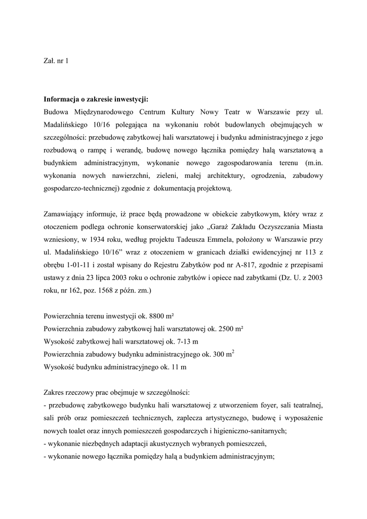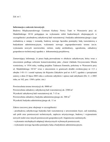Zał. nr 1 Informacja o zakresie inwestycji: Budowa Międzynarodowego Centrum Kultury Nowy Teatr w Warszawie przy ul. Madalińskiego 10/16 polegająca na wykonaniu robót budowlanych obejmujących w szczególności: przebudowę zabytkowej hali warsztatowej i budynku administracyjnego z jego rozbudową o rampę i werandę, budowę nowego łącznika pomiędzy halą warsztatową a budynkiem administracyjnym, wykonanie nowego zagospodarowania terenu (m.in. wykonania nowych nawierzchni, zieleni, małej architektury, ogrodzenia, zabudowy gospodarczo-technicznej) zgodnie z dokumentacją projektową. Zamawiający informuje, iż prace będą prowadzone w obiekcie zabytkowym, który wraz z otoczeniem podlega ochronie konserwatorskiej jako „Garaż Zakładu Oczyszczania Miasta wzniesiony, w 1934 roku, według projektu Tadeusza Emmela, położony w Warszawie przy ul. Madalińskiego 10/16” wraz z otoczeniem w granicach działki ewidencyjnej nr 113 z obrębu 1-01-11 i został wpisany do Rejestru Zabytków pod nr A-817, zgodnie z przepisami ustawy z dnia 23 lipca 2003 roku o ochronie zabytków i opiece nad zabytkami (Dz. U. z 2003 roku, nr 162, poz. 1568 z późn. zm.) Powierzchnia terenu inwestycji ok. 8800 m² Powierzchnia zabudowy zabytkowej hali warsztatowej ok. 2500 m² Wysokość zabytkowej hali warsztatowej ok. 7-13 m Powierzchnia zabudowy budynku administracyjnego ok. 300 m2 Wysokość budynku administracyjnego ok. 11 m Zakres rzeczowy prac obejmuje w szczególności: - przebudowę zabytkowego budynku hali warsztatowej z utworzeniem foyer, sali teatralnej, sali prób oraz pomieszczeń technicznych, zaplecza artystycznego, budowę i wyposażenie nowych toalet oraz innych pomieszczeń gospodarczych i higieniczno-sanitarnych; - wykonanie niezbędnych adaptacji akustycznych wybranych pomieszczeń, - wykonanie nowego łącznika pomiędzy halą a budynkiem administracyjnym; - przebudowę i rozbudowę oraz wzmocnienie fundamentów budynku administracyjnego w tym budowa nowych schodów i toalet dla publiczności w suterenie, budowa zewnętrznej rampy i werandy; - wykonanie nowej stolarki wewnętrznej i zewnętrznej, w tym rekonstrukcja bram hali warsztatowej, - wykonanie nowych instalacji wewnętrznych w szczególności: ppoż, wod-kan, elektrycznej, oświetleniowej, siłowej, CCTV, C.O, teletechnicznej, wentylacyjnej, okablowania strukturalnego dla systemów technologii teatralnej wraz przyłączami, - realizację nowego zagospodarowania terenu obejmującego w szczególności: likwidację oraz modernizację części sieci zewnętrznych, wykonanie terenowych gniazd przyłączeniowych, wykonanie nowych nawierzchni utwardzonych i nieutwardzonych, niezbędnych urządzeń budowlanych, wykonanie nowych ogrodzeń z bramami, furtkami, panelami przesuwanymi, budowę małej architektury i likwidację portierni, wykonanie nowych nasadzeń zieleni z wycinką i przycinką części zieleni istniejącej, - dostawę i montaż okablowania strukturalnego systemów technologii teatralnej, - dostawę i montaż w hali warsztatowej przesuwanych ścian działowych spełniających wymogi ochrony akustycznej, dźwigu towarowego oraz innych urządzeń technicznych niezbędnych do użytkowania obiektów zgodnie z ich przeznaczeniem - koordynowanie jako Generalny Wykonawca, dostaw i instalacji w szczególności wyposażenia teatralnego i ruchomego, przez Dostawców wybranych przez Zamawiającego w odrębnych postępowaniach.