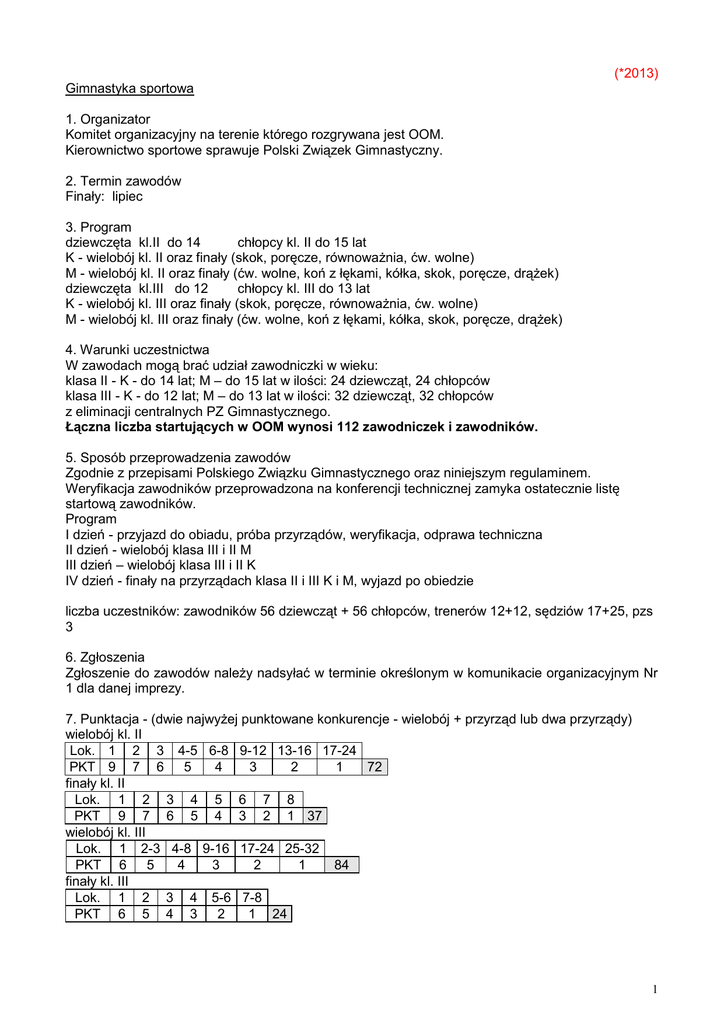(*2013) Gimnastyka sportowa 1. Organizator Komitet organizacyjny na terenie którego rozgrywana jest OOM. Kierownictwo sportowe sprawuje Polski Związek Gimnastyczny. 2. Termin zawodów Finały: lipiec 3. Program dziewczęta kl.II do 14 chłopcy kl. II do 15 lat K - wielobój kl. II oraz finały (skok, poręcze, równoważnia, ćw. wolne) M - wielobój kl. II oraz finały (ćw. wolne, koń z łękami, kółka, skok, poręcze, drążek) dziewczęta kl.III do 12 chłopcy kl. III do 13 lat K - wielobój kl. III oraz finały (skok, poręcze, równoważnia, ćw. wolne) M - wielobój kl. III oraz finały (ćw. wolne, koń z łękami, kółka, skok, poręcze, drążek) 4. Warunki uczestnictwa W zawodach mogą brać udział zawodniczki w wieku: klasa II - K - do 14 lat; M – do 15 lat w ilości: 24 dziewcząt, 24 chłopców klasa III - K - do 12 lat; M – do 13 lat w ilości: 32 dziewcząt, 32 chłopców z eliminacji centralnych PZ Gimnastycznego. Łączna liczba startujących w OOM wynosi 112 zawodniczek i zawodników. 5. Sposób przeprowadzenia zawodów Zgodnie z przepisami Polskiego Związku Gimnastycznego oraz niniejszym regulaminem. Weryfikacja zawodników przeprowadzona na konferencji technicznej zamyka ostatecznie listę startową zawodników. Program I dzień - przyjazd do obiadu, próba przyrządów, weryfikacja, odprawa techniczna II dzień - wielobój klasa III i II M III dzień – wielobój klasa III i II K IV dzień - finały na przyrządach klasa II i III K i M, wyjazd po obiedzie liczba uczestników: zawodników 56 dziewcząt + 56 chłopców, trenerów 12+12, sędziów 17+25, pzs 3 6. Zgłoszenia Zgłoszenie do zawodów należy nadsyłać w terminie określonym w komunikacie organizacyjnym Nr 1 dla danej imprezy. 7. Punktacja - (dwie najwyżej punktowane konkurencje - wielobój + przyrząd lub dwa przyrządy) wielobój kl. II Lok. 1 2 3 4-5 6-8 9-12 13-16 17-24 PKT 9 7 6 5 4 3 2 1 72 finały kl. II Lok. 1 2 3 4 5 6 7 8 PKT 9 7 6 5 4 3 2 1 37 wielobój kl. III Lok. 1 2-3 4-8 9-16 17-24 25-32 PKT 6 5 4 3 2 1 84 finały kl. III Lok. 1 2 3 4 5-6 7-8 PKT 6 5 4 3 2 1 24 1 D. System ocen Gimnastyka sportowa II. Mistrzostwa Polski Juniorów Klasa I - K - do 16 lat, Klasa I - M - do 18 lat 1. Program K - wielobój kl. I oraz finały (ćwicz. wolne, skok, poręcze, równoważnia) M - wielobój kl. I oraz finały (ćwicz. wolne, koń z łękami, kółka, skok, poręcze, drążek). 2. Punktacja - (trzy najwyżej punktowane konkurencje - wielobój + dwa przyrządy lub trzy przyrządy) wielobój Lok. 1 2 3 4 5 6 7 8 9 10-11 12-13 14-16 PKT 15 12 10 9 8 7 6 5 4 3 2 1 89 finały Lok. 1 2 3 4 5 6 7 8 PKT 15 12 10 8 6 4 3 2 60 III. Olimpiada Młodzieży - Mistrzostwa Polski Juniorów młodszych Klasa II K – do 14 lat, M do 15 lat, Klasa III K – do 12 lat, M do 13 lat 1. Program dziewczęta kl. II do 14 chłopcy kl. II do 15 lat K - wielobój kl. II oraz finały (skok, poręcze, równoważnia, ćw. wolne) M - wielobój kl. II oraz finały (ćw. wolne, koń z łękami, kółka, skok, poręcze, drążek) dziewczęta kl. III do 12 chłopcy kl. III do 13 lat K - wielobój kl. III oraz finały (skok, poręcze, równoważnia, ćw. wolne) M - wielobój kl. III oraz finały (ćw. wolne, koń z łękami, kółka, skok, poręcze, drążek) 2. Punktacja - (dwie najwyżej punktowane konkurencje - wielobój + przyrząd lub dwa przyrządy) wielobój kl. II Lok. 1 2 3 4-5 6-8 9-12 13-16 17-24 PKT 9 7 6 5 4 3 2 1 72 finały kl. II Lok. 1 2 3 4 5 6 7 8 PKT 9 7 6 5 4 3 2 1 37 wielobój kl. III Lok. 1 2-3 4-8 9-16 17-24 25-32 PKT 6 5 4 3 2 1 84 finały kl. III Lok. 1 2 3 4 5-6 7-8 PKT 6 5 4 3 2 1 24 Eliminacje do OOM – eliminacje centralne IV. Międzywojewódzkie Mistrzostwa Młodzików K - do 10 lat M - do 11 lat 1. Program K - wielobój kl. młodzieżowa (skok, poręcze, równoważnia, ćw. wolne) M - wielobój kl. młodzieżowa (ćw. wolne, koń z łękami, kółka, skok, poręcze, drążek) 2. Punktacja - (dwie najwyżej punktowane konkurencje - wielobój + przyrząd lub dwa przyrządy) wielobój Lok. 1 2-3 4-12 PKT 3 2 1 16 finały Lok. 1 2 3-4 PKT 3 2 1 7 2 Młodziczki – strefy A – LUB, MŁP, ŁDZ B – KPM, WM, ZPM C – OPO, DŚL, ŚL 2012 MŁP WM OPO 2013 MŁP KPM DŚL 2014 2015 2012 ZPM POM MŁP ŚL 2013 ŁDZ POM MŁP OPO 2014 2015 Młodzicy – strefy A – KPM, ŁDZ, WLP, ZPM B – MAZ, PDL, POM, WM C – LUB, MŁP, PKR, ŚWI D – DSL, LBU, OPO, ŚL E. Roczniki juniorzy juniorzy młodsi młodzicy K M K K M M K M do 16 lat (w 2013 roku urodzeni 01.01.1997 i młodsi) klasa I do 18 lat (w 2013 roku urodzeni 01.01.1995 i młodsi) klasa I do 14 lat (w 2013 roku urodzeni 01.01.1999 i młodsi) klasa II do 12 lat (w 2013 roku urodzeni 01.01.2001 i młodsi) klasa III do 15 lat (w 2013 roku urodzeni 01.01.1998 i młodsi) klasa II do 13 lat (w 2013 roku urodzeni 01.01.2000 i młodsi) klasa III do 10 lat (w 2013 roku urodzeni 01.01.2003 i młodsi) klasa młodzież do 11 lat (w 2013 roku urodzeni 01.01.2002 i młodsi) klasa młodzież Przypominamy: - w zawodach uczestniczą kluby posiadające licencję wydaną przez właściwy polski związek, - zawodnicy muszą posiadać licencję wydaną przez właściwy związek, - w przypadku braku licencji klubowej – punkty naliczane będą dla gminy, - komunikat z zawodów powinien zawierać rok urodzenia zawodnika, numer licencji zawodnika oraz pełną nazwę klubu, wykaz członków komisji sędziowskiej wraz z ich nr licencji i być podpisany przez sędziego głównego z podaniem jego nr licencji - komunikat z zawodów należy przesłać na adres Polskiej Federacji Sportu Młodzieżowego w ciągu 14 dni po zawodach, - wnioski o przyznanie premii punktowej, wnioski o podział punktów powinny wpłynąć od pzs do Komisji Sportu PFSM najpóźniej w terminie do dnia 31 października danego roku (decyduje data stempla pocztowego), - uwagi dotyczące wprowadzonych danych, w szczególności nazw klubów i przyznanych punktów powinny wpływać na bieżąco do PFSM a n