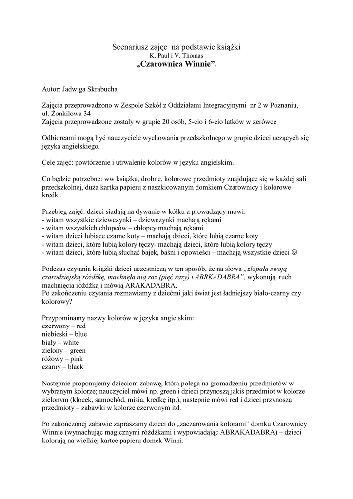 Scenariusz zajęc na podstawie ksiąŜki K. Paul i V. Thomas „Czarownica Winnie”. Autor: Jadwiga Skrabucha Zajęcia przeprowadzono w Zespole Szkół z Oddziałami Integracyjnymi nr 2 w Poznaniu, ul. śonkilowa 34 Zajęcia przeprowadzone zostały w grupie 20 osób, 5-cio i 6-cio latków w zerówce Odbiorcami mogą być nauczyciele wychowania przedszkolnego w grupie dzieci uczących się języka angielskiego. Cele zajęć: powtórzenie i utrwalenie kolorów w języku angielskim. Co będzie potrzebne: ww ksiąŜka, drobne, kolorowe przedmioty znajdujące się w kaŜdej sali przedszkolnej, duŜa kartka papieru z naszkicowanym domkiem Czarownicy i kolorowe kredki. Przebieg zajęć: dzieci siadają na dywanie w kółku a prowadzący mówi: - witam wszystkie dziewczynki – dziewczynki machają rękami - witam wszystkich chłopców – chłopcy machają rękami - witam dzieci lubiące czarne koty – machają dzieci, które lubią czarne koty - witam dzieci, które lubią kolory tęczy- machają dzieci, które lubią kolory tęczy - witam dzieci, które lubią słuchać bajek, baśni i opowieści – machają wszystkie dzieci ☺ Podczas czytania ksiąŜki dzieci uczestniczą w ten sposób, Ŝe na słowa „złapała swoją czarodziejską róŜdŜkę, machnęła nią raz (pięć razy) i ABRKADABRA”, wykonują ruch machnięcia róŜdŜką i mówią ARAKADABRA. Po zakończeniu czytania rozmawiamy z dziećmi jaki świat jest ładniejszy biało-czarny czy kolorowy? Przypominamy nazwy kolorów w języku angielskim: czerwony – red niebieski – blue biały – white zielony – green róŜowy – pink czarny – black Następnie proponujemy dzieciom zabawę, która polega na gromadzeniu przedmiotów w wybranym kolorze; nauczyciel mówi np. green i dzieci przynoszą jakiś przedmiot w kolorze zielonym (klocek, samochód, misia, kredkę itp.), następnie mówi red i dzieci przynoszą przedmioty – zabawki w kolorze czerwonym itd. Po zakończonej zabawie zapraszamy dzieci do „zaczarowania kolorami” domku Czarownicy Winnie (wymachując magicznymi róŜdŜkami i wypowiadając ABRAKADABRA) – dzieci kolorują na wielkiej kartce papieru domek Winni. Na zakończenie zapraszamy wszystkie dzieci do koła (dzieci stoją) i Ŝegnamy się słowami: - niech podskoczą te osoby, którym podobała się historia o Czarownicy Winnie - niech klasą dwa razy dzieci, które znają kolory w języku angielskim - niech zrobią obrót dzieci, które nauczyły się czarować i na zakończenie machamy róŜdŜką wymawiamy magicznym głosem ABRAKADABRA