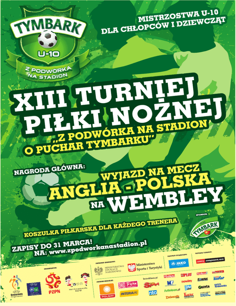 A A GŁÓWN NAGROD A KOSZULK : PIŁKA NERA EGO TRE A KAŻD RSKA DL NIEJU: HNICZNY: TUR PARTNER TEC PARTNER BYDGOSKI dion.pl rkanasta o w d o p .z www 2 DRODZY PIŁKARZE I PIŁKARKI, DRODZY TRENERZY! Z wielką przyjemnością zapraszamy Was do wzięcia udziału w XIII Turnieju Piłki Nożnej „Z podwórka na stadion o Puchar Tymbarku”, czyli największych piłkarskich rozgrywkach dla dziesięciolatków i młodszych dzieci w Europie. B ędziemy zaszczyceni, jeżeli zechcecie zgłosić swoje zespoły do Turnieju i rozpoczniecie z nami pasjonującą, futbolową przygodę, która jest szansą na spełnianie małych i dużych marzeń. Piłka nożna jest naszą wielką, wspólną pasją, dlatego wierzymy, że razem przeżyjemy na stadionach całej Polski wiele niezapomnianych i magicznych chwil, doskonale się przy tym bawiąc. Z achęcamy Was do zgłaszania jak największej liczby drużyn, aby każdy piłkarz, piłkarka oraz trener z Waszej szkoły lub Uczniowskiego Klubu Sportowego, mieli okazję pokazać innym swój talent i umiejętności, a także walczyć o wyjątkowe trofea i nagrody: Puchar Tymbarku – prestiżowe Trofeum, o które tylko w ubiegłym roku walczyło ponad 140 000 chłopców i dziewcząt z całej Polski! Tytuł Mistrzów U-10 – wyjątkowy i prestiżowy Tytuł, przeznaczony tylko dla najlepszych w naszym kraju piłkarskich drużyn w tej kategorii wiekowej! Wyjazd na mecz Anglia - Polska na stadionie Wembley – kolejne wielkie starcie reprezentacji Polski z angielskimi gwiazdami na legendarnym stadionie Wembley! To właśnie Wy możecie trzymać w Londynie kciuki za biało-czerwonych! Dlaczego warto zagrać w Turnieju „Z podwórka na stadion o Puchar Tymbarku” Za udział w Turnieju każdej zgłoszonej drużyny, trener otrzyma profesjonalną koszulkę piłkarską firmy JAKO (np. jeżeli trener weźmie udział w rozgrywkach z 6 drużynami, otrzyma 6 koszulek piłkarskich JAKO). Każdy trener może zgłosić dowolną liczbę drużyn 2, 5, 10, 15… ! Na poszczególnych etapach rozgrywek, uczestnicy Turnieju otrzymają atrakcyjne upominki. Dzięki oryginalnej formule Turnieju, trenerzy zwycięskich drużyn, mogą dobrać do swojego składu najlepszych zawodników z innych drużyn! Każdy może przeżyć fantastyczną, piłkarską przygodę! Serdecznie zapraszamy i do zobaczenia na stadionach! dion.pl rkanasta o w d o p .z www ZAGRAJ W NAJWIĘKSZYCH PIŁKARSKICH ROZGRYWKACH DLA DZIESIĘCIOLATKÓW W EUROPIE Turniej „Z podwórka na stadion o Puchar Tymbarku” to największe piłkarskie rozgrywki dla dziesięciolatków oraz młodszych dzieci w Europie. Tylko w ubiegłorocznej edycji, wzięło w nich udział ponad 140 000 piłkarzy i piłkarek z całej Polski! O rganizatorem rozgrywek jest Polski Związek Piłki Nożnej, a już od siedmiu lat sponsorem firma Tymbark. Patronat honorowy nad XIII edycją Turnieju objęli: UEFA Grassroots, Ministerstwo Sportu i Turystyki oraz Ministerstwo Edukacji Narodowej. Partnerem technicznym Turnieju jest firma JAKO. Nagrodą główną w tegorocznej edycji Turnieju jest wyjazd na mecz Anglia – Polska na stadionie Wembley! JAK WZIĄĆ UDZIAŁ W TURNIEJU? Kto może brać udział w XIII edycji Turnieju? Turniej przeznaczony jest dla dziewcząt i chłopców do 10 roku życia (urodzonych od 1 stycznia 2003 r.) ze szkół podstawowych oraz Uczniowskich Klubów Sportowych. Jak zgłosić drużyny? Formularz zgłoszeniowy drużyny, składającej się z minimum 6, a maksymalnie 12 zawodników, może wypełnić lub wysłać trener (nauczyciel w-f, opiekun) wybierając jedną z poniższych możliwości: STRONA INTERNETOWA Wchodząc na stronę internetową Turnieju: www.zpodworkanastadion.pl i wypełniając formularz zgłoszeniowy (za każdym razem dla kolejnej drużyny) POCZTA Wypełniony formularz zgłoszeniowy z ostatniej strony broszury należy wysłać pocztą na adres: PZPN, ul. Bitwy Warszawskiej 1920 r. 7, 02-366 Warszawa, koniecznie z dopiskiem GRASSROOTS FAKS Wypełniony formularz można też przesłać faksem na nr 22/ 55 12 240 TELEFON Potwierdzenie udziału podczas rozmowy telefonicznej. Wszelkie pytania na temat zapisów prosimy kierować na adres e-mail: [email protected] lub [email protected] Aktualne informacje o Turnieju oraz jego Regulamin można znaleźć na: www.zpodworkanastadion.pl UWAGA: TERMIN ZGŁOSZEŃ MIJA 31 marca 2013 r. NAJLEPIEJ ZGŁOŚ SWOJE DRUŻYNY JUŻ DZIŚ! 3 dion.pl rkanasta o w d o p .z www 4 ETAPY TURNIEJU ZAPISY (LUTY – DO 31 MARCA 2013) T urniej rozpoczyna się od etapu zapisów drużyn do rozgrywek. Formularz zgłoszeniowy dostępny jest na stronie internetowej Turnieju www.zpodworkanastadion.pl oraz na ostatniej stronie tej broszury. Nie ma żadnych ograniczeń dotyczących ilości zapisywanych drużyn, każdy trener może zgłosić dowolną liczbę drużyn 1, 5, 10, 15… Co ważne, za udział każdego zespołu trener otrzyma sportową koszulkę piłkarską firmy JAKO. Drużyna może liczyć od minimum 6 do 12 zawodników. Do XII edycji Turnieju zgłosiło się ponad 140 000 dzieci z całej Polski! ELIMINACJE GMINNE I POWIATOWE (KWIECIEŃ – MAJ) E liminacje gminne i powiatowe startują od połowy kwietnia i trwają do końca maja. Najlepsze drużyny z tych etapów, awansują do finałów wojewódzkich. Dzięki wyjątkowej formule Turnieju, zwycięskie drużyny poszczególnych etapów mogą wzmocnić swoje składy, dobierając najlepszych graczy z pozostałych zespołów. Miejsca i terminy rozgrywania finałów powiatowych będą podawane na bieżąco na stronie Turnieju: www.zpodworkanastadion.pl dion.pl rkanasta o w d o p .z www FINAŁY WOJEWÓDZKIE P o raz pierwszy w historii Turnieju „Z podwórka na stadion o Puchar Tymbarku”, na każdym z 16 finałów wojewódzkich, najlepsze drużyny powiatowe, będą walczyć o bezpośredni awans do Wielkiego Finału. Rozgrywki mają fantastyczny piłkarski klimat oraz piękną oprawę. Na każdym finale wojewódzkim zagra kilkaset młodych piłkarzy i p