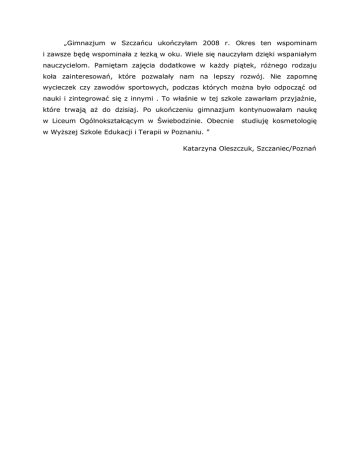 „Gimnazjum w Szczańcu ukończyłam 2008 r. Okres ten wspominam i zawsze będę wspominała z łezką w oku. Wiele się nauczyłam dzięki wspaniałym nauczycielom. Pamiętam zajęcia dodatkowe w każdy piątek, różnego rodzaju koła zainteresowań, które pozwalały nam na lepszy rozwój. Nie zapomnę wycieczek czy zawodów sportowych, podczas których można było odpocząć od nauki i zintegrować się z innymi . To właśnie w tej szkole zawarłam przyjaźnie, które trwają aż do dzisiaj. Po ukończeniu gimnazjum kontynuowałam naukę w Liceum Ogólnokształcącym w Świebodzinie. Obecnie studiuję kosmetologię w Wyższej Szkole Edukacji i Terapii w Poznaniu. ” Katarzyna Oleszczuk, Szczaniec/Poznań