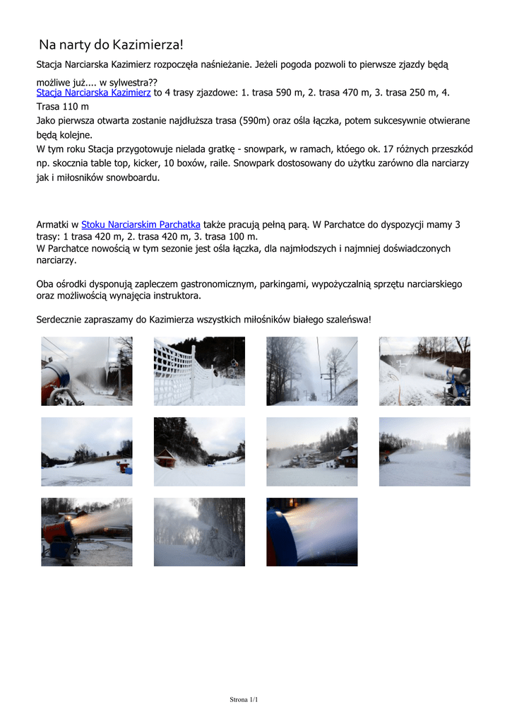 Na narty do Kazimierza! Stacja Narciarska Kazimierz rozpoczęła naśnieżanie. Jeżeli pogoda pozwoli to pierwsze zjazdy będą możliwe już.... w sylwestra?? Stacja Narciarska Kazimierz to 4 trasy zjazdowe: 1. trasa 590 m, 2. trasa 470 m, 3. trasa 250 m, 4. Trasa 110 m Jako pierwsza otwarta zostanie najdłuższa trasa (590m) oraz ośla łączka, potem sukcesywnie otwierane będą kolejne. W tym roku Stacja przygotowuje nielada gratkę - snowpark, w ramach, któego ok. 17 różnych przeszkód np. skocznia table top, kicker, 10 boxów, raile. Snowpark dostosowany do użytku zarówno dla narciarzy jak i miłosników snowboardu. Armatki w Stoku Narciarskim Parchatka także pracują pełną parą. W Parchatce do dyspozycji mamy 3 trasy: 1 trasa 420 m, 2. trasa 420 m, 3. trasa 100 m. W Parchatce nowością w tym sezonie jest ośla łączka, dla najmłodszych i najmniej doświadczonych narciarzy. Oba ośrodki dysponują zapleczem gastronomicznym, parkingami, wypożyczalnią sprzętu narciarskiego oraz możliwością wynajęcia instruktora. Serdecznie zapraszamy do Kazimierza wszystkich miłośników białego szaleńswa! Strona 1/1 Powered by TCPDF (www.tcpdf.org)