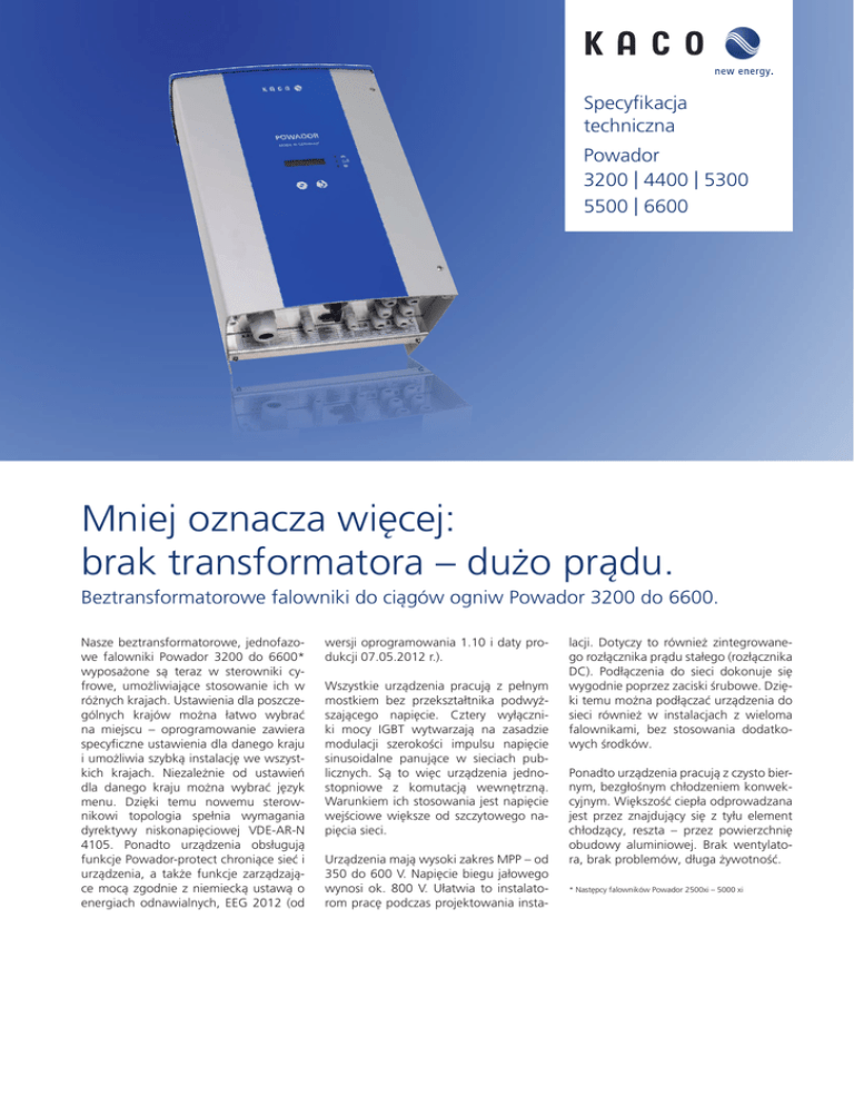 Specyfikacja techniczna Powador 3200 | 4400 | 5300 5500 | 6600 Mniej oznacza więcej: brak transformatora – dużo prądu. Beztransformatorowe falowniki do ciągów ogniw Powador 3200 do 6600. Nasze beztransformatorowe, jednofazowe falowniki Powador 3200 do 6600* wyposażone są teraz w sterowniki cyfrowe, umożliwiające stosowanie ich w różnych krajach. Ustawienia dla poszczególnych krajów można łatwo wybrać na miejscu – oprogramowanie zawiera specyficzne ustawienia dla danego kraju i umożliwia szybką instalację we wszystkich krajach. Niezależnie od ustawień dla danego kraju można wybrać język menu. Dzięki temu nowemu sterownikowi topologia spełnia wymagania dyrektywy niskonapięciowej VDE-AR-N 4105. Ponadto urządzenia obsługują funkcje Powador-protect chroniące sieć i urządzenia, a także funkcje zarządzające mocą zgodnie z niemiecką ustawą o energiach odnawialnych, EEG 2012 (od wersji oprogramowania 1.10 i daty produkcji 07.05.2012 r.). Wszystkie urządzenia pracują z pełnym mostkiem bez przekształtnika podwyższającego napięcie. Cztery wyłączniki mocy IGBT wytwarzają na zasadzie modulacji szerokości impulsu napięcie sinusoidalne panujące w sieciach publicznych. Są to więc urządzenia jednostopniowe z komutacją wewnętrzną. Warunkiem ich stosowania jest napięcie wejściowe większe od szczytowego napięcia sieci. Urządzenia mają wysoki zakres MPP – od 350 do 600 V. Napięcie biegu jałowego wynosi ok. 800 V. Ułatwia to instalatorom pracę podczas projektowania insta- lacji. Dotyczy to również zintegrowanego rozłącznika prądu stałego (rozłącznika DC). Podłączenia do sieci dokonuje się wygodnie poprzez zaciski śrubowe. Dzięki temu można podłączać urządzenia do sieci również w instalacjach z wieloma falownikami, bez stosowania dodatkowych środków. Ponadto urządzenia pracują z czysto biernym, bezgłośnym chłodzeniem konwekcyjnym. Większość ciepła odprowadzana jest przez znajdujący się z tyłu element chłodzący, reszta – przez powierzchnię obudowy aluminiowej. Brak wentylatora, brak problemów, długa żywotność. * Następcy falowników Powador 2500xi – 5000 xi Dane techniczne Powador 3200 | 4400 | 5300 | 5500 | 6600 Dane elektryczne 3200 4400 Maks. zalecana moc generatora fotowoltaicznego 3 200 W 4 400 W Zakres modułów śledzenia MPP 350 V … 600 V 350 V ... 600 V Napięcie stanu jałowego 800 V 800 V Prąd wejściowy maks. 8,6 A 12,0 A Liczba stringów 3 3 Liczba trackerów MPP 1 1 Zabezpieczenie przed zamianą biegunów dioda zwarciowa dioda zwarciowa Moc nominalna 2 600 VA 3 600 VA Napięcie sieciowe 190 V … 264 V 190 V … 264 V Prąd znamionowy 11,3 A 15,6 A Częstotliwość znamionowa 50 Hz 50 Hz cos phi 0,80 indukcyjna ... 0,80 pojemnościowa 0,80 indukcyjna ... 0,80 pojemnościowa Liczba faz zasilających 1 1 Współczynnik sprawności maks. 96,6 % 96,5 % Europejski współczynnik sprawności 95,8 % 95,9 % Zużycie własne: Wyłączenie nocne 0W 0W Konfiguracja obwodu niezależny, beztransformatorowy niezależny, beztransformatorowy Monitorowanie VDE V 0126-1-1:2006+E A1:2011*, VDE AR-N 4105 VDE V 0126-1-1:2006+E A1:2011*, VDE AR-N 4105 Wyświetlacz LCD 2 x 16 znaków LCD 2 x 16 znaków Elementy obsługi 2 przyciski do obsługi wyświetlacza 2 przyciski do obsługi wyświetlacza Porty RS232 / RS485, wyjście S0 RS232 / RS485, wyjście S0 Przekaźnik sygnału błędu Zestyk bezpotencjałowy maks. 250 V / 1 A Zestyk bezpotencjałowy maks. 250 V / 1 A Złącza Zaciski na płytce drukowanej wewnątrz urządzenia (przekrój maks.: 10 mm²), doprowadzenie kabla przez przepusty kablowe (przepust DC M16, przepust AC M32). Zaciski na płytce drukowanej wewnątrz urządzenia (przekrój maks.: 10 mm²), doprowadzenie kabla przez przepusty kablowe (przepust DC M16, przepust AC M32). Temperatura otoczenia -20 °C ... +60 °C** -20 °C ... +60 °C** Temperaturüberwachung Kühlkörper > 75°C dopasowanie mocy do temperatury, > 85°C wyłączenie > 75°C dopasowanie mocy do temperatury, > 85°C wyłączenie Chłodzenie konwekcja swobodna / bez wentylatora konwekcja swobodna / bez wentylatora Rodzaj ochrony IP54 IP54 Emisja hałasu < 35 dB (A) (bezgłośna) < 35 dB (A) (bezgłośna) Włącznik DC zintegrowany zintegrowany Obudowa aluminium aluminium Wys. x szer. x głęb. 500 x 340 x 200 mm 550 x 340 x 220 mm Masa 19 kg 21 kg Parametry wejściowe Parametry wyjściowe Ogólne dane elektryczne Konstrukcja mechaniczna * Monitoring 1-fazowy jako standard, monitoring 3-fazowy konfigurowany z menu ** Spadek mocy przy wzroście temperatury otoczenia. 5300 5500 6600 5 300 W 5 500 W 6 600 W 350 V … 600 V 350 V … 600 V 350 V ... 600 V 800 V 800 V 800 V 14,5 A 15,2 A 18,0 A 3 3 3 1 1 1 dioda zwarciowa dioda zwarciowa dioda zwarciowa 4 400 VA 4 600 VA 5 500 VA 190 V … 264 V 190 V … 264 V 190 V … 264 V 19,1 A 20,0 A 23,9 A 50 Hz 50 Hz 50 Hz 0,80 indukcyjna ... 0,80 pojemnościowa 0,80 indukcyjna ... 0,80 pojemnościowa 0,80 indukcyjna ... 0,80 pojemnościowa 1 1 1 96,4 % 96,3 % 96,3 % 95,8 % 95,7 % 95,8 % 0W 0W 0W niezależny, beztransformatorowy selbstgeführt, trafolos niezależny, beztransformatorowy VDE V 0126-1-1:2006+E A1:2011*, VDE AR-N 4105 VDE V 0126-1-1:2006+E A1:2011*, VDE AR-N 4105 VDE V 0126-1-1:2006+E A1:2011*, VDE AR-N 4105 LCD 2 x 16 znaków LCD 2 x 16 znaków LCD 2 x 16 znaków 2 przyciski do obsługi wyświetlacza 2 przyciski do obsługi wyświetlacza 2 przyciski do obsługi wyświetlacza RS232 / RS485, wyjście S0 RS232 / RS485, wyjście S0 RS232 / RS485, wyjście S0 Zestyk bezpotencjałowy maks. 250 V / 1 A Zestyk bezpotencjałowy maks. 250 V / 1 A Zestyk bezpotencjałowy maks. 250 V / 1 A Zaciski na płytce drukowanej wewnątrz urządzenia (przekrój maks.: 10 mm²), doprowadzenie kabla przez przepusty kablowe (przepust DC M16, przepust AC M32). Zaciski na płytce drukowanej wewnątrz urządzenia (przekrój maks.: 10 mm²), doprowadzenie kabla przez przepusty kablowe (przepust DC M