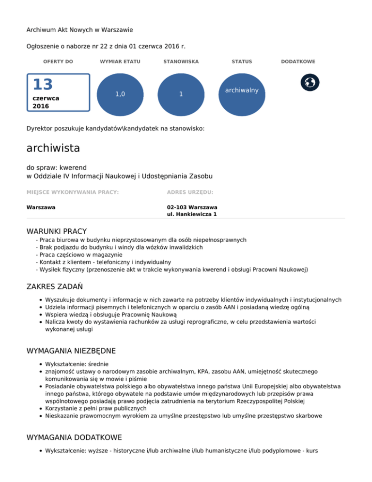 Archiwum Akt Nowych w Warszawie Ogłoszenie o naborze nr 22 z dnia 01 czerwca 2016 r. OFERTY DO 13 czerwca 2016 WYMIAR ETATU STANOWISKA 1,0 1 STATUS DODATKOWE archiwalny Dyrektor poszukuje kandydatów\kandydatek na stanowisko: archiwista do spraw: kwerend w Oddziale IV Informacji Naukowej i Udostępniania Zasobu MIEJSCE WYKONYWANIA PRACY: ADRES URZĘDU: Warszawa 02-103 Warszawa ul. Hankiewicza 1 WARUNKI PRACY - Praca biurowa w budynku nieprzystosowanym dla osób niepełnosprawnych - Brak podjazdu do budynku i windy dla wózków inwalidzkich - Praca częściowo w magazynie - Kontakt z klientem - telefoniczny i indywidualny - Wysiłek fizyczny (przenoszenie akt w trakcie wykonywania kwerend i obsługi Pracowni Naukowej) ZAKRES ZADAŃ Wyszukuje dokumenty i informacje w nich zawarte na potrzeby klientów indywidualnych i instytucjonalnych Udziela informacji pisemnych i telefonicznych w oparciu o zasób AAN i posiadaną wiedzę ogólną Wspiera wiedzą i obsługuje Pracownię Naukową Nalicza kwoty do wystawienia rachunków za usługi reprograficzne, w celu przedstawienia wartości wykonanej usługi WYMAGANIA NIEZBĘDNE Wykształcenie: średnie znajomość ustawy o narodowym zasobie archiwalnym, KPA, zasobu AAN, umiejętność skutecznego komunikowania się w mowie i piśmie Posiadanie obywatelstwa polskiego albo obywatelstwa innego państwa Unii Europejskiej albo obywatelstwa innego państwa, którego obywatele na podstawie umów międzynarodowych lub przepisów prawa wspólnotowego posiadają prawo podjęcia zatrudnienia na terytorium Rzeczypospolitej Polskiej Korzystanie z pełni praw publicznych Nieskazanie prawomocnym wyrokiem za umyślne przestępstwo lub umyślne przestępstwo skarbowe WYMAGANIA DODATKOWE Wykształcenie: wyższe - historyczne i/lub archiwalne i/lub humanistyczne i/lub podyplomowe - kurs kancelaryjno - archiwalny umiejetność pracy w zepole , odporność na stres DOKUMENTY I OŚWIADCZENIA NIEZBĘDNE Życiorys/CV i list motywacyjny Kopie dokumentów potwierdzających spełnienie wymagania niezbędnego w zakresie wykształcenia Zaświadczenie o ukończeniu kursu kancelaryjno-archiwalnego Oświadczenie o posiadanym obywatelstwie albo kopia dokumentu potwierdzającego posiadane obywatelstwo W przypadku osób nieposiadających obywatelstwa polskiego - kopia dokumentu potwierdzającego znajomość języka polskiego zgodnie z rozporządzeniem Prezesa Rady Ministrów w sprawie określenia rodzajów dokumentów potwierdzających znajomość języka polskiego przez osoby nieposiadające obywatelstwa polskiego, ubiegające się o zatrudnienie w służbie cywilnej Oświadczenie o wyrażeniu zgody na przetwarzanie danych osobowych do celów naboru Oświadczenie o korzystaniu z pełni praw publicznych Oświadczenie o nieskazaniu prawomocnym wyrokiem za umyślne przestępstwo lub umyślne przestępstwo skarbowe DOKUMENTY I OŚWIADCZENIA DODATKOWE zaświadczenie o ukończeniu kursu kancelaryjno - archiwalnego TERMINY I MIEJSCE SKŁADANIA DOKUMENTÓW Dokumenty należy złożyć do: 13 czerwca 2016 r. Decyduje data: wpływu oferty do urzędu Miejsce składania dokumentów: Archiwum Akt Nowych 02-103 Warszawa ul. Hankiewicza 1 Kancelaria pok. 101 w godz. 8.15 - 16.15. od poniedziałku do piątku. INNE INFORMACJE: W miesiącu poprzedzającym datę upublicznienia ogłoszenia wskaźnik zatrudnienia osób niepełnosprawnych w urzędzie, w rozumieniu przepisów o rehabilitacji zawodowej i społecznej oraz zatrudnianiu osób niepełnosprawnych, wynosi co najmniej 6%. AAN jest pracodawcą równych szans i wszystkie aplikacje są rozważane z równą uwagą bez względu na pleć, wiek, niepełnosprawność, rasę, narodowość, przekonania polityczne , przynależność związkową, pochodzenie etniczne, wyznanie, orientację seksualną czy też jakąkolwiek inną cechę prawnie chronioną. Dokumenty należy składać w zamkniętych kopertach z dopiskiem "archiwista ds kwerend" wraz z podaniem nr ogłoszenia. Oferty nie spełniające wymogów formalnych, złożone po terminie oraz nie zawierające jednoznacznego wskazania stanowiska i numeru ogłoszenia, nie będą rozpatrywane. Życiorys, list motywacyjny oraz oświadczenia muszą być własnoręcznie podpisane.. W ofercie należy podać dane kontaktowe: adres e mail, nr telefonu oraz adres do korespondencji. Techniki i metody naboru : I - weryfikacja nadesłanych ofert II - test wiedzy III - rozmowa kwalifikacyjna Kandydaci spełniający wymagania formalne zostaną zakwalifikowani do kolejnego etapu naboru. O terminach etapów naboru kandydaci zostaną powiadomieni telefonicznie. Oferty odrzucone i nie odebrane w terminie 3 miesięcy od dnia zatrudnienia kandydata wyłonionego w drodze naboru, zostaną komisyjnie zniszczone . Dodatkowe informacje można uzyskać pod nr tel. 22/ 589 31 06 w godz. 8. 15 - 15. 15 Legenda Pierwszeństwo dla osób z niepełnosprawnościami Ogłoszenie z tym symbolem oznacza, że pierwszeństwo w zatrudnieniu mają osoby z niepełnosprawnościami, które spełniają wszystkie następujące warunki: • złożyły w terminie ofertę wraz z dokumentem potwierdzającym niepełnosprawność, • spełniają warunki wymienione w ogłoszeniu, • po rekrutacji znalazły się w gronie najlepszych kandydatów. Zastępstwo Ogłoszenie z tym symbolem oznacza, że urząd poszukuje kandydatów do pracy na czas przewidywanej nieobecności swojego pracownika. Jeśli w ogłoszeniu nie wskazano okresu zastępstwa, możesz o to spytać w urzędzie. Osoba zatrudniona na zastępstwo jest członkiem korpusu służby cywilnej. Nabór otwarty dla cudzoziemców Ogłoszenie z tym symbolem oznacza, że o stanowisko mogą starać się, poza polskimi obywatelami, również cudzoziemcy. Kandydaci muszą spełniać następujące warunki: • są obywatelami państwa Unii Europejskiej lub innego państwa, którego obywatelom na podstawie umów międzynarodowych lub przepisów prawa wspólnotowego przysługuje prawo podjęcia zatrudnienia na teryt