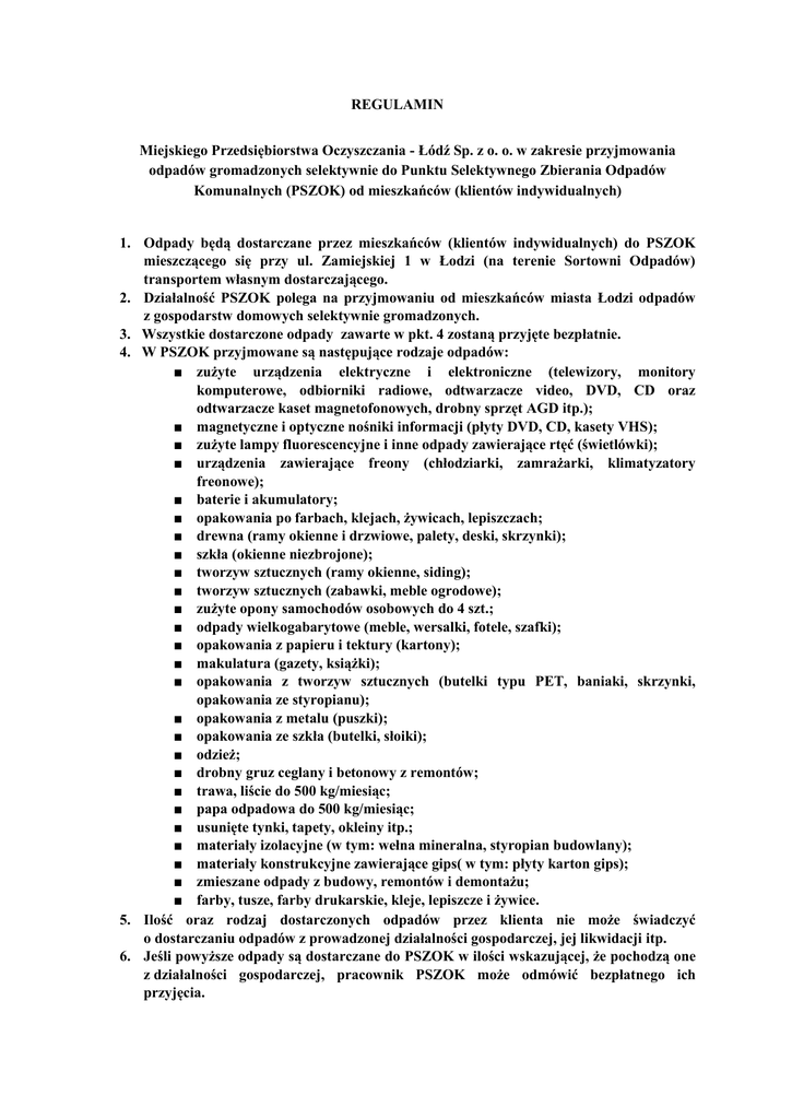 REGULAMIN Miejskiego Przedsiębiorstwa Oczyszczania - Łódź Sp. z o. o. w zakresie przyjmowania odpadów gromadzonych selektywnie do Punktu Selektywnego Zbierania Odpadów Komunalnych (PSZOK) od mieszkańców (klientów indywidualnych) 1. Odpady będą dostarczane przez mieszkańców (klientów indywidualnych) do PSZOK mieszczącego się przy ul. Zamiejskiej 1 w Łodzi (na terenie Sortowni Odpadów) transportem własnym dostarczającego. 2. Działalność PSZOK polega na przyjmowaniu od mieszkańców miasta Łodzi odpadów z gospodarstw domowych selektywnie gromadzonych. 3. Wszystkie dostarczone odpady zawarte w pkt. 4 zostaną przyjęte bezpłatnie. 4. W PSZOK przyjmowane są następujące rodzaje odpadów: ■ zużyte urządzenia elektryczne i elektroniczne (telewizory, monitory komputerowe, odbiorniki radiowe, odtwarzacze video, DVD, CD oraz odtwarzacze kaset magnetofonowych, drobny sprzęt AGD itp.); ■ magnetyczne i optyczne nośniki informacji (płyty DVD, CD, kasety VHS); ■ zużyte lampy fluorescencyjne i inne odpady zawierające rtęć (świetlówki); ■ urządzenia zawierające freony (chłodziarki, zamrażarki, klimatyzatory freonowe); ■ baterie i akumulatory; ■ opakowania po farbach, klejach, żywicach, lepiszczach; ■ drewna (ramy okienne i drzwiowe, palety, deski, skrzynki); ■ szkła (okienne niezbrojone); ■ tworzyw sztucznych (ramy okienne, siding); ■ tworzyw sztucznych (zabawki, meble ogrodowe); ■ zużyte opony samochodów osobowych do 4 szt.; ■ odpady wielkogabarytowe (meble, wersalki, fotele, szafki); ■ opakowania z papieru i tektury (kartony); ■ makulatura (gazety, książki); ■ opakowania z tworzyw sztucznych (butelki typu PET, baniaki, skrzynki, opakowania ze styropianu); ■ opakowania z metalu (puszki); ■ opakowania ze szkła (butelki, słoiki); ■ odzież; ■ drobny gruz ceglany i betonowy z remontów; ■ trawa, liście do 500 kg/miesiąc; ■ papa odpadowa do 500 kg/miesiąc; ■ usunięte tynki, tapety, okleiny itp.; ■ materiały izolacyjne (w tym: wełna mineralna, styropian budowlany); ■ materiały konstrukcyjne zawierające gips( w tym: płyty karton gips); ■ zmieszane odpady z budowy, remontów i demontażu; ■ farby, tusze, farby drukarskie, kleje, lepiszcze i żywice. 5. Ilość oraz rodzaj dostarczonych odpadów przez klienta nie może świadczyć o dostarczaniu odpadów z prowadzonej działalności gospodarczej, jej likwidacji itp. 6. Jeśli powyższe odpady są dostarczane do PSZOK w ilości wskazującej, że pochodzą one z działalności gospodarczej, pracownik PSZOK może odmówić bezpłatnego ich przyjęcia. 7. Odpady wymagające opakowania powinny znajdować się w szczelnych (niecieknących) i nieuszkodzonych opakowaniach oraz posiadać oryginalną informację (etykietę) umożliwiającą identyfikację odpadu w chwili przekazania. 8. Dostarczone odpady muszą być posortowane rodzajowo wg punktu 4 niniejszego Regulaminu. 9. a) b) c) d) e) f) PSZOK nie przyjmuje takich odpadów jak: materiały zawierające azbest, szyb samochodowych, szkła zbrojonego i hartowanego, odpady nieoznaczone, bez możliwości wiarygodnej identyfikacji (brak etykiet), odpady w opakowaniach cieknących, kwasy, alkalia, odczynniki fotograficzne. 10. Przyjmujący (pracownik MPO - Łódź Sp. z o. o.) odpady, postępuje zgodnie z poniższymi wytycznymi: ■ podczas przyjmowania odpadu pracownik PSZOK jest zobligowany do sprawdzenia czy osoba oddająca odpad jest mieszkańcem Łodzi. Weryfikacja następuje m.in. poprzez sprawdzenie rejestracji pojazdu przywożącego odpad lub dowodu tożsamości; ■ odpady przywożone przez mieszkańców dostarczane są na paletę dostaw lub w inne miejsce przeznaczone do gromadzenia odpadów; ■ odpad zostaje zważony na wadze przemysłowej 4B 300 PAN o nośności do 300 kg lub na wadze WSEL - 18/60 przy kontenerze wagowym lub wadze samochodowej; ■ pracownik przyjmując odpady określa je odpowiednim kodem (zgodnie z Rozporządzenie Ministra Środowiska z dnia 9 grudnia 2014r. w sprawie katalogu odpadów Dz.U. 2014 poz. 1923) informacja ta jest wprowadzana do systemu komputerowego; ■ odpady zostają segregowane przez pracowników PSZOK w celu wyodrębnienia jak największej ilości materiału nadającego się do odzysku; ■ odpad zostaje przewieziony wózkiem widłowym przez pracownika do odpowiedniego miejsca magazynowego odpadów zgodnie z klasyfikacją odpadu lub zostaje umieszczony zgodnie z klasyfikacją w odpowiednim kontenerze. Odpady niebezpieczne będą magazynowane w atestowanych pojemnikach umieszczonych na podłożu betonowym; ■ Pracownik PSZOK ma prawo odmówić przyjęcia odpadu, jeśli byłoby to sprzeczne z przepisami prawa oraz mogłoby zagrażać zdrowiu lub życiu ludzi; ■ Pracownicy PSZOK nie wyjmują przywiezionych odpadów z pojazdu, wskazują miejsce, gdzie należy je donieść i w którym pojemniku, koszu umieścić. 11. Przyjęte odpady, po zmagazynowaniu odpowiedniej ilości, zostaną zagospodarowane wg obowiązujących przepisów prawnych. 12. Działalność PSZOK prowadzona będzie w dni robocze od poniedziałku do piątku w godzinach 700 -1800 z wyjątkiem wtorku 700 -2000 oraz w soboty w godzinach 700 - 1300. 13. Zakazuje się wstępu klientów na teren sortowni poza wyznaczony obszar. 14. Wszystkie przyjęte odpady muszą być magazynowane zgodnie z wytycznymi zapisanymi w Decyzji Nr 33/U/08, która jest integralną częścią poniższego Regulaminu oraz na podstawie Decyzji Nr 57/Op/13 wraz z Decyzjami zmieniającymi nr 195/Op/2013 i nr 201/Op/2013. 15. Niniejszy Regulamin nie dotyczy osób prawnych tj. przedsiębiorców prowadzących działalność gospodarczą, którzy są zobowiązani do stosowania Ustawy o odpadach z dnia 2 14 grudnia 2012r. (Dz.U.2013.21 z późniejszymi zmianami) w zakresie zagospodarowania odpadów powstałych w wyniku prowadzenia tej działalności. 16. Niniejszy regulamin wchodzi w życie z dniem 07.12.2015r 2