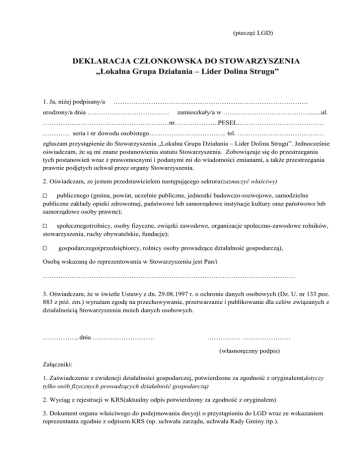 (pieczęć LGD) DEKLARACJA CZŁONKOWSKA DO STOWARZYSZENIA „Lokalna Grupa Działania – Lider Dolina Strugu” 1. Ja, niżej podpisany/a ……………………………………………………………………………. urodzony/a dnia ………………………………. zamieszkały/a w ………………………………….......ul. …………………………………………………nr………………..PESEL………………………………… ………… seria i nr dowodu osobistego…………………………….. tel. ………………………………… zgłaszam przystąpienie do Stowarzyszenia „Lokalna Grupa Działania – Lider Dolina Strugu”. Jednocześnie oświadczam, że są mi znane postanowienia statutu Stowarzyszenia. Zobowiązuje się do przestrzegania tych postanowień wraz z prawomocnymi i podanymi mi do wiadomości zmianami, a także przestrzegania prawnie podjętych uchwał przez organy Stowarzyszenia. 2. Oświadczam, ze jestem przedstawicielem następującego sektora(zaznaczyć właściwy) publicznego (gmina, powiat, uczelnie publiczne, jednostki badawczo-rozwojowe, samodzielne publiczne zakłady opieki zdrowotnej, państwowe lub samorządowe instytucje kultury oraz państwowe lub samorządowe osoby prawne); społecznego(rolnicy, osoby fizyczne, związki zawodowe, organizacje społeczno-zawodowe rolników, stowarzyszenia, ruchy obywatelskie, fundacje); gospodarczego(przedsiębiorcy, rolnicy osoby prowadzące działalność gospodarczą), Osobą wskazaną do reprezentowania w Stowarzyszeniu jest Pan/i …………………………………………………………………………………………………… 3. Oświadczam, że w świetle Ustawy z dn. 29.08.1997 r. o ochronie danych osobowych (Dz. U. nr 133 poz. 883 z póź. zm.) wyrażam zgodę na przechowywanie, przetwarzanie i publikowanie dla celów związanych z działalnością Stowarzyszenia moich danych osobowych. ……………, dnia ………………………. …………… …………………. (własnoręczny podpis) Załączniki: 1. Zaświadczenie z ewidencji działalności gospodarczej, potwierdzone za zgodność z oryginałem(dotyczy tylko osób fizycznych prowadzących działalność gospodarczą) 2. Wyciąg z rejestracji w KRS(aktualny odpis potwierdzony za zgodność z oryginałem) 3. Dokument organu właściwego do podejmowania decyzji o przystąpieniu do LGD wraz ze wskazaniem reprezentanta zgodnie z odpisem KRS (np. uchwała zarządu, uchwała Rady Gminy itp.). Oświadczenie Oświadczam, że zamieszkuję/ jestem zameldowany albo prowadzę działalność na terenie objętym Lokalną Strategią Rozwoju Gmin Doliny Strugu. Imię i nazwisko Pełny adres Podpis czytelny Data