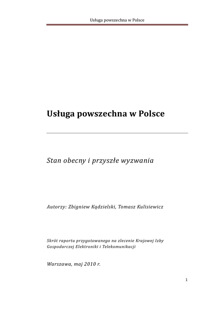 Usługa powszechna w Polsce Usługa powszechna w Polsce Stan obecny i przyszłe wyzwania Autorzy: Zbigniew Kądzielski, Tomasz Kulisiewicz Skrót raportu przygotowanego na zlecenie Krajowej Izby Gospodarczej Elektroniki i Telekomunikacji Warszawa, maj 2010 r. 1 Usługa powszechna w Polsce 1. Definicja i cele usługi powszechnej 3 2. Modele finansowania UP 4 3. Zakres i stan usługi powszechnej w UE 5 4. Stan usługi powszechnej w Polsce 7 4.1. Stopień realizacji istotnych elementów UP 8 4.2. Rozliczenie dopłaty do kosztów świadczenia UP 11 5. Czy usługa powszechna osiągnęła oczekiwane cele? 11 6. Usługa powszechna w najbliższej przyszłości – cele i wyzwania 14 7. Wnioski 17 8. Scenariusze 19 2 Usługa powszechna w Polsce 1. Definicja i cele usługi powszechnej Według dyrektywy Parlamentu Europejskiego i Rady 2002/22/WE (znowelizowanej dyrektywą 2009/136/WE) „fundamentalnym wymogiem usługi powszechnej jest zapewnienie użytkownikom, na życzenie, podłączenia do publicznej sieci telefonicznej w oznaczonym miejscu, po przystępnej cenie.” Minimalny zestaw usług określonej jakości ma być dostarczany użytkownikom „po cenie przystępnej w świetle konkretnych warunków krajowych, bez naruszania konkurencji.” Usługa powszechna (UP) może być dostarczana zarówno przy użyciu technologii przewodowych, jak i bezprzewodowych, jeśli tylko spełniają określone wymagania techniczne łącza wąskopasmowego. Do świadczenia różnych składników usługi powszechnej (UP) mogą być wyznaczane różni operatorzy lub ich zespoły, przy czym różni operatorzy mogą być obowiązani do pokrycia zasięgiem UP różnych części obszaru kraju. Do zakresu UP należy przesyłanie danych „z szybkościami pozwalającymi na funkcjonalny dostęp do Internetu, biorąc pod uwagę przeważające technologie wykorzystywane przez większość abonentów oraz technologiczne możliwości zastosowań”. Dyrektywa zobowiązuje operatorów wyznaczonych do świadczenia UP do zapewnienia usług biura numerów i spisów abonentów, zaś osobom niepełnosprawnym – równoważnego dostępu do usług wchodzących w skład UP. Możliwość nakładania obowiązków udostępnienia aparatów publicznych, określania ich pokrycia geograficznego i liczby oraz dostępności tych urządzeń i punktów dostępu do łączności dla osób niepełnosprawnych pozostawiono regulatorom krajowym, dając im także swobodę nienakładania takich obowiązków (na obszarze całego kraju lub jego części), jeśli usługi takie lub porównywalne są dostatecznie szeroko dostępne. Finansową dostępność UP wolno wspierać przy użyciu taryf socjalnych lub w inny sposób. Dyrektywa określa też uprawnienia krajowych regulatorów do określania i monitorowania parametrów jakościowych UP, a także do określania kosztów świadczenia usług powszechnej i zasad jej finansowania. 3 Usługa powszechna w Polsce 2. Modele finansowania UP Telekomunikacyjna usługa powszechna określana jest w systemach prawnych oraz dokumentach organizacji międzynarodowych (m.in. UE, OECD) w kategorii „usług świadczonych w ogólnym interesie gospodarczym” (SGEI – Service of General Economic Interest), których waga w gospodarce i społeczeństwie uzasadnia możliwość i dopuszczalność stosowania pomocy publicznej przy zachowaniu określonych warunków. Usługi świadczone w ogólnym interesie gospodarczym występują głównie w sektorach transportu, poczty, telekomunikacji oraz energii, zasadniczo dla odbiorców indywidualnych (konsumentów) i mogą być subsydiowane w interesie społecznym. Według dyrektywy o usłudze powszechnej dofinansowanie UP możliwe jest wtedy, gdy obowiązek świadczenia usługi powszechnej stanowi nieuzasadnione obciążenie dla operatora świadczącego usługę, dofinansowanie jest konieczne i zostanie to wykazane przez operatora. Dyrektywa pozostawia krajom członkowskim swobodę decyzji, które składniki UP będą dofinansowywane i z jakich źródeł. Finansowane mogą być wszystkie koszty netto lub tylko niektóre składniki, finansowanie może pochodzić z opodatkowania operatorów (z ich wpłat) lub z budżetu. W praktyce stosowane są dwa modele finansowania usługi powszechnej: • bezpośrednie subsydia budżetowe (np. w Kanadzie, do 2000 r. we Francji, od nowelizacji z marca 2010 r. w Czechach), • finansowanie z wydzielonego funduszu usługi powszechnej (większość krajów UE, EOG i OECD, kraje Ameryki Łacińskiej, kraje rozwijające się). W przypadku wydzielonego funduszu UP źródłami finansowania są: • wpłaty budżetowe, • wpłaty na fundusz UP od operatorów (i ogólniej: od przedsiębiorców telekomunikacyjnych), przeważnie wyliczane jako określony procent ich przychodów netto z roku poprzedzającego wpłatę, • inne źródła regulacyjne, np. opłaty koncesyjne i licencyjne, opłaty za przydziały lub wykorzystywanie częstotliwości, puli numeracyjnej, kwoty wylicytowane na przetargach i konkursach itp. – przy czym zazwyczaj są to wpłaty od wszystkich operatorów, ale są też systemy, w których 4 Usługa powszechna w Polsce wpłaty pochodzą tylko od operatorów niezobowiązanych (np. Francja, Węgry), • specjalne dotacje o charakterze jednorazowym czy okazjonalnym (np. w ramach programów międzynarodowych Banku Światowego). Często stosowany jest schemat mieszany, w którym taryfy socjalne, usługi dodatkowe dla osób niepełnosprawnych, utrzymywanie systemów informacyjnych (wydawanie książek, usługi biura numerów) finansowane są budżetu, natomiast usługi o charakterze technicznym, związane z infrastrukturą sieciową i jej rozbudową finansowane są z wpłat do funduszu pobieranych od operatorów (kompensacja kosztów budowy łączy na terenach trudnych technicznie lub zamieszkałych przez populację o niskich przychodach). Warto zwrócić uwagę na zmianę systemu w Czechach, w których nowelizacja z marca 2010 r. ustawy o komunik