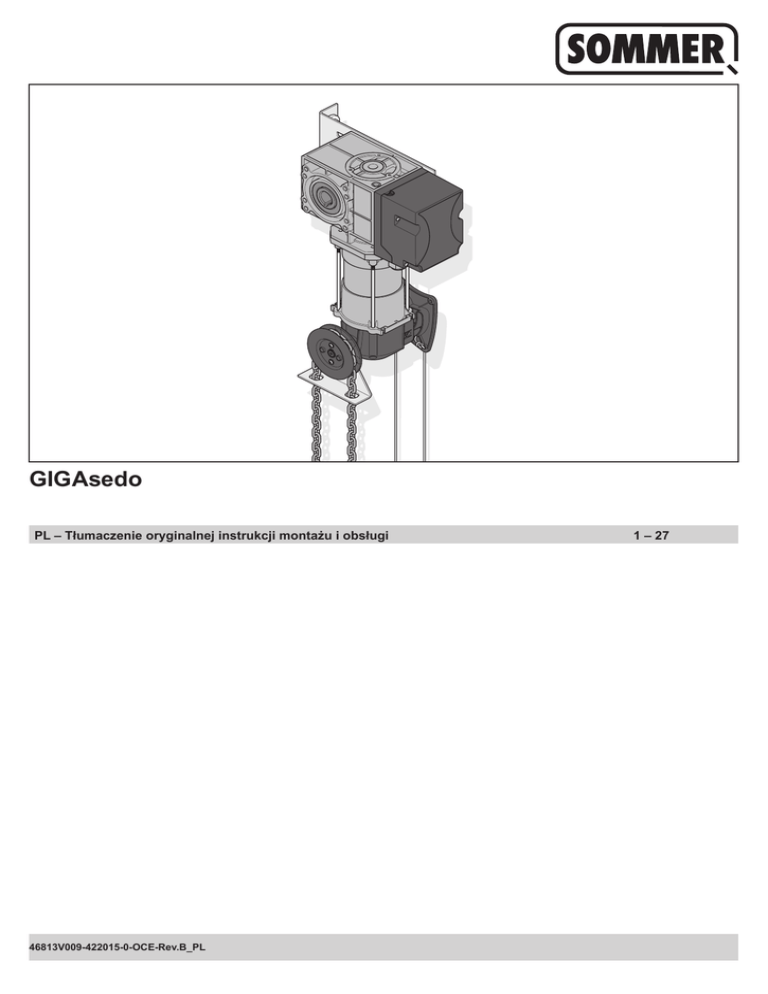 GIGAsedo PL – Tłumaczenie oryginalnej instrukcji montażu i obsługi 46813V009-422015-0-OCE-Rev.B_PL 1 – 27 Spis treści Informacje ogólne........................................................... 3 Eksploatacja/obsługa................................................... 25 Symbole............................................................................................ 3 Odblokowanie awaryjne.................................................................. 25 Wskazówki dotyczące bezpieczeństwa............................................ 3 Konserwacja i czyszczenie.......................................... 26 Zastosowanie zgodne z przeznaczeniem......................................... 3 Wskazówki dotyczące bezpieczeństwa.......................................... 26 Oznaczenia typu............................................................................... 4 Regularne kontrole.......................................................................... 26 GIGAsedo do sterowania w trybie automatycznym.............................................................. 5 Konserwacja i kontrola dodatkowa.................................................. 26 Pozostałe informacje................................................... 27 Dane techniczne............................................................................... 5 Demontaż........................................................................................ 27 Wymiary montażowe......................................................................... 5 Złomowanie bramy.......................................................................... 27 Rysunki wymiarowe.......................................................................... 6 GIGAsedo do sterowania w trybie automatycznym przez falownik..................................... 8 Dane techniczne............................................................................... 8 GIGAsedo do sterowania w trybie automatycznym przez falownik..................................... 9 Rysunki wymiarowe.......................................................................... 9 Wymiary montażowe....................................................................... 10 GIGAsedo do sterowania w trybie automatycznym przez falownik................................... 10 GIGAsedo ze zintegrowanym sterowaniem w trybie Totmann ..........................................................11 Dane techniczne..............................................................................11 GIGAsedo ze zintegrowanym sterowaniem w trybie Totmann ......................................................... 12 Rysunki wymiarowe........................................................................ 12 Wymiary montażowe....................................................................... 13 GIGAsedo ze zintegrowanym sterowaniem w trybie Totmann ......................................................... 13 Deklaracja włączenia.................................................... 14 Przygotowania do montażu......................................... 15 Wskazówki dotyczące bezpieczeństwa.......................................... 15 Środki ochrony osobistej................................................................. 15 Wyważenie...................................................................................... 15 Statyczny moment trzymający........................................................ 15 Zakres dostawy............................................................................... 15 Montaż........................................................................... 16 Wskazówki dotyczące bezpieczeństwa.......................................... 16 Wskazówki dotyczące montażu...................................................... 17 Nakładanie napędu i montaż podpór równoważących moment obrotowy............................................................................ 17 Ustawianie systemu z łańcuchem awaryjnym................................. 17 Linki do awaryjnego przełączania ręcznego................................... 17 Przedłużanie albo skracanie łańcucha w napędzie........................ 18 Mocowanie tabliczek informacyjnych na napędzie......................... 18 Podłączenie do sieci elektrycznej .................................................. 19 Podłączanie cyfrowego wyłącznika krańcowego (enkodera).......... 20 Montaż i podłączenie sterownika.................................................... 21 Podłączenie elementów zabezpieczających i wyposażenia........... 21 Falownik........................................................................ 22 Dane techniczne (falownik)............................................................. 22 Montaż i podłączenie sterownika.................................................... 23 Podłączenie elementów zabezpieczających i wyposażenia........... 23 Uruchomienie............................................................... 24 Wskazówki dotyczące bezpieczeństwa.......................................... 24 Kontrola kierunku ruchu.................................................................. 24 Ustawianie pozycji krańcowych i wyłączników krańcowych............ 24 2 Informacje ogólne Symbole ¾¾ Przed rozpoczęciem pracy przy bramie lub napędzie zawsze odłączyć sterownik i napęd od napięcia i zabezpieczyć przed mimowolnym włączeniem. ZNAK OSTRZEGAWCZY: Wskazuje na grożące niebezpieczeństwo! W przypadku nieprzestrzegania może dojść do ciężkich obrażeń ciała, śmierci lub strat materialnych! ¾¾ W żadnym przypadku nie uruchamiać uszkodzonego napędu. ¾¾ Stosować tylko oryginalne części zamienne i akcesoria pochodzące od producenta napędu. Wskazówki dotyczące składowania ZNAK INFORMACYJNY: Informacja, praktyczna wskazówka! ¾¾ Napęd można przechowywać tylko w pomieszczeniach zamkniętych i suchych w temperaturze od –20 °C do +50 