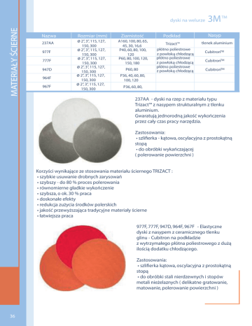MATERIAŁY ŚCIERNE dyski na welurze Nazwa 237AA 977F 777F 947D 964F 967F Rozmiar (mm) ø 2’’, 3’’, 115, 127, 150, 300 ø 2’’, 3’’, 115, 127, 150, 300 ø 2’’, 3’’, 115, 127, 150, 300 ø 2’’, 3’’, 115, 127, 150, 300 ø 2’’, 3’’, 115, 127, 150, 300 ø 2’’, 3’’, 115, 127, 150, 300 Ziarnistość A160, 100, 80, 65, 45, 30, 16,6 P40, 60, 80, 100, 120 P60, 80, 100, 120, 150, 180 P60, 80 Podkład Trizact™ płótno poliestrowe z powłoką chłodzącą płótno poliestrowe z powłoką chłodzącą płótno poliestrowe z powłoką chłodzącą 3M TM Nasyp tlenek aluminium CubitronTM CubitronTM CubitronTM P36, 40, 60, 80, 100, 120 P36, 60, 80, 237AA - dyski na rzep z materiału typu Trizact™ z nasypem strukturalnym z tlenku aluminium. Gwaratują jednorodną jakość wykończenia przez cały czas pracy narzędzia. Zastosowania: • szlifierka - kątowa, oscylacyjna z prostokątną stopą • do obróbki wykańczającej ( polerowanie powierzchni ) Korzyści wynikające ze stosowania materiału ściernego TRIZACT : • szybkie usuwanie drobnych zarysowań • szybszy - do 80 % proces polerowania • równomierne gładkie wykończenie • szybsza, o ok. 30 % praca • doskonałe efekty • redukcja zużycia środków polerskich • jakość przewyższająca tradycyjne materiały ścierne • łatwiejsza praca 977F, 777F, 947D, 964F, 967F - Elastyczne dyski z nasypem z ceramicznego tlenku glinu - Cubitron na podkładzie z wytrzymałego płótna poliestrowego z dużą ilością dodatku chłodzącego. Zastosowania: • szlifierka kątowa, oscylacyjna z prostokątną stopą • do obróbki stali nierdzewnych i stopów metali nieżelaznych ( delikatne gratowanie, matowanie, polerowanie powierzchni ) 36 dyski na welurze 1815 siatop Rozmiar (mm) Ziarnistość Ilość otworów 115 P24 – P120 bez otworów 125 P24 – P120 bez otworów 150 P24 – P120 bez otworów 180 P24 – P120 bez otworów 200 P24 – P120 bez otworów Podkład fibra 0.38mm / papier typu f fibra 0.38mm / papier typu f fibra 0.38mm / papier typu f fibra 0.38mm / papier typu f fibra 0.38mm / papier typu f Sia TM Nasyp tlenek aluminium tlenek aluminium tlenek aluminium tlenek aluminium tlenek aluminium • Wysoka agresywność przy niskim docisku podczas pracy na szlifierkach rotacyjnych • Łatwa i szybka wymiana krążka dzięki rzepowemu systemowi siafast • Alternatywa kosztowa do krążków fibrowych • Do pracy na sucho przy obróbce wszelkich metali Zastosowania • Do szlifowania stali czarnej, nierdzewnej, aluminium i tytanu • Od szlifu zgrubnego do ostatecznego • Wyrównywanie powierzchni • Usuwanie zadziorów • Usuwanie rdzy • Obróbka spawów i zgrzewów 1815 siatop jest przystosowany do zbierania dużych nadmiarów dzięki zastosowaniu specjalnego ziarna, spoiwa i dodatków chłodzących. Nie wymaga dużych obrotów i docisku, co redukuje przebarwienia na stali nierdzewnej. 37 MATERIAŁY ŚCIERNE Dyski roloc dyski roloc 3MTM System Roloc to unikalny system mocowania ze specjalnym nakręcanym gwintem. Jest on tak zaprojektowany, aby maksymalnie ułatwić pewne mocowanie i łatwe zdejmowanie narzędzia ściernego za pomocą półobrotu w jedną lub drugą stronę. 3M SC-DR Średnica (mm) 50 75 Ziarnistość Kolor A VFN A MED. A CRS S SFN A VFN niebieski czerwony A MED. A CRS S SFN brązowy szary niebieski czerwony brązowy szary Zalecane obroty 25 000 25 000 25 000 25 000 18 000 18 000 18 000 18 000 • Elastyczne dyski z włókniny 3M Surface Conditioning do obróbki wykańczającej • Cechuje je znacznie dłuższa żywotność w porównaniu z tradycyjnymi drobnoziarnistymi materiałami ściernymi • Dzięki przestrzennej konstrukcji nie przegrzewają obrabianych powierzchni • Są świetnym produktem do czyszczenia, usuwania niewielkich defektów i końcowego szlifowania metali 3M SC-DR Zalecane obroty Ziarnistość Kolor 50 A CRS HD (P80) A CRS SD (P50) fioletowy niebieski 25 000 25 000 75 A CRS HD (P80) fioletowy 18 000 A CRS SD (P50) niebieski 18 000 Średnica (mm) • Najagresywniejsze dyski z włókniny Scotch-Brite z ziarnem ceramicznym Cubitron • Pozwalają usunąć niewielkie spawy, a jednocześnie zapewniają delikatne wykończenie powierzchni 38 3M SL-DR Ziarnistość Kolor 50 A CRS HD brązowy ciemny fiolet 75 A CRS HD Średnica (mm) A CRS SD A CRS SD Zalecane obroty 25 000 25 000 brązowy 18 000 ciemny fiolet 18 000 • Dyski z włókniny Surface Conditioning o przedłużonej żywotności i zwiększonej agresywności • Dyski typu SD są agresywniejsze od typu HD 3M SE-DR Średnica (mm) Ziarnistość Kolor Zalecane obroty 50 A CRS A FIN brązowy / niebieski zielony 25000 25000 75 A MED. A CRS A FIN A MED. czerwony brązowy / niebieski zielony 25000 18000 czerwony 18000 18000 • Są szczególnie polecane do zacierania śladów połączeń spawów, jako kolejny krok po materiałach nasypowych. 3M XL-DR Średnica (mm) 50 75 Ziarnistość Kolor 2S FIN 6A MED. 2S FIN szary beżowy szary beżowy 6A MED. Zalecane obroty 22 000 22 000 15 000 15 000 • Dyski o grubości 6 mm • Charakteryzują się długą żywotnością • Zaprojektowane do delikatnego usuwania zadziorów i niewielkich defektów powierzchni 39 MATERIAŁY ŚCIERNE 3M 361F- do obróbki metali Średnica (mm) 50 Ziarnistość P24+ P36+ P60+ P80+ P100+ 75 P120+ P24+ P36+ P60+ P80+ P100+ P120+ Kolor czarny brązowy pomarańczowy żółty niebieski biały czarny brązowy pomarańczowy Zalecane obroty 25000 25000 25000 25000 25000 25000 18000 18000 18000 żółty 18000 niebieski biały 18000 18000 Podkład - poliester Nasyp - elektrokorund • Mogą być używane do obróbki wszystkich metali 3M SC-DR- do obróbki wykańczającej Średnica (mm) 50 75 Ziarnistość Kolor A VFN A MED. A CRS S SFN A VFN niebieski czerwony A MED. A CRS S SFN brązowy szary niebieski czerwony brązowy szary Zalecane obroty 25 000 25 000 25 000 25 000 18 000 18 000 18 000 18 000 • Elastyczne dyski z włókniny 3M 