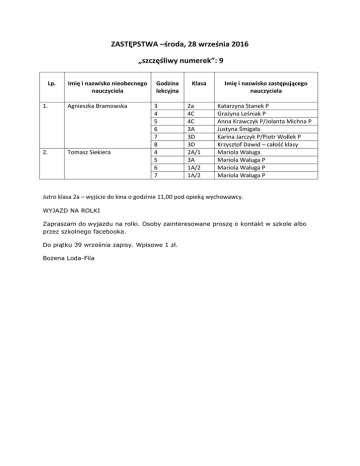 ZASTĘPSTWA –środa, 28 września 2016 „szczęśliwy numerek”: 9 Lp. Imię i nazwisko nieobecnego nauczyciela 1. Agnieszka Bramowska 2. Tomasz Siekiera Godzina lekcyjna 3 4 5 6 7 8 4 5 6 7 Klasa 2a 4C 4C 3A 3D 3D 2A/1 3A 1A/2 1A/2 Imię i nazwisko zastępującego nauczyciela Katarzyna Stanek P Grażyna Leśniak P Anna Krawczyk P/Jolanta Michna P Justyna Śmigała Karina Jarczyk P/Piotr Wollek P Krzysztof Dawid – całość klasy Mariola Waluga Mariola Waluga P Mariola Waluga P Mariola Waluga P Jutro klasa 2a – wyjście do kina o godzinie 11,00 pod opieką wychowawcy. WYJAZD NA ROLKI Zapraszam do wyjazdu na rolki. Osoby zainteresowane proszę o kontakt w szkole albo przez szkolnego facebooka. Do piątku 39 września zapisy. Wpisowe 1 zł. Bożena Loda-Fila