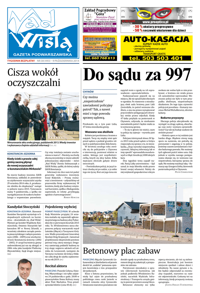 tygodnik BEZPŁATNy NR 38 (493) – 9 października 2014 Cisza wokół oczyszczalni Do sądu za 997 chynów Czy można „niepotrzebnie” zawiadomić policyjny patrol? Tak, a nawet mieć z tego powodu sprawę sądową. Przekonała się o tym pani Lidia, 47-letnia mieszkanka gminy. Wezwano was złośliwie Wmurowanie aktu erekcyjnego, październik 2013. Wtedy inwestor i wykonawca chętnie udzielali informacji (fot. rk) konstancin-jeziorna Kiedy ścieki z prawie całej gminy zaczną płynąć do nowej oczyszczalni w konstancińskim Mirkowie? Na starcie budowy inwestor, SAUR Konstancja, zakładał, że pozwolenie na użytkowanie oczyszczalni uzyska 29 września 2014 roku. A „przekazanie obiektu do eksploatacji” nastąpi w połowie marca 2015. Tymczasem mamy 9 października, a spółka nie wystąpiła jeszcze do nadzoru budowlanego o wspomniane pozwolenie. Czy więc instalacja zostanie uruchomiona w marcu? – Niestety, na chwilę obecną nie jesteśmy w stanie udzielić jednoznacznej odpowiedzi – mówi „Nad Wisłą” Dorota Stelmaszczyk z SAUR Polska, spółki, do której należy SAUR Konstancja. Informacji nie chce nam też podać generalny wykonawca inwestycji, Instal Białystok. – Proszę rozmawiać z inwestorem – usłyszeliśmy od pracownika firmy wykonawczej. W kwietniu, kiedy plac budowy wizytował burmistrz, spółka z Białegostoku zapewniała, że roboty „przebiegają zgodnie z harmonogramem”. Robert Korczak Kandydat Stoczyński Pojedziemy szybciej Konstancin-Jeziorna. Sławomir Stanisław Stoczyński wystartuje w listopadowych wyborach na burmistrza – dowiedziało się „Nad Wisłą”. Wystawi go komitet Wspólnota Konstancińska. Ostatnio Stoczyński był konsulem RP w Nowej Zelandii, a wcześniej członkiem zarządu powiatu piaseczyńskiego i radnym powiatowym (2006 – 2009) oraz wiceburmistrzem Konstancina-Jeziorny (2002 – 2005). O urząd burmistrza gminy uzdrowiskowej już raz się ubiegał, w 2006 roku jako kandydat Platformy Obywatelskiej. Zajął drugie miejsce. (rk) Powiat piaseczyński. W uchwale Rady Ministrów przyjętej 24 września znalazła się zapowiedź ogłoszenia przetargu na budowę ulicy Puławskiej-bis w pierwszym kwartale 2015 roku. Ta 30-kilometrowa szosa ekspresowa połączy warszawski węzeł Lotnisko (Okęcie) z Tarczynem i Grójcem. Wedle przewidywań Generalnej Dyrekcji Dróg Krajowych i Autostrad projektowanie ekspresówki powinno potrwać trzy, cztery miesiące. Drogowcy zamierzają podzielić budowę na trzy etapy: najpierw odcinek od Lotniska do Lesznowoli, następnie do Tarczyna i na koniec do Grójca. Oddanie całej drogi do użytku zaplanowano na rok 2019. (pc) Recital aktora Piaseczno. Piosenki Cohena, Osieckiej, Młynarskiego i nie tylko zaśpiewa 24 października o godz. 20.00 w piaseczyńskim Domu Kultury znany aktor Piotr Machalica. Trwa przedsprzedaż biletów (cena 40 zł). (pc) Kobieta jest poróżniona z bratem o majątek. Toczy się między nimi spór przed sądem o podział gruntów rolnych w podchynowskim Żelechowie. W kwietniu zeszłego roku zwróciła się do policjantów z Chynowa o interwencję, ponieważ właśnie w sadzie, którego jest współwłaścicielką, kręcili się obcy ludzie. Kilku mężczyzn obcinało gałęzie drzew owocowych. – Powiedziałam policji, że jacyś intruzi chodzą mi po sadzie, a ja sobie tego nie życzę. Brat ani jego żona nie zapytali mnie o zgodę na ich wprowadzenie – opowiada kobieta. Funkcjonariusze pojawili się na miejscu. Ale nie spisali ludzi obecnych w ogrodzie. Po rozmowie z mieszkającą obok sadu bratową pani Lidii (twierdziła, że patrol wezwano złośliwie, a ona ma prawo wynajmować pracowników pielęgnujących drzewka) stróże prawa odjechali. Kiedy 47-latka przybyła na posterunek w Chynowie, usłyszała, że niesłusznie zawiadomiła patrol i będzie miała za to wytoczoną sprawę. – To się w głowie nie mieści, czym ta policja się zajmuje – wyrzeka pani Lidia. Policjanci dotrzymali słowa. W lipcu 2013 roku przed sądem w Grójcu rozpoczęła się sprawa o to, że mieszkanka, „chcąc wywołać niepotrzebną czynność, fałszywą informacją lub w inny sposób” wprowadziła mundurowych w błąd. Groziło jej 1000 złotych kary. Dwa tygodnie temu zapadł wyrok. Panią Lidię uniewinniono. – Sąd uznał, że moja klientka miała prawo bronić swojej własności. Należy do niej większość gospodarstwa i obcym osobom nie wolno było w nim przebywać, a bratowa nie miała prawa ich samodzielnie wprowadzać. Wezwanie policji nie było w tym przypadku złośliwym, niepotrzebnym działaniem. Do tego typu czynności policja jest powołana – tłumaczy mecenas Michał Michałkiewicz, obrońca kobiety. Bzdurne przyczyny Dlaczego policja zdecydowała się wystąpić na drogę sądową, absorbując czas swój i wymiaru sprawiedliwości? Czy tak się buduje zaufanie do stróżów prawa? – Historia sporu w tej rodzinie jest bardzo długa. Obydwie strony mają sporo na sumieniu, nie potrafią się porozumieć i angażują w to policję. Jesteśmy czasem zawiadamiani z bardzo bzdurnego powodu. Nie możemy tych zgłoszeń puścić mimo uszu. Gdy jednak w wyniku naszego postępowania okazuje się, że wezwano nas niepotrzebnie, kierujemy sprawę do sądu. Nie możemy machnąć ręką – tłumaczy asp. Grzegorz Górka, kierownik posterunku policji w Chynowie. Piotr Chmielewski Betonowy plac zabaw Piaseczno. Róg ulic Cyraneczki i Julianowskiej w Józefosławiu od prawie dwóch lat „ozdabia” pomazana sprejem konstrukcja z tzw. przepustów skrzynkowych. Kloce z betonu przywieziono, bo miały być użyte do przebudowy pobliskiego rowu rzeki Jeziorki w ramach remontu ulicy Cyraneczki. Ostatecznie starostwo powiatowe nie dostało zgody na przebudowę rowu, remont drogi się zakończył, a przepustów nie zabrano. Poirytowani mieszkańcy o sprawie informowali burmistrza. Jak jednak podkreśla Włodzimierz Rasiński, naczelnik Wydziału Infrastrukt