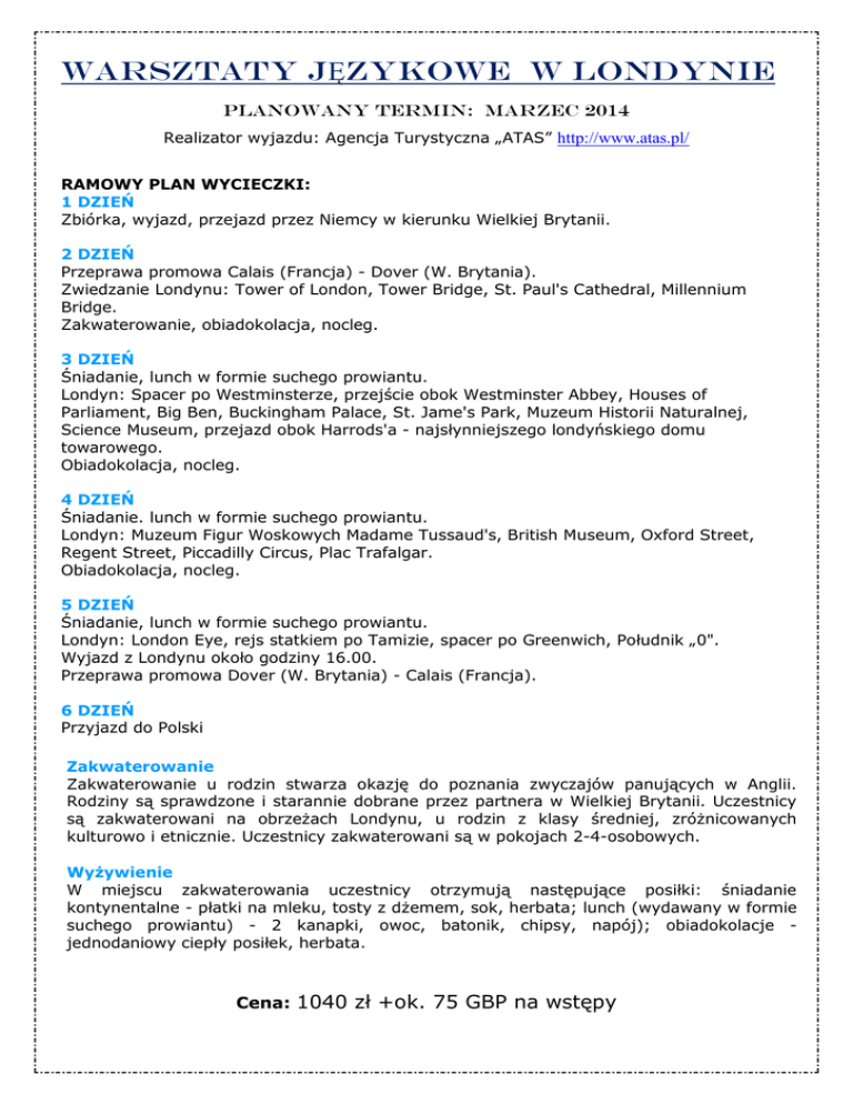 WARSZTATY JĘZYKOWE w LONDYNIE planowany TERMIN: marzec 2014 Realizator wyjazdu: Agencja Turystyczna „ATAS” http://www.atas.pl/ RAMOWY PLAN WYCIECZKI: 1 DZIEŃ Zbiórka, wyjazd, przejazd przez Niemcy w kierunku Wielkiej Brytanii. 2 DZIEŃ Przeprawa promowa Calais (Francja) - Dover (W. Brytania). Zwiedzanie Londynu: Tower of London, Tower Bridge, St. Paul's Cathedral, Millennium Bridge. Zakwaterowanie, obiadokolacja, nocleg. 3 DZIEŃ Śniadanie, lunch w formie suchego prowiantu. Londyn: Spacer po Westminsterze, przejście obok Westminster Abbey, Houses of Parliament, Big Ben, Buckingham Palace, St. Jame's Park, Muzeum Historii Naturalnej, Science Museum, przejazd obok Harrods'a - najsłynniejszego londyńskiego domu towarowego. Obiadokolacja, nocleg. 4 DZIEŃ Śniadanie. lunch w formie suchego prowiantu. Londyn: Muzeum Figur Woskowych Madame Tussaud's, British Museum, Oxford Street, Regent Street, Piccadilly Circus, Plac Trafalgar. Obiadokolacja, nocleg. 5 DZIEŃ Śniadanie, lunch w formie suchego prowiantu. Londyn: London Eye, rejs statkiem po Tamizie, spacer po Greenwich, Południk „0". Wyjazd z Londynu około godziny 16.00. Przeprawa promowa Dover (W. Brytania) - Calais (Francja). 6 DZIEŃ Przyjazd do Polski Zakwaterowanie Zakwaterowanie u rodzin stwarza okazję do poznania zwyczajów panujących w Anglii. Rodziny są sprawdzone i starannie dobrane przez partnera w Wielkiej Brytanii. Uczestnicy są zakwaterowani na obrzeżach Londynu, u rodzin z klasy średniej, zróżnicowanych kulturowo i etnicznie. Uczestnicy zakwaterowani są w pokojach 2-4-osobowych. Wyżywienie W miejscu zakwaterowania uczestnicy otrzymują następujące posiłki: śniadanie kontynentalne - płatki na mleku, tosty z dżemem, sok, herbata; lunch (wydawany w formie suchego prowiantu) - 2 kanapki, owoc, batonik, chipsy, napój); obiadokolacje jednodaniowy ciepły posiłek, herbata. Cena: 1040 zł +ok. 75 GBP na wstępy