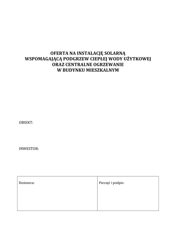 OFERTA NA INSTALACJĘ SOLARNĄ WSPOMAGAJĄCĄ PODGRZEW CIEPŁEJ WODY UŻYTKOWEJ ORAZ CENTRALNE OGRZEWANIE W BUDYNKU MIESZKALNYM OBIEKT: INWESTOR: Dostawca: Pieczęć i podpis: ZAWARTOŚĆ OPRACOWANIA: A. Opis techniczny 1. Założenia dla instalacji solarnej 2. Opis zastosowanych rozwiązań a. Grupa pompowa solarna b. Rurociągi i armatura c. Zabezpieczenie instalacji solarnej 3. Ogólne warunki montażu i eksploatacji urządzeń B. Część Obliczeniowa 1. Dobór kolektorów 2. Dobór pojemności zbiornika 3. Obliczenie uzysku energetycznego z instalacji solarnej 4. Dobór naczynia wzbiorczego przeponowego 5. Dobór zaworu bezpieczeństwa 6. Dobór pompy solarnej 7. Wykres teoretycznych parametrów instalacji C. Schemat technologiczny Rys 1 – Schemat technologiczny instalacji solarnej Systemy solarne CosmoSun Strona 2 A. Opis techniczny Systemy solarne CosmoSun Strona 3 1. Założenia dla instalacji solarnej a) b) c) d) e) f) g) h) lokalizacja inwestycji:……………………………………………………………………… średnie dobowe zużycie ciepłej wody na 1 osobę: 60 [l/d] ilość użytkowników: od 4 do 7 osób wspomaganie c.o. w budynku o powierzchni do 100 [m²] kierunek ukierunkowania płaszczyzny kolektora: południe ±20° typ kolektora przyjętego do obliczeń: kolektor płaski Cosmosun Select 2.09 zakładana suma promieniowania w skali roku: Qc = 1000 [kWh/m2] zakładane średnie dzienne nasłonecznienie w okresie letnim: Qd = 5,5 [kWh/m2] 2. Opis zastosowanych rozwiązań W obliczeniach ujęto kolektor próżniowy Cosmosun Select 2.09 o następujących parametrach: Dane techniczne kolektora CosmoSun Select 2,09* Dane ogólne Pole powierzchni brutto: 2,09 m2 Pole powierzchni apertury: 1,21 m2 Pole powierzchni absorbera: 1,15 m2 Masa opróżnionego kolektora słonecznego: 30 kg Objętość cieczy: 1,5 l Liczba rur szklanych pokrycia: 12 szt. Średnica zewnętrzna rury szklanej: 56 mm Grubość ścianki rury szklanej: 1,8 mm Materiał pokrycia: szkło solarne antyrefleksyjne Wersja montażu: pionowa Zalecany płyn przenoszący ciepło: mieszanka glikolu propylenowego i wody Absorber Materiał: miedź Grubość blachy absorbera: 0,2 mm Rodzaj pokrycia: wysoko selektywne Współczynnik absorpcji: 0,95 Współczynnik emisji: 0,05 Materiał rur absorbera: miedź Liczba rur absorbera: 12 Średnica rury absorbera: 10 mm Grubość ścianki rury absorbera: 0,5 mm Wymiar króćca przyłączeniowego: 18 mm Izolacja cieplna i obudowa Grubość izolacji cieplnej: kanał zbiorczy 30 mm Materiał izolacyjny: wełna mineralna Materiał obudowy: aluminium malowane proszkowo Wymiary gabarytowe kolektora: 2186x1000x124 mm *dane podane zgodnie z certyfikatem nr 005/2010 wydanym przez ITP w Warszawie. Zgodnie z obliczeniami przeprowadzonymi w pkt. B niniejszego opracowania, układ solarny zasilany będzie przez 8 kolektów próżniowych, których parametry umieszczono powyżej. Systemy solarne CosmoSun Strona 4 Kolektory zostaną zainstalowane w 2 bateriach na zestawach montażowych przeznaczonych na dach skośny. Warunki montażu umieszczono w instrukcji montażu producenta stanowiącej oddzielny dokument dołączony bezpośrednio do urządzenia. Kolektory zwrócone będą w kierunku południowym lub ewentualnym odchyleniem od tego kierunku o maksymalnie 20°. Energia cieplna uzyskana z kolektorów zostanie przekazana na nośnik ciepła znajdujący się w absorberze kolektora. Zabrania się stosowania innego nośnika niż ujętego w opracowaniu. Podgrzany do odpowiedniej temperatury nośnik ciepła, przekaże ciepło wodzie buforowej za pośrednictwem wymiennika, którego funkcję pełni wewnętrzna wężownica zbiornika solarnego Fish 1020 S14. Układ solarny sterowany jest regulatorem PS5512SZ połączonym z czujnikami temperatury kolektora i zbiornika oraz z pompą solarną stanowiącą element składowy grupy pompowej. Po uzyskaniu odpowiedniej różnicy temperatur pomiędzy kolektorem a zbiornikiem, regulator uruchamia pompę do momentu zrównania się w/w temperatur lub uzyskania założonej temperatury c.w.u. w zbiorniku. Ciepła woda użytkowa gromadzona jest w wewnętrznym emaliowanym zbiorniku otoczonym ciepłą woda buforową zasobnika zewnętrznego. Podgrzew następuje za pośrednictwem wody buforowej podgrzewanej przez kolektor lub za pośrednictwem kotła podłączonego do wężownicy. Ładowanie centralnego ogrzewania wodą buforową następuje poprzez zawór trójdrogowy. Funkcję pozostałych urządzeń instalacji solarnej określa poniższa cześć opracowania. Zakładany roczny uzysk energii z instalacji solarnej wynosi 6899 kWh. Należy pamiętać, że jest to wartość uwzględniająca optymalne nachylenie i południowe ukierunkowanie płyty kolektora. Na rzeczywisty uzysku wpływ ma również odpowiednia instalacja oraz obsługa systemu solarnego. a. Grupa pompowa solarna Przepływ płynu solarnego w instalacji zapewnia grupa pompowa GPSN 70 połączona z regulatorem. Dobór solarnej grupy pompowej jest podyktowany wielkością oporów przepływu i wielkością przepływu czynnika, który zależy od obsługiwanej liczby kolektorów słonecznych. Zadaniem grupy pompowej jest wymuszenie obiegu płynu solarnego od kolektorów słonecznych do zbiornika. b. Rurociągi i armatura Projekt instalacji solarnej przewiduje zastosowanie rur miedzianych bez szwu, twardych, łączonych przez lutowanie lutem twardym lub przewodów elastycznych ze stali nierdzewnej. Połączenia rurociągu z podgrzewaczem należy wykonać za pomocą połączeń gwintowych. Jako uszczelniacz powinien zostać użyty materiał odporny na działanie wysokich temperatur, odporny na działanie glikolu (stężenie do 50%) niepogarszający właściwości roztworu glikolu oraz niewpływający negatywnie na miedź. Średnice przewodów dobrano na podstawie przyjętej prędkości przepływu w przedziale 0,3 – 0,5 m/s. Izolacja termiczna wykonana z kauczuku etylenowo-propylenowego EPDM o gruboś
