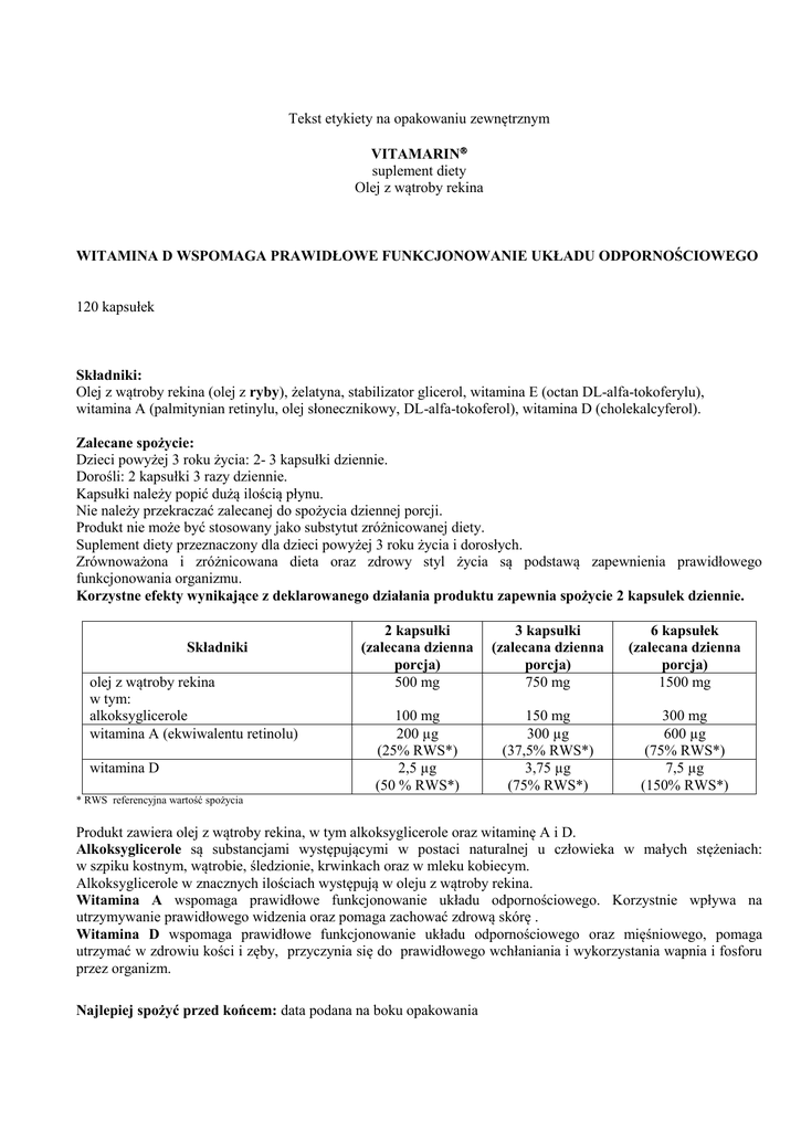 Tekst etykiety na opakowaniu zewnętrznym VITAMARIN suplement diety Olej z wątroby rekina WITAMINA D WSPOMAGA PRAWIDŁOWE FUNKCJONOWANIE UKŁADU ODPORNOŚCIOWEGO 120 kapsułek Składniki: Olej z wątroby rekina (olej z ryby), żelatyna, stabilizator glicerol, witamina E (octan DL-alfa-tokoferylu), witamina A (palmitynian retinylu, olej słonecznikowy, DL-alfa-tokoferol), witamina D (cholekalcyferol). Zalecane spożycie: Dzieci powyżej 3 roku życia: 2- 3 kapsułki dziennie. Dorośli: 2 kapsułki 3 razy dziennie. Kapsułki należy popić dużą ilością płynu. Nie należy przekraczać zalecanej do spożycia dziennej porcji. Produkt nie może być stosowany jako substytut zróżnicowanej diety. Suplement diety przeznaczony dla dzieci powyżej 3 roku życia i dorosłych. Zrównoważona i zróżnicowana dieta oraz zdrowy styl życia są podstawą zapewnienia prawidłowego funkcjonowania organizmu. Korzystne efekty wynikające z deklarowanego działania produktu zapewnia spożycie 2 kapsułek dziennie. Składniki olej z wątroby rekina w tym: alkoksyglicerole witamina A (ekwiwalentu retinolu) witamina D 2 kapsułki (zalecana dzienna porcja) 500 mg 3 kapsułki (zalecana dzienna porcja) 750 mg 6 kapsułek (zalecana dzienna porcja) 1500 mg 100 mg 200 µg (25% RWS*) 2,5 µg (50 % RWS*) 150 mg 300 µg (37,5% RWS*) 3,75 µg (75% RWS*) 300 mg 600 µg (75% RWS*) 7,5 µg (150% RWS*) * RWS referencyjna wartość spożycia Produkt zawiera olej z wątroby rekina, w tym alkoksyglicerole oraz witaminę A i D. Alkoksyglicerole są substancjami występującymi w postaci naturalnej u człowieka w małych stężeniach: w szpiku kostnym, wątrobie, śledzionie, krwinkach oraz w mleku kobiecym. Alkoksyglicerole w znacznych ilościach występują w oleju z wątroby rekina. Witamina A wspomaga prawidłowe funkcjonowanie układu odpornościowego. Korzystnie wpływa na utrzymywanie prawidłowego widzenia oraz pomaga zachować zdrową skórę . Witamina D wspomaga prawidłowe funkcjonowanie układu odpornościowego oraz mięśniowego, pomaga utrzymać w zdrowiu kości i zęby, przyczynia się do prawidłowego wchłaniania i wykorzystania wapnia i fosforu przez organizm. Najlepiej spożyć przed końcem: data podana na boku opakowania Przechowywanie: Przechowywać w temperaturze pokojowej. Chronić od światła i wilgoci. Przechowywać w sposób niedostępny dla małych dzieci. Zawartość netto: 46,2 g (120 kapsułek x 385 mg) Najlepiej spożyć przed końcem: Nr partii: Producent: Medana Pharma SA ul. Wł. Łokietka 10 98-200 Sieradz (logo) Medana (Kod EAN)