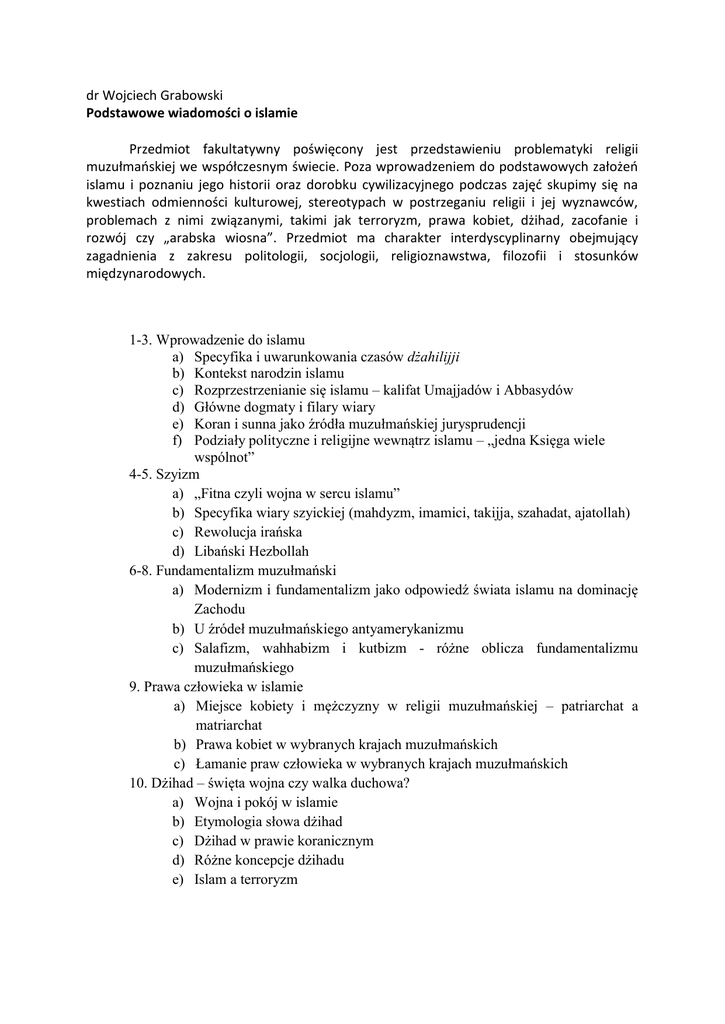 dr Wojciech Grabowski Podstawowe wiadomości o islamie Przedmiot fakultatywny poświęcony jest przedstawieniu problematyki religii muzułmańskiej we współczesnym świecie. Poza wprowadzeniem do podstawowych założeń islamu i poznaniu jego historii oraz dorobku cywilizacyjnego podczas zajęć skupimy się na kwestiach odmienności kulturowej, stereotypach w postrzeganiu religii i jej wyznawców, problemach z nimi związanymi, takimi jak terroryzm, prawa kobiet, dżihad, zacofanie i rozwój czy „arabska wiosna”. Przedmiot ma charakter interdyscyplinarny obejmujący zagadnienia z zakresu politologii, socjologii, religioznawstwa, filozofii i stosunków międzynarodowych. 1-3. Wprowadzenie do islamu a) Specyfika i uwarunkowania czasów dżahilijji b) Kontekst narodzin islamu c) Rozprzestrzenianie się islamu – kalifat Umajjadów i Abbasydów d) Główne dogmaty i filary wiary e) Koran i sunna jako źródła muzułmańskiej jurysprudencji f) Podziały polityczne i religijne wewnątrz islamu – „jedna Księga wiele wspólnot” 4-5. Szyizm a) „Fitna czyli wojna w sercu islamu” b) Specyfika wiary szyickiej (mahdyzm, imamici, takijja, szahadat, ajatollah) c) Rewolucja irańska d) Libański Hezbollah 6-8. Fundamentalizm muzułmański a) Modernizm i fundamentalizm jako odpowiedź świata islamu na dominację Zachodu b) U źródeł muzułmańskiego antyamerykanizmu c) Salafizm, wahhabizm i kutbizm - różne oblicza fundamentalizmu muzułmańskiego 9. Prawa człowieka w islamie a) Miejsce kobiety i mężczyzny w religii muzułmańskiej – patriarchat a matriarchat b) Prawa kobiet w wybranych krajach muzułmańskich c) Łamanie praw człowieka w wybranych krajach muzułmańskich 10. Dżihad – święta wojna czy walka duchowa? a) Wojna i pokój w islamie b) Etymologia słowa dżihad c) Dżihad w prawie koranicznym d) Różne koncepcje dżihadu e) Islam a terroryzm 11. Muzułmańska kultura konsumpcyjna a) Islam a kultura konsumpcyjna b) Muzułmańska kultura konsumpcyjna c) Moda muzułmańska d) Muzułmańskie lalki Barbie e) Napoje orzeźwiające f) Żywność halal i ekoislam g) Muzyka – od naszidu do taqwacore i hip-hopu h) Bliskowschodnie i imuzułmańskie programy komputerowe i) Wirtualny islam 12. Paradygmat zderzenia cywilizacji a) Sąd nad teorią Zderzenia Cywilizacji Samuela Huntingtona b) Islamofobia i antywesternizm jako skrajne przejawy zderzenia cywilizacji c) Fundamentalizm muzułmański w Europie d) Zamachy terrorystyczne w Londynie i Madrycie 13. Islam wobec wyzwań zacofania i rozwoju a) Globalizacja a rozwój b) Globalizacja gospodarcza a muzułmański Bliski Wschód c) Umiarkowany islamizm wobec wyzwań globalizacji 14. „Arabska Wiosna” czyli rewolucja w świecie islamu a) Przyczyny, przebieg i konsekwencje rewolucji b) Stadia przypadków – różnice i podobieństwa, sukcesy i porażki, zwycięzcy i pokonani c) Rola mediów społecznościowych d) Wpływ państw zachodnich na przemiany w świecie arabskim Literatura 1. J.Danecki, Podstawowe wiadomości o islamie, Warszawa 2011 lub starsze 2. G.Kepel, Święta wojna. Ekspansja i upadek fundamentalizmu muzułmańskiego, Warszawa 2003 3. E.Sivan, Radykalny Islam, Kraków 2005 4. G.Corm, Bliski Wschód w ogniu. Oblicza konfliktów 1956-2003, Warszawa 2003 5. P.Kłodkowski, O pęknięciu wewnątrz cywilizacji, Warszawa 2005 6. J.Jansen, Podwójna natura fundamentalizmu muzułmańskiego, Kraków 2005 7. A.Parzymies (red.), Islam a terroryzm, Warszawa 2003 8. E.Pace, P.Stefani, Współczesny fundamentalizm religijny, Kraków 2002 9. B.Tibi, Fundamentalizm religijny, Warszawa 1997 10. A.Mrozek-Dumanowska (red.), Islam a demokracja, Warszawa 1999 11. A. Wąs, Bracia Muzułmanie w Jordanii, Lublin 2006 12. R.Ożarowski, Ideologia na Bliskim Wschodzie, Gdańsk 2006 13. K.Armstrong, W imię Boga. Fundamentalizm w judaizmie, chrześcijaństwie i islamie, Warszawa 2005 14. A.Krawczyk, Terroryzm ugrupowań fundamentalistycznych na obszarze Izraela w drugiej połowie XX wieku, Toruń 2007 15. Y.Melman, M.Javedanfar, Nuklearny sfinks. Iran Mahmuda Ahmadinedżada, Warszawa 2008 16. Z. Landowski, Islam. Nurty, odłamy, sekty, Warszawa 2008 17. D. Cook, Męczeństwo w islamie, Kraków 2009 18. J. Zdanowski, Współczesna muzułmańska myśl społeczno-polityczna. Nurt Braci Muzułmanów, Warszawa 2009 19. J. Zdanowski. Historia Bliskiego Wschodu, Wrocław 2010 20. R. Ożarowski. Hezbollah w Stosunkach międzynarodowych na Bliskim Wschodzie, Gdańsk 2011 21. K. Górak-Sosnowska, Muzułmańska kultura konsumpcyjna, Warszawa 2011 22. G. Kepel, Fitna. Wojna w sercu islamu, Warszawa 2006 23. G.Górak-Sosnowska, J.Jurewicz (red.), Kulturowe uwarunkowania rozwoju w Azji i Afryce, Łódź 2010 24, E. Machut-Mendecka, Archetypy islamu, Warszawa 2006 25. D. Chmielowska, B. Grabowska, E.Machut-Mendecka (red.), Być kobietą w Oriencie, Warszawa 2008 26. A.Mrozek-Dumanowska, Islam i jego odnowa, Warszawa 2010 27. H.Ali Jamsheer, Historia powstania islamu jako doktryny społeczno-politycznej, Warszawa 2009 28. A.Mrozek-Dumanowska, J.Zdanowski (red.), Islam a globalizacja, Warszawa 2005