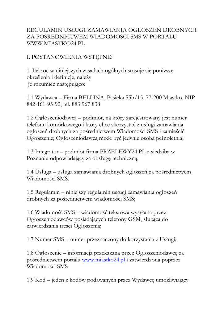 REGULAMIN USŁUGI ZAMAWIANIA OGŁOSZEŃ DROBNYCH ZA POŚREDNICTWEM WIADOMOŚCI SMS W PORTALU WWW.MIASTKO24.PL I. POSTANOWIENIA WSTĘPNE: 1. Ilekroć w niniejszych zasadach ogólnych stosuje się poniższe określenia i definicje, należy je rozumieć następująco: 1.1 Wydawca – Firma BELLINA, Pasieka 55b/15, 77-200 Miastko, NIP 842-161-95-92, tel. 883 967 838 1.2 Ogłoszeniodawca – podmiot, na który zarejestrowany jest numer telefonu komórkowego i który chce skorzystać z usługi zamawiania ogłoszeń drobnych za pośrednictwem Wiadomości SMS i zamieścić Ogłoszenie; Ogłoszeniodawcą może być jedynie osoba pełnoletnia; 1.3 Integrator – podmiot firma PRZELEWY24.PL z siedzibą w Poznaniu odpowiadający za obsługę techniczną. 1.4 Usługa – usługa zamawiania drobnych ogłoszeń za pośrednictwem Wiadomości SMS. 1.5 Regulamin – niniejszy regulamin usługi zamawiania ogłoszeń drobnych za pośrednictwem wiadomości SMS; 1.6 Wiadomość SMS – wiadomość tekstowa wysyłana przez Ogłoszeniodawców posiadających telefony GSM, służąca do zatwierdzania treści Ogłoszenia; 1.7 Numer SMS – numer przeznaczony do korzystania z Usługi; 1.8 Ogłoszenie – informacja przekazana przez Ogłoszeniodawcę za pośrednictwem portalu www.miastko24.pl i zatwierdzona poprzez Wiadomości SMS 1.9 Kod – jeden z kodów podawanych przez Wydawcę umożliwiający zidentyfikowanie Ogłoszenia zgodnie z Regulaminem; 1.10 Serwis – wykonywanie usługi na zlecenie Ogłoszeniodawców przez Organizatora Serwisu: 1.2 1.11 Organizator Serwisu – Firma Bellina 2. Serwis działa od 1.02.2014 r. do odwołania. 3. Organizator ponosi odpowiedzialność za treść i formułę Serwisu 5. Ogłoszeniodawca poprzez skorzystanie z Usługi wyraża zgodę na zastosowanie wszystkich postanowień Regulaminu. 6. Zlecenia publikowane będą przez Firmę Bellina w serwisie www.miastko24.pl II. ZASADY KORZYSTANIA Z SERWISU: 1. Warunkiem korzystania z Usługi jest zapoznanie się z niniejszym Regulaminem. 2. Zlecenie publikacji ogłoszenia następuje poprzez wysłanie Wiadomości SMS przez Ogłoszeniodawcę na podany w serwisie www.miastko24.pl numer SMS z odpowiednim prefiksem. Koszt SMS to 2 zł (2,46 zł z VAT). usługa działa tylko na terenie Polski i dla polskich operatorów - dostawca usługi SMS dla naszego serwisu współpracuje z operatorami: Orange, Play, Plus, T-Mobile (z wirtualnych Operatorów: Polsat Cyfrowy i Sferia S.A.). 3. Po otrzymaniu przez Wydawcę Wiadomości SMS, o treści zgodnej z Regulaminem, Ogłoszeniodawca otrzymuje zwrotną Wiadomość SMS potwierdzającą przyjęcie Ogłoszenia do publikacji. 4. Ogłoszenia będą przyjmowane poprzez wykaz prefiksów i rubryk na podstawie wiadomości SMS, ich kody oraz koszt wysłania wiadomości z ogłoszeniem do określonego tytułu i rubryki podany będzie na łamach portalu www.miastko24.pl. 5. Pozytywnie zweryfikowane przez Wydawcę Ogłoszenie jest jednorazowo publikowane w najbliższym możliwym terminie od daty otrzymania Wiadomości SMS. 6. W przypadku wysłania przez Ogłoszeniodawcę Wiadomości SMS zawierającej błędy uniemożliwiające publikację Ogłoszenia przez Wydawcę lub niezgodną z Regulaminem, Ogłoszeniodawca nie opublikuje ogłoszenia bez podania przyczyny. Opłata z tytułu przesłania SMS-a zawierającego błędy będzie pobrana zgodnie z cennikiem określonym w punkcie 1.8 podpunkt a. 7. Wydawca zastrzega sobie prawo weryfikacji Ogłoszeń w zakresie: a) ich zgodności z zasadami pisowni języka polskiego (ortografii i gramatyki), b) zgodności ich treści z wybraną rubryką oraz dopuszczalnej liczby użytych znaków, c) ich zgodności z przepisami prawa, zasadami moralności publicznej i dobrych obyczajów, d) ich zgodności z ogólnymi zasadami publikacji ogłoszeń drobnych oraz regulaminem przyjmowania ogłoszeń i reklam prasowych, dostępnymi w Dziale Ogłoszeń Wydawcy 8. Niepodanie przez Ogłoszeniodawcę w treści Ogłoszenia telefonu kontaktowego będzie równoznaczne z opublikowaniem numeru telefonu komórkowego, z którego wysłane zostało Ogłoszenie. 9. W przypadku gdy Wydawca stwierdzi niezgodność Ogłoszenia z postanowieniami Regulaminu, ma ono prawo do niepublikowania Ogłoszenia. 10. Wydawca dołoży wszelkich starań w celu zapewnienia prawidłowego działania Usługi. 11. W razie zmiany przepisów prawnych lub z powodu innej ważnej przyczyny Wydawca zastrzega sobie prawo do jednostronnej zmiany postanowień Regulaminu w każdej chwili. 12. Wydawca nie ponosi odpowiedzialności za: 1) szkody spowodowane nieprawidłowym korzystaniem przez Ogłoszeniodawcę z Usługi, 2) nieprzekazanie Wydawcy SMS-u przez operatora sieci telefonii komórkowej, 3) problemy w funkcjonowaniu Usługi, jeżeli nastąpiły one wskutek zdarzeń, których Wydawca przy zachowaniu należytej staranności nie było w stanie przewidzieć, lub którym nie mogło zapobiec, w szczególności w przypadku problemów związanych ze zdarzeniami losowymi o charakterze siły wyższej, 4) korzystanie z Usługi przez Ogłoszeniodawców niezgodnie z postanowieniami niniejszego Regulaminu, 5) przerwy w świadczeniu Usługi zaistniałe z przyczyn technicznych (np. konserwacja, przegląd, wymiana sprzętu) lub niezależnych od Wydawcy. III. REKLAMACJE: 1. Reklamacje dotyczące Usługi należy przesyłać listownie na adres lub drogą mailową: Firma Bellina 2. Zgłoszenie reklamacji powinno zawierać imię i nazwisko osoby dokonującej reklamacji, numer telefonu komórkowego z którego wysłano SMS, a także dokładne podanie zarzutów reklamacji. Reklamację należy zgłosić nie później niż w ciągu 2 tygodni od daty wysłania SMS-u. 3. Wydawca rozpatrzy reklamację w terminie 7 dni od daty jej zgłoszenia, powiadamiając o swojej decyzji Ogłoszeniodawcę. 4. Decyzja Wydawcy uwzględniająca lub odmawiająca uwzględnienia reklamacji jest ostateczna. IV. POSTANOWIENIA KOŃCOWE: 1. Wszelkie spory mogące powstać na tle interpre