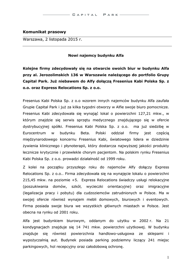 Komunikat prasowy Warszawa, 2 listopada 2015 r. INFORMACJA PRASOWA Nowi najemcy budynku Alfa Kolejne firmy zdecydowały się na otwarcie swoich biur w budynku Alfa przy al. Jerozolimskich 136 w Warszawie należącego do portfolio Grupy Capital Park. Już niebawem do Alfy dołączą Fresenius Kabi Polska Sp. z o.o. oraz Express Relocations Sp. z o.o. Fresenius Kabi Polska Sp. z o.o wzorem innych najemców budynku Alfa zaufała Grupie Capital Park i już za kilka tygodni otworzy w Alfie swoje biuro pomocnicze. Fresenius Kabi zdecydowała się wynająć lokal o powierzchni 127,21 mkw., w którym znajdzie się serwis sprzętu medycznego znajdującego się w ofercie dystrybucyjnej spółki. Fresenius Kabi Polska Sp. z o.o. Eurocentrum w budynku Beta. Polski oddział ma już siedzibę w firmy jest częścią międzynarodowego koncernu Fresenius Kabi, światowego lidera w dziedzinie żywienia klinicznego i płynoterapii, który dostarcza najwyższej jakości produkty lecznicze krytycznie i przewlekle chorym pacjentom. Na polskim rynku Fresenius Kabi Polska Sp. z o.o. prowadzi działalność od 1999 roku. Z kolei na początku przyszłego roku do najemców Alfy dołączy Express Relocations Sp. z o.o.. Firma zdecydowała się na wynajęcie lokalu o powierzchni 215,45 mkw. na poziomie +5. Express Relocations świadczy usługi relokacyjne (poszukiwania domów, szkół, wycieczki orientacyjne) oraz imigracyjne (legalizacja pracy i pobytu) dla cudzoziemców zatrudnionych w Polsce. Ma w swojej ofercie również wynajem mebli domowych, biurowych i eventowych. Firma posiada swoje biura we wszystkich głównych miastach w Polsce. Jest obecna na rynku od 2001 roku. Alfa jest budynkiem biurowym, oddanym do użytku w 2002 r. Na 21 kondygnacjach znajduje się 14 741 mkw. powierzchni użytkowej. W budynku znajduje się również powierzchnia handlowo-usługowa ze sklepami i wypożyczalnią aut. Budynek posiada parking podziemny liczący 241 miejsc parkingowych, hol recepcyjny oraz całodobową ochronę. 1 Dzięki połączeniu wewnętrznym pasażem z nowoczesnym budynkiem Eurocentum Office Complex najemcy budynku Alfa mogą również korzystać z szeregu dodatkowych usług takich jak: profesjonalny Concierge & Lifestyle Manager, salon fryzjerski, salon pielęgnacji paznokci, gabinet fizjoterapii, pralnia, czy sklep spożywczy i drogeria. Dodatkowe informacje: Budynek Eurocentrum Alfa jest zlokalizowany w Alejach Jerozolimskich, na obrzeżach Centralnego Obszaru Biznesu. Rejon ten jest jedną z najdynamiczniej rozwijających się części Warszawy. W sąsiedztwie nieruchomości znajdują się biznesparki - Jerozolimskie Business Park, Ochota Office Park oraz nowoczesne centra handlowe - Reduta, Blue City, Macro Cash & Carry i Castorama. Dogodna lokalizacja Eurocentrum Alfa przy jednaj z głównych arterii komunikacyjnych miasta umożliwia łatwy i szybki dojazd zarówno samochodem, jak i środkami komunikacji miejskiej. Natomiast sąsiedztwo dworca kolejowego Warszawa Zachodnia zapewnia bezpośrednie połączenie pociągami PKP, SKM i WKD z miastami wchodzącymi w skład Warszawskiego Obszaru Metropolitarnego. Biurowiec Eurocentrum Alfa został zaprojektowany przez turecką pracownię architektoniczną Boyut Architectural Co. Ltd. we współpracy z polską Spółką Projektową Plan i wykonany przy użyciu wysokiej klasy materiałów, takich jak czerwony afrykański granit, szkło i metal. Dodatkowe informacje: Inwestor Grupa Capital Park jest doświadczonym i aktywnym inwestorem i deweloperem działającym na rynku nieruchomości w Polsce od ponad dziesięciu lat, specjalizującym się w wyszukiwaniu i wykorzystywaniu okazji rynkowych (ang. opportunistic investor). Głównym przedmiotem działalności Grupy jest nabywanie nieruchomości ze znacznym potencjałem budowy wartości, np. poprzez zmianę warunków zagospodarowania przestrzennego lub uzyskanie pozwolenia na budowę, budowę nowych lub przebudowę istniejących obiektów, lub poprawę zarządzania istniejącymi budynkami. Capital Park osiąga dochody z najmu oraz ze sprzedaży nieruchomości lub produktów inwestycyjnych opartych na nieruchomościach. Grupa aktywnie poszukuje możliwości zakupu nowych projektów nieruchomościowych oraz nowych źródeł dochodów i wzrostu wartości w obszarach rynku charakteryzujących się dużym potencjałem rozwoju. Od rozpoczęcia działalności w 2003 roku Grupa przeprowadziła ok. 100 transakcji inwestycyjnych i zarządza portfelem nieruchomości obejmującym 75 projektów o łącznej powierzchni wynajmu brutto ok. 250 tys. mkw., zlokalizowanych w 37 miastach. Spośród tych projektów 39 nieruchomości handlowych typu high-street znajduje się w strukturze nowo utworzonego, innowacyjnego na polskim rynku Real Estate Income Assets FIZ AN, którym Grupa aktywnie zarządza i w którym posiada 15-proc. udział. Na dzień 31 grudnia 2014 r. bieżąca wartość portfela nieruchomości zarządzanych przez Grupę wynosiła 1,6 mld zł. Na dzień 31 grudnia 2014 r. 79% bieżącej wartości portfela Grupy stanowiły nieruchomości w Warszawie, czyli na największym i jednym z najbardziej perspektywicznych rynków nieruchomości komercyjnych w Polsce. Biuro prasowe Capital Park Katarzyna Mituła tel. 0 48 22 642 24 16, + 48 783 23 83 83 email: [email protected] 2