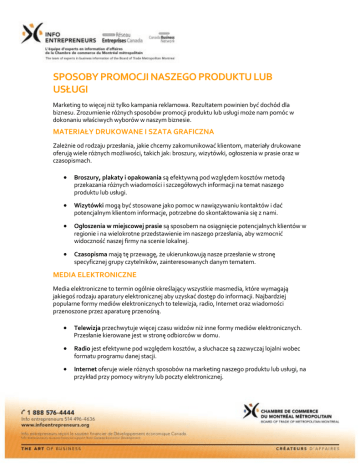 SPOSOBY PROMOCJI NASZEGO PRODUKTU LUB USŁUGI Marketing to więcej niż tylko kampania reklamowa. Rezultatem powinien być dochód dla biznesu. Zrozumienie różnych sposobów promocji produktu lub usługi może nam pomóc w dokonaniu właściwych wyborów w naszym biznesie. MATERIAŁY DRUKOWANE I SZATA GRAFICZNA Zależnie od rodzaju przesłania, jakie chcemy zakomunikować klientom, materiały drukowane oferują wiele różnych możliwości, takich jak: broszury, wizytówki, ogłoszenia w prasie oraz w czasopismach. • Broszury, plakaty i opakowania są efektywną pod względem kosztów metodą przekazania różnych wiadomości i szczegółowych informacji na temat naszego produktu lub usługi. • Wizytówki mogą być stosowane jako pomoc w nawiązywaniu kontaktów i dać potencjalnym klientom informacje, potrzebne do skontaktowania się z nami. • Ogłoszenia w miejscowej prasie są sposobem na osiągnięcie potencjalnych klientów w regionie i na wielokrotne przedstawienie im naszego przesłania, aby wzmocnić widoczność naszej firmy na scenie lokalnej. • Czasopisma mają tę przewagę, że ukierunkowują nasze przesłanie w stronę specyficznej grupy czytelników, zainteresowanych danym tematem. MEDIA ELEKTRONICZNE Media elektroniczne to termin ogólnie określający wszystkie masmedia, które wymagają jakiegoś rodzaju aparatury elektronicznej aby uzyskać dostęp do informacji. Najbardziej popularne formy mediów elektronicznych to telewizja, radio, Internet oraz wiadomości przenoszone przez aparaturę przenośną. • Telewizja przechwytuje więcej czasu widzów niż inne formy mediów elektronicznych. Przesłanie kierowane jest w stronę odbiorców w domu. • Radio jest efektywne pod względem kosztów, a słuchacze są zazwyczaj lojalni wobec formatu programu danej stacji. • Internet oferuje wiele różnych sposobów na marketing naszego produktu lub usługi, na przykład przy pomocy witryny lub poczty elektronicznej. • Telefony komórkowe i telefony typu “smart” pozwalają na taktykę marketingową, która stara się dotrzeć do klientów bezpośrednio poprzez ich aparaty przenośne. • W przypadku mediów socjalnych, marketing zachęca do interakcji pomiędzy klientami a biznesem przy zastosowaniu różnych witryn, obsługujących sieci towarzyskie. INNE POMYSŁY NA PROMOCJĘ Prezenty promocyjne, takie jak długopisy, breloczki lub kalendarze, mogą być rozdawane osobom lub grupom osób, które znamy osobiście aby pomóc utrzymać pozytywną opinię o firmie i ugruntować jej renomę. Sieci towarzyskie i aktywność na scenie lokalnej także mogą wspomagać promocję naszego biznesu. Można nawiązać nowe kontakty i sięgnąć do nowych potencjalnych klientów poprzez udział w wystawach, konferencjach, lokalnych imprezach oraz innych wydarzeniach natury towarzyskiej. Rozmowa z ludźmi o swoim biznesie może być jednym z najbardziej efektywnych sposobów promowania naszego produktu lub usługi. Zaplanowanie strategii marketingowej pomoże nam w ustaleniu najlepszej metody promocji naszego produktu lub usługi i pozwoli na określenie stopnia sukcesu w stosunku do postawionych uprzednio celów. Da nam to również wyraźniejszy obraz, gdzie nasza strategia może wymagać zmian.