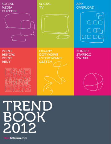 SOCIAL MEDIA CLUTTER SOCIAL TV APP OVERLOAD POINT &KNOW, POINT &BUY EKRANY DOTYKOWE i STEROWANIE GESTEM KONIEC STAREGO ŚWIATA TREND BOOK 2012 Partner wydania O najnowszych rozwiązaniach technologicznych na świecie mogłam napisać dzięki możliwości nieograniczonego korzystania z Virtual Media Lab, wewnętrznego rozwiązania IPG Mediabrands. Dostęp do Virtual Media Lab uzyskałam dzięki uprzejmości polskiego oddziału Universal McCann. Trendbook 2012 2 Wstęp TrendBook 2011, wydany przeze mnie w ubiegłym roku po raz pierwszy, cieszył się ogromną popularnością. Funkcjonował głównie niezależnie, ale przedrukowany został także w raporcie AdStandard 2011 i stał się inspiracją do napisania artykułu w Niezbędniku Inteligenta Polityki. Pracując nad nim, robiłam to – poniekąd – dla siebie. Brakowało mi bowiem polskiego kompendium dotyczącego najważniejszych trendów w danym roku. Po publikacji okazało się jednak, że ten brak odczuwaInterakcja łam nie tylko ja. Zdecydowałam wówczas, z ekranami że TrendBook wydawany będzie rokroczstaje się naszą nie. Dziś prezentuję więc drugą edycję – codziennością. TrendBook 2012. W tym roku trendów jest pięć i – podobnie jak w ubiegłym roku – krążą wokół społeczności oraz nowych technologii. Trendy społecznościowe dotyczą głównie nadmiaru – kampanii i aplikacji, ale także zjawiska nazywanego social TV. Trendy technologiczne poświęcone są natomiast w dużej mierze kwestii nazywanej Human Computer Interaction (HCI) – mowa tu o sterowaniu gestem, dotykiem, o zjawisku Point&Know. Czy jedne i drugie mają ze sobą coś wspólnego? Zdecydowanie tak. W ubiegłym roku wiodącym tematem TrendBooka była mobilność – pisałam o rynku smartfonów i tabletów, o mobilnym Internecie. Dziś, dosłownie z dnia na dzień, technologie te przestają być niszowe. Na popularności Korzystając z internetu, uniezależniamy się zyskiwać będą od komputera stacjonarnego. Według GfK technologie Polonia w grudniu 2011 penetracja smartfoumożliwiające nów w Polsce wyniosła 34,1%. Jeżeli chodzi sterowanie o tablety, to w ubiegłym roku sprzedano ich komputerem w naszym kraju około 90 tysięcy. W tym za pomocą gestu roku wartość ta ma wzrosnąć trzykrotnie. W efekcie żyjemy dziś już nie tylko w tzw. czy głosu. erze plus-PC (oprócz stacjonarnego komputera mamy jeszcze kilka innych urządzeń, mobilnych, z dostępem do internetu), ale przede wszystkim coraz częściej w epoce bez klawiatury i myszki. Według raportu Touch Panel Market Analysis 2011 rynek ekranów dotykowych rośnie dziś dziesięć razy szybciej niż ekranów typu display – oznacza to, że interakcja z ekranami staje się naszą codziennością. Oprócz smartfonów i tabletów, coraz częściej wykorzystywane są one także w przestrzeni publicznej – na przystankach, witrynach sklepowych, w restauracjach. Nic dziwnego więc, że na popularności zyskiwać będą technologie umożliwiające sterowanie komputerem za pomocą gestu czy głosu (SIRI, Google Voice Actions, Kinect, rozwiązania typu Microsoft Surface etc. etc.). Ale pamiętać trzeba, że interakcja z ekranami to także rozwiązania typu social TV oraz Point & Know – ogromna ilość urządzeń mobilnych nie mogła pozostać bez wpływu na nasze funkcjonowanie we współczesnym Ogromna ilość urządzeń świecie, korzystanie z tradycyjmobilnych nie mogła nych mediów, zdobywanie informacji czy robienie zakupów. pozostać bez wpływu na nasze funkcjonowanie we współczesnym świecie, korzystanie z tradycyjnych mediów, zdobywanie informacji czy robienie zakupów. Pytania, które nasuwają się w tym kontekście, brzmią: które z technologii HCI są szczególnie użyteczne, a przez to zyskujące na popularności? Jak wykorzystywać je w działaniach reklamowych? Jak połączyć je z aktywnością użytkownika w serwisach społecznościowych i tradycyjnych mediach? Postaram się na nie odpowiedzieć w tegorocznej edycji TrendBooka. Życzę miłej lektury i wielu inspiracji. Natalia Hatalska Gdańsk, marzec 2012 Trendbook 2012 3 Co się sprawdziło z prognoz na 2011 rok? De-friending – czyli odprzyjaźnianie się. Trend mocno związany z rosnącą świadomością prywatności w sieci. Publikując coraz bardziej intymne informacje na swoim profilu w serwisie społecznościowym, nie do końca czujemy się komfortowo z tym, że daną informację czyta kilkaset osób. W związku z tym w ubiegłym roku zaczęliśmy się pozbywać części znajomych ze swojej listy „przyjaciół”. Trend ten próbował zahamować zarówno Google+, od początku wprowadzając tzw. Kręgi, jak i Facebook, uruchamiając we wrześniu ubiegłego roku funkcję – Listy. Trend jednak zdecydowanie bardziej widoczny na Zachodzie niż w Polsce – serwis UnThink pozycjonujący się w opozycji do Facebooka i Google+ zanotował w listopadzie 2011 już 100 tysięcy użytkowników. Life-streaming – zdecydowanie rosnący trend (na początku 2011 roku Skype kupił qik.com za 150 mln dolarów) i jeszcze bardziej widoczny, jeśli rozpatrywany w szerszych kategoriach niż tylko streamingu wideo. Na popularności zyskują aplikacje typu Nokia viNe – zapisuje wszystkie zrobione przez nas zdjęcia, nagrane pliki muzyczne, wideo, dźwiękowe i tekstowe, a następnie przenosi je na mapę, dokładnie w te miejsca, gdzie dany plik został nagrany. W ten sposób powstaje swoista, multimedialna mapa naszego dnia, tygodnia i życia. Geolokalizacja – mimo ogromnej medialnej popularności – nie osiągnęła w ubiegłym roku jeszcze wśród konsumentów masy krytycznej – ani w Polsce, ani na Zachodzie. Według raportu ComScore MobiLens zaledwie 7% amerykańskich użytkowników telefonów komórkowych korzystało z geolokalizacji (wskaźnik oczywiście wyższy wśród użytkowników smartfonów – na poziomie 17,6%). W Polsce liczba wskazań, gdzie przebywamy, jest w tego typu serwisach jeszcze 