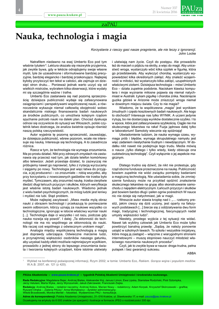 Numer 337 21 kwietnia 2016 4 www.pauza.krakow.pl zaPAU Nauka, technologia i magia Korzystanie z rzeczy gasi nasze pragnienie, ale nie leczy z ignorancji. John Locke Natrafiłem niedawno na esej Umberto Eco pod tym właśnie tytułem 1. Lektura okazała się niezwykle przyjemna, jak zwykle bywa, gdy w tekście odnajdujemy swoje własne myśli, tyle że uzasadnione i sformułowane bardziej precyzyjnie, bardziej elegancko i bardziej przekonująco. Najlepiej byłoby przytoczyć ten tekst w całości, ale zajmuje on dziesięć stron druku… Ponieważ jednak warto uczyć się od wielkich mistrzów, wybrałem kilka obserwacji, które wydały mi się szczególnie ważne i trafne. Umberto Eco zastanawia się nad pozorną sprzecznością: dzisiejsza publiczność wydaje się zafascynowana osiągnięciami i perspektywami współczesnej nauki, a równocześnie wykazuje niemal całkowitą obojętność wobec skandalicznie niskiego finansowania badań naukowych ze środków publicznych, co umożliwia kolejnym rządom spychanie potrzeb nauki na daleki plan. Chociaż dyskusja odnosi się oczywiście do sytuacji we Włoszech, polski czytelnik łatwo dostrzega, że analiza świetnie opisuje również naszą polską rzeczywistość. Autor wyjaśnia tę pozorną sprzeczność, zauważając, że dzisiejsza publiczność, wbrew pozorom, wcale nie interesuje się nauką. Interesuje się technologią. A to zasadnicza różnica. Rzecz w tym, że technologia nie wymaga zrozumienia. Ma po prostu działać. Nikt przy zdrowych zmysłach nie zastanawia się przecież nad tym, jak działa telefon komórkowy albo telewizor. Jeżeli przestaje działać, to zazwyczaj nie próbujemy nawet go naprawiać, tylko z irytacją wyrzucamy i sięgamy po nowy. Technologia jest więc łatwa do przyjęcia, a jej producenci – co zrozumiałe – robią wszystko, aby przy korzystaniu z nowoczesnych gadżetów nie trzeba było myśleć. Tymczasem, aby zrozumieć naukę, trzeba cierpliwie śledzić długi łańcuch przyczyn i skutków, których weryfikacja jest właśnie istotą badań naukowych. Wiadomo jednak z wielu badań psychologicznych, że mózg ludzki jest leniwy i myśleć nie lubi. Stąd problem. Może najlepiej zacytować: „Mass media mylą obraz nauki z obrazem technologii i przekazują to pomieszanie swoim odbiorcom, którzy uznają za naukowe wszystko co technologiczne, ignorując w istocie właściwy wymiar nauki […]. Technologia daje ci wszystko i od razu, podczas gdy nauka rozwija się powoli”. I dalej: „Ta skłonność do technologii nie ma nic wspólnego ze skłonnością do nauki. Ma raczej coś wspólnego z odwiecznym urokiem magii”. Analogia między współczesną technologią a magią jest doprawdy uderzająca. Odwieczne marzenie ludzi, a przynajmniej większości osobników naszego gatunku, aby uzyskać każdy efekt możliwie najmniejszym wysiłkiem, prowadziło z jednej strony do lepszego zrozumienia świata i tworzenia kolejnych urządzeń, które istotnie ułatwiały 1 i ułatwiają nam życie. Czyli do postępu. Ale prowadziło też do marzeń o pójściu na skróty, a więc do magii. Aby unicestwić wroga, wystarczyło wbić kilka szpilek w figurkę, która go przedstawiała. Aby wyleczyć chorobę, wystarczyło wypowiedzieć kilka określonych zaklęć. Aby znaleźć wzajemność w miłości, też wystarczyło kilka zaklęć, uzupełnionych właściwymi ziołami. Dzisiejsza technologia – mówi Umberto Eco – działa zupełnie podobnie. Naciskam klawisz komputera i moje wyznanie miłosne pojawia się niemal natychmiast w Australii. Łykam pigułkę i choroba znika. Naciśnięcie guzika gdzieś w Arizonie może zniszczyć wroga niemal w dowolnym miejscu świata. Czy to nie magia? Wiadomo, że ta współczesna „magia” jest wynikiem żmudnych i często kosztownych badań naukowych. Ale kogo to obchodzi? Interesuje nas tylko WYNIK. A uczeni jedynie irytują, bo nie dostarczają wyników dostatecznie szybko. I to w epoce, która jest zafascynowana szybkością. Ciągle nie ma skutecznego lekarstwa na raka! Fuzja jądrowa dalej tylko w laboratorium! Samoloty wiecznie się spóźniają! Uświadomienie ludziom, że nauka wymaga czasu, wymaga prób i błędów, wymaga skrupulatnego namysłu jest więc zadaniem niesłychanie trudnym i niewdzięcznym. W dodatku nikt nawet nie podejmuje tego trudu. Media mówią o nauce „tylko dlatego i tylko wtedy, kiedy obiecuje ona cudotwórczą technologię”. Czyli wyłącznie o jej aspekcie magicznym. Dlatego trudno się dziwić, że nikt nie protestuje, gdy rząd obcina fundusze przeznaczone na naukę. Publiczność bowiem zupełnie nie widzi związku pomiędzy badaniami a magiczną technologią. Nie uświadamia sobie, że zmniejszenie funduszy może na przykład opóźnić znalezienie skutecznego lekarstwa na grypę albo skonstruowanie samochodu z napędem elektrycznym. Łańcuch przyczyn i skutków jest bowiem bardzo długi i pełen ogniw pośrednich W nauce nic nie dzieje się natychmiast, jak w magii. Wreszcie autor stawia kropkę nad i: „… rzekomy prestiż, jakim cieszy się dziś uczony, jest oparty na fałszywych podstawach […] bierze się z oddziaływania dwu form magii, tradycyjnej i technologicznej, fascynujących nadal umysły większości ludzi”. Niestety, prostego wyjścia z tej sytuacji nie widać. Nawet tak wybitny człowiek jak Umberto Eco może tylko powtórzyć banalną prawdę: „Sądzę, że należy ponownie usiąść w szkolnych ławach. To szkoła i wszystkie inicjatywy, które mogą ją zastąpić – włącznie z wiarygodnymi stronami internetowymi – muszą stopniowo nauczyć młodzież właściwego rozumienia naukowych procedur”. Czyli, jak to zwykle bywa w nauce: droga trudna, pełna pułapek i bez gwarancji sukcesu. ABBA Wykład na konferencji poświęconej informacji, Rzym 2002; w tomie: Umberto Eco, Rakiem. Gorąca wojna i populizm mediów. W.A.B. 2007, str. 121 (z 420). PAUza Akademicka – www.pauza.krakow.pl – t