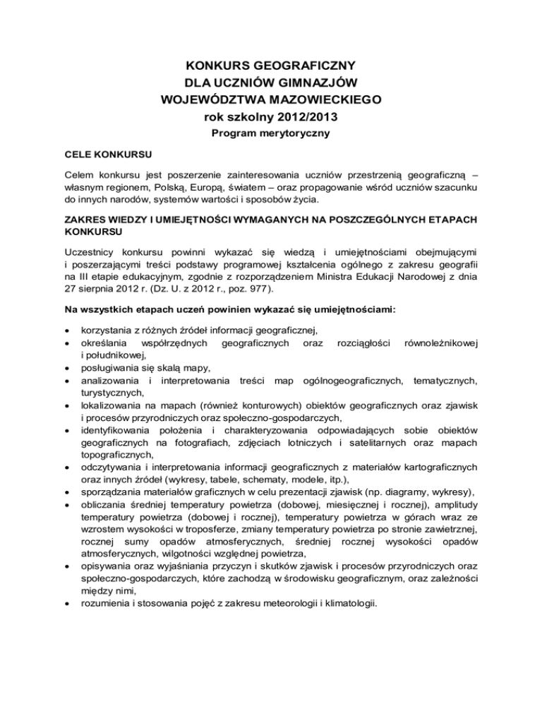 KONKURS GEOGRAFICZNY DLA UCZNIÓW GIMNAZJÓW WOJEWÓDZTWA MAZOWIECKIEGO rok szkolny 2012/2013 Program merytoryczny CELE KONKURSU Celem konkursu jest poszerzenie zainteresowania uczniów przestrzenią geograficzną – własnym regionem, Polską, Europą, światem – oraz propagowanie wśród uczniów szacunku do innych narodów, systemów wartości i sposobów życia. ZAKRES WIEDZY I UMIEJĘTNOŚCI WYMAGANYCH NA POSZCZEGÓLNYCH ETAPACH KONKURSU Uczestnicy konkursu powinni wykazać się wiedzą i umiejętnościami obejmującymi i poszerzającymi treści podstawy programowej kształcenia ogólnego z zakresu geografii na III etapie edukacyjnym, zgodnie z rozporządzeniem Ministra Edukacji Narodowej z dnia 27 sierpnia 2012 r. (Dz. U. z 2012 r., poz. 977). Na wszystkich etapach uczeń powinien wykazać się umiejętnościami: korzystania z różnych źródeł informacji geograficznej, określania współrzędnych geograficznych oraz rozciągłości równoleżnikowej i południkowej, posługiwania się skalą mapy, analizowania i interpretowania treści map ogólnogeograficznych, tematycznych, turystycznych, lokalizowania na mapach (również konturowych) obiektów geograficznych oraz zjawisk i procesów przyrodniczych oraz społeczno-gospodarczych, identyfikowania położenia i charakteryzowania odpowiadających sobie obiektów geograficznych na fotografiach, zdjęciach lotniczych i satelitarnych oraz mapach topograficznych, odczytywania i interpretowania informacji geograficznych z materiałów kartograficznych oraz innych źródeł (wykresy, tabele, schematy, modele, itp.), sporządzania materiałów graficznych w celu prezentacji zjawisk (np. diagramy, wykresy), obliczania średniej temperatury powietrza (dobowej, miesięcznej i rocznej), amplitudy temperatury powietrza (dobowej i rocznej), temperatury powietrza w górach wraz ze wzrostem wysokości w troposferze, zmiany temperatury powietrza po stronie zawietrznej, rocznej sumy opadów atmosferycznych, średniej rocznej wysokości opadów atmosferycznych, wilgotności względnej powietrza, opisywania oraz wyjaśniania przyczyn i skutków zjawisk i procesów przyrodniczych oraz społeczno-gospodarczych, które zachodzą w środowisku geograficznym, oraz zależności między nimi, rozumienia i stosowania pojęć z zakresu meteorologii i klimatologii. Temat przewodni konkursu w roku szkolnym 2012/2013 Pogoda i klimat oraz ich wpływ na osadnictwo i działalność gospodarczą człowieka na świecie i w Polsce. I etap – szkolny 1. 2. 3. 4. 5. 6. 7. 8. Charakterystyka warstw atmosfery ze szczególnym uwzględnieniem zjawisk w troposferze. Skład chemiczny powietrza. Pogoda i jej składniki. Charakterystyka składników pogody: temperatura powietrza – jednostki i przyrządy pomiarowe, czynniki kształtujące rozkład temperatury na Ziemi, obszary o najwyższych i najniższych temperaturach powietrza na Ziemi, izotermy, ciśnienie atmosferyczne – definicja, jednostki i przyrządy pomiarowe, czynniki wpływające na ciśnienie atmosferyczne, podstawowe układy baryczne: niż i wyż baryczny, izobary, prędkość i kierunek wiatru – definicja, jednostki i przyrządy pomiarowe, skala Beauforta, zastosowanie róży wiatrów do określania kierunku wiatru, czynniki wpływające na kierunki i prędkość wiatru, rodzaje wiatrów: stałe (pasat), sezonowe (monsuny), lokalne (bryza, wiatry typu fenowego: fen, halny, polak, chinook, zonda), zachmurzenie – proces powstawania chmur i ich rodzaje wg wyglądu i wysokości w troposferze, mgła, określanie stopnia zachmurzenia, opady atmosferyczne – jednostki i przyrządy pomiarowe, czynniki kształtujące wysokość opadów atmosferycznych, rodzaje opadów (deszcz, śnieg, grad), rozmieszczenie rocznych sum opadów na kuli ziemskiej, izohiety, osady atmosferyczne – ich rodzaje i warunki powstawania. Klimat i jego składniki, czynniki klimatotwórcze. Wpływ głównych czynników klimatotwórczych (szerokość geograficzna, prądy morskie, rozmieszczenie lądów i wód, wysokość nad poziomem morza, ukształtowanie terenu, rodzaj podłoża i pokrycia terenu, działalność człowieka) na klimat. Strefy klimatyczne na Ziemi – charakterystyka stref, typy klimatów, odmiany klimatów, rozmieszczenie na kuli ziemskiej. Czytanie klimatogramów i rozpoznawanie typu klimatu na podstawie klimatogramu. Termiczne pory roku. Obserwacje meteorologiczne i prognozowanie pogody. Mapa synoptyczna i jej interpretacja. II etap – rejonowy Obowiązuje zakres wiedzy i umiejętności z etapu szkolnego oraz: 1. Pozostałe składniki pogody i ich charakterystyka: promieniowanie słoneczne – nasłonecznienie (insolacja) i usłonecznienie, wilgotność powietrza – parowanie (ewaporacja), zawartość pary wodnej w atmosferze (wilgotność powietrza bezwzględna i względna), jednostki i przyrządy pomiarowe, warunki procesów kondensacji i resublimacji oraz ich przebieg, pokrywa śnieżna – długość zalegania, grubość. 2. Rozmieszczenie stałych ośrodków ciśnienia atmosferycznego na kuli ziemskiej w ciągu roku i uzasadnienie ich powstawania. 3. Cyrkulacja powietrza atmosferycznego na Ziemi – przyczyny cyrkulacji, charakterystyka krążenia powietrza w poszczególnych strefach oświetlenia Ziemi. 4. Masy powietrza na Ziemi i fronty atmosferyczne – definicja, rodzaje mas powietrza i frontów atmosferycznych, charakterystyka pogody i jej zmiany na frontach ciepłym, zimnym i zokludowanym. 5. Wiatry lokalne o składowej pionowej (mistral, bora, wiatry zboczowe: dolinny i górski) – warunki powstawania, cechy i występowanie. 6. Wiatry typu cyklonalnego (tornado, tajfun, willy-willy, huragan, trąby powietrzne, wiry powietrzne). 7. Czytanie i zastosowanie szesnastokierunkowej róży wiatrów. 8. Rodzaje opadów wg ich genezy (orograficzne, frontalne i konwekcyjne). III etap – wojewódzki Obowiązuje zakres wiedzy i umiejętności z etapu szkolnego i rejonowego oraz: 1. Rekordy klimatyczne na Ziemi. 