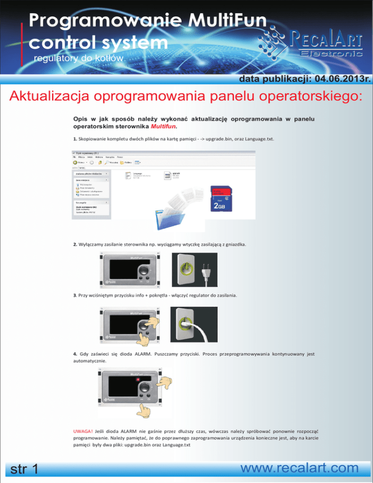 Programowanie MultiFun control system regulatory do kot³ów Electronic data publikacji: 04.06.2013r. Aktualizacja oprogramowania panelu operatorskiego: Opis w jak sposób nale¿y wykonaæ aktualizacjê oprogramowania w panelu operatorskim sterownika Multifun. 1. Skopiowanie kompletu dwóch plików na kartê pamiêci - -> upgrade.bin, oraz Language.txt. 2. Wy³¹czamy zasilanie sterownika np. wyci¹gamy wtyczkê zasilaj¹c¹ z gniazdka. 3. Przy wciœniêtym przycisku info + pokrêt³a - w³¹czyæ regulator do zasilania. 4. Gdy zaœwieci siê dioda ALARM. Puszczamy przyciski. Proces przeprogramowywania kontynuowany jest automatycznie. UWAGA! Jeœli dioda ALARM nie gaœnie przez d³u¿szy czas, wówczas nale¿y spróbowaæ ponownie rozpocz¹æ programowanie. Nale¿y pamiêtaæ, ¿e do poprawnego zaprogramowania urz¹dzenia konieczne jest, aby na karcie pamiêci by³y dwa pliki: upgrade.bin oraz Language.txt str 1 www.recalart.com Programowanie MultiFun control system regulatory do kot³ów Electronic data publikacji: 04.06.2013r. 5. Po oko³o 30 sekundach dioda ALARM gaœnie. Zakoñczy³ siê zapis programu. Proces zapisu koñczony jest komunikatem na wyœwietlaczu. Jeœli komunikat jest w kolorze ZIELONYM i widnieje napis Program OK. – proces programowania zosta³ pomyœlnie zakoñczony. UWAGA! Komunikat w kolorze CZERWONYM na ekranie – sygnalizuje b³¹d. Mo¿e on byæ zwi¹zany z brakiem lub niew³aœciwymi plikami Language.txt lub upgrade.bin. Zalecenia – sprawdŸ poprawnoœæ pliku Language.txt i upgrade.bin na karcie pamiêci. Ewentualna koniecznoœæ ponownego przeprogramowania powinna rozpocz¹æ siê od punktu nr 2 niniejszej instrukcji. 6. Po poprawnym przeprogramowaniu nale¿y – przywróciæ ustawienia fabryczne w regulatorze. 7. Wy³¹czamy na chwilê zasilanie z regulatora. Po chwili ponownie w³¹czamy do sieci. 8. Proces przeprogramowania (programowania) zosta³ pomyœlnie zakoñczony. str 2 www.recalart.com Programowanie MultiFun control system regulatory do kot³ów Electronic data publikacji: 04.06.2013r. Aktualizacja oprogramowania modu³u podstawowego: Opis w jak sposób nale¿y wykonaæ aktualizacjê oprogramowania w module zasilaj¹cym sterownika Multifun. 1. Skopiowanie kompletu dwóch plików na kartê pamiêci - -> upgrade.bin, oraz Language.txt. 2. PrzejdŸ do menu SKRÓTY -> SERWIS i wprowadŸ has³o 19283 a nastêpnie potwierdŸ przyciskiem przycisk/pokrêt³o 3. Po zatwierdzeniu podanego has³a pojawi siê ekran poni¿ej. Proszê wcisn¹æ przycisk/pokrêt³o aby przejœæ dalej 4. Proszê wybraæ opcje TAK i wcisn¹æ przycisk /pokrêt³o aby rozpocz¹æ proces programowania str 3 www.recalart.com Programowanie MultiFun control system regulatory do kot³ów Electronic data publikacji: 04.06.2013r. 5. Zakoñczy³ siê zapis programu. Proces zapisu koñczony jest komunikatem na wyœwietlaczu. Jeœli komunikat jest w kolorze ZIELONYM i widnieje napis Zaprogramowano. – proces programowania zosta³ pomyœlnie zakoñczony. UWAGA! Komunikat w kolorze CZERWONYM na ekranie – sygnalizuje b³¹d. Mo¿e on byæ zwi¹zany z brakiem lub niew³aœciwymi plikiem PSU_u.bin. Zalecenia – sprawdŸ poprawnoœæ pliku PSU_u.bin na karcie pamiêci. Ewentualna koniecznoœæ ponownego przeprogramowania powinna rozpocz¹æ siê od punktu nr 2 niniejszej instrukcji. 8. Proces przeprogramowania (programowania) zosta³ pomyœlnie zakoñczony. str 4 www.recalart.com
