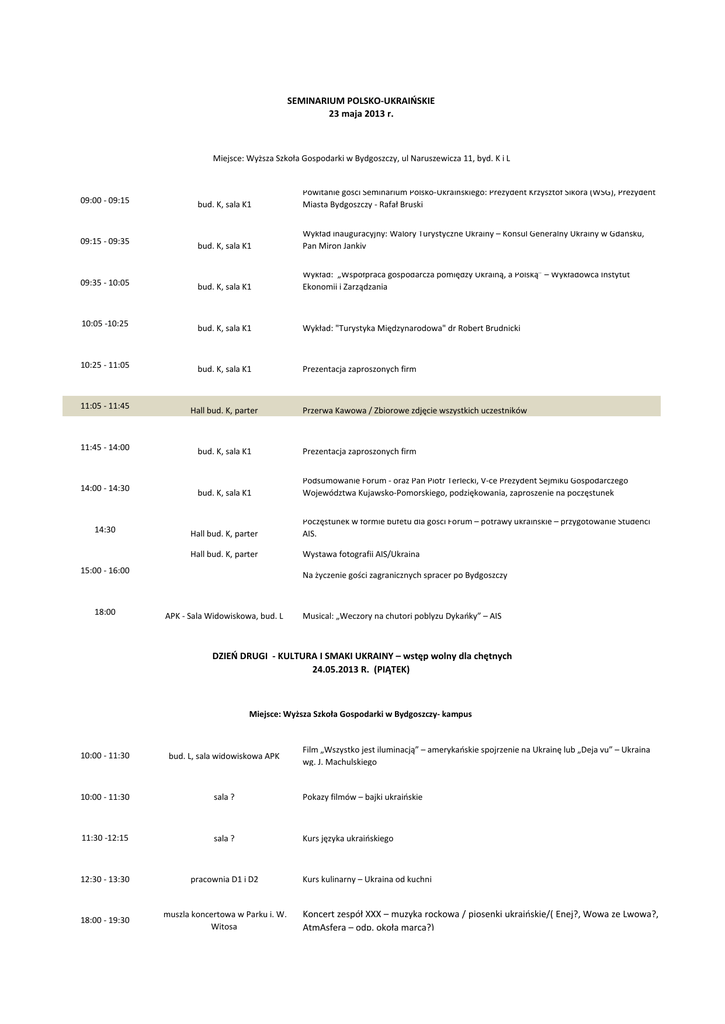 SEMINARIUM POLSKO-UKRAIŃSKIE 23 maja 2013 r. Miejsce: Wyższa Szkoła Gospodarki w Bydgoszczy, ul Naruszewicza 11, byd. K i L 09:00 - 09:15 bud. K, sala K1 Powitanie gości Seminarium Polsko-Ukraińskiego: Prezydent Krzysztof Sikora (WSG), Prezydent Miasta Bydgoszczy - Rafał Bruski 09:15 - 09:35 bud. K, sala K1 Wykład inauguracyjny: Walory Turystyczne Ukrainy – Konsul Generalny Ukrainy w Gdańsku, Pan Miron Jankiv 09:35 - 10:05 bud. K, sala K1 Wykład: „Współpraca gospodarcza pomiędzy Ukrainą, a Polską” – Wykładowca Instytut Ekonomii i Zarządzania 10:05 -10:25 bud. K, sala K1 Wykład: "Turystyka Międzynarodowa" dr Robert Brudnicki 10:25 - 11:05 bud. K, sala K1 Prezentacja zaproszonych firm 11:05 - 11:45 Hall bud. K, parter 11:45 - 14:00 bud. K, sala K1 Prezentacja zaproszonych firm 14:00 - 14:30 bud. K, sala K1 Podsumowanie Forum - oraz Pan Piotr Terlecki, V-ce Prezydent Sejmiku Gospodarczego Województwa Kujawsko-Pomorskiego, podziękowania, zaproszenie na poczęstunek 14:30 Hall bud. K, parter Poczęstunek w formie bufetu dla gości Forum – potrawy ukraińskie – przygotowanie Studenci AIS. Hall bud. K, parter Wystawa fotografii AIS/Ukraina 15:00 - 16:00 18:00 Przerwa Kawowa / Zbiorowe zdjęcie wszystkich uczestników Na życzenie gości zagranicznych spracer po Bydgoszczy APK - Sala Widowiskowa, bud. L Musical: „Weczory na chutori poblyzu Dykańky” – AIS DZIEŃ DRUGI - KULTURA I SMAKI UKRAINY – wstęp wolny dla chętnych 24.05.2013 R. (PIĄTEK) Miejsce: Wyższa Szkoła Gospodarki w Bydgoszczy- kampus Film „Wszystko jest iluminacją” – amerykańskie spojrzenie na Ukrainę lub „Deja vu” – Ukraina wg. J. Machulskiego 10:00 - 11:30 bud. L, sala widowiskowa APK 10:00 - 11:30 sala ? Pokazy filmów – bajki ukraińskie 11:30 -12:15 sala ? Kurs języka ukraińskiego 12:30 - 13:30 pracownia D1 i D2 18:00 - 19:30 muszla koncertowa w Parku i. W. Witosa Kurs kulinarny – Ukraina od kuchni Koncert zespół XXX – muzyka rockowa / piosenki ukraińskie/( Enej?, Wowa ze Lwowa?, AtmAsfera – odp. okoła marca?) od 20:00:00 Broadway Club, Bydgoszcz Impreza klubowa