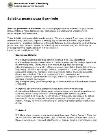 Drawieński Park Narodowy Ścieżka poznawcza Barnimie Ścieżka poznawcza Barnimie Ścieżka poznawcza Barnimie ma na celu pogłębienie wiadomości o przyrodzie Drawieńskiego Parku Narodowego, zachęcenie do uprawiania krajoznawczej turystyki pieszej i rowerowej. Trasę ścieżki można podzielić na dwa etapy. Pierwszy mający 3 km zaczyna się w Barnimiu przy uroczysku Dębina a kończy się na biwaku Barnimie. Wytrwałym proponujemy przejście następnych 4 km do Zatomia bo trasa biegnie wzdłuż Drawy przez uroczysko Drawski Matecznik a kończy się w malowniczej wsi Zatom przy prawdopodobnie najokazalszym w Polsce klonie. Łączny czas przejścia: ok. 3 h Uroczysko Dębina W uroczysku Dębina podlega ochronie ponad 4 ha lasu liściastego grabowo-bukowo-dębowego, wraz z charakterystyczną dla takiego typu lasu roślinnością runa. Grądy, bo o nich mowa, to typ lasu liściastego zdominowanego przez graby, któremu towarzyszą: dęby, buki a także klony, lipy, wiązy. W runie występują: zawilce, przylaszczki, fiołki, gajowce żółte, piżmaczki wiosenne, marzanki wonne, przytulie leśne, bluszcze pospolite. Grądy, w centralnej Polsce są najpospolitszym i dominującym powierzchniowo typem lasu liściastego, jednak w krajobrazie Pomorza ustępują miejsca buczynom. Najładniejsze płaty gradów występują na terenie DPN w dolinach rzek Drawa i Płociczna. W Dębinie obserwuje się starzenie i naturalną dynamikę starego drzewostanu dębowego i bukowego, uwolnionego spod presji gospodarczej. Strefa ochrony ścisłej to obszar ochrony procesów zachodzących w ekosystemach bez względu na ich chwilowy kierunek, obowiązuje tu zakaz ingerencji i nie wykonuje się żadnych zabiegów. Dopuszczony jest zbiór nasion, mający na celu zachowanie puli genowej poszczególnych gatunków drzew. Z historii W 1974 r utworzono rezerwat wodno-krajobrazowy „Rzeka Drawa”. Objął on 37 km odcinek rzeki od wypływu z jez. Dubie w Drawnie do mostu w Głusku. Oprócz samej rzeki, rezerwat objął także jej brzegi, bardzo zróżnicowane pod 1 / 10 Drawieński Park Narodowy Ścieżka poznawcza Barnimie względem krajobrazowym. Cała powierzchnia rezerwatu wynosiła 605,2 ha. Dolinę Drawy porastają cenne starodrzewia wśród których wiele jest zasługujących na miano pomników przyrody buków, dębów i grabów. Drzewa te obsiewają się i odnawiają w sposób naturalny. Dolinę Drawy ze względu na kontrasty krajobrazów roślinnych można zaliczyć do najcenniejszych w kraju. Rezerwat „Rzeka Drawa” posiadał statut wodno-krajobrazowego rezerwatu częściowego a na jego obszarze wydzielono dodatkowo 10 mniejszych rezerwatów ścisłych. Były to: Dębina i Grabowy Jar - dziś na terenie ścieżki dydaktycznej, a także: Drawski Matecznik, Tragankowe Urwisko, Stare Buki, Zawilcowy Las, Łęgi nad Drawą, Poziomkowy Las, Brzezina, Źródliskowy Grąd. W rezerwatach ścisłych znalazły się najbardziej typowe dla tego terenu naturalne zbiorowiska leśne. Nazwy które im nadano, odzwierciedlają po dzień dzisiejszy walory poszczególnych powierzchni. W 1990 rezerwat „Rzeka Drawa” wszedł w skład DPN a rezerwaty stały się strefami ochrony ścisłej Drawieńskiego Parku Narodowego. Drzewa Parku - pomnikowe dęby Dęby rosnące na ścieżce to dęby szypułkowe, mające ponad 250 lat. Są pozostałością po prastarej puszczy porastającej kiedyś znaczne obszary naszego kraju. Dąb szypułkowy jest okazałym drzewem osiągającym do 40 m wysokości. Posiada szeroką koronę, zazwyczaj krótki pień, grube konary. Kora jest ciemna, głęboko spękana. Liście są skórzaste z 3-6 parami zaokrąglonych klap, niesymetryczne, ogonki są bardzo krótkie. Kwiaty małe, rozdzielnopłciowe, rosnące na tym samym drzewie. Męskie to zielonkawe kotki, zwisające, skupione na cienkich szypułkach u podstaw młodych pędów. Żeńskie zebrane są po kilka na końcach pędów. Owocami są żołędzie osadzone na płaskiej miseczce, na długiej szypułce. Dąb bezszypułkowy jest obok dębu szypułkowego, rodzimym gatunkiem dębu występującego w Puszczy Drawskiej. Od dębu szypułkowego różni się: żołędziami osadzonymi wprost na gałązkach (nie na szypułkach), liśćmi o bardzo regularnym kształcie i najczęściej klinowatej nasadzie, płytko i regularnie spękaną korą. Zazwyczaj ma też smukły pokrój, cechujący się prostym i wyżej ugałęzionym pniem. Dąb ten może rosnąć na siedliskach uboższych i bardziej suchych niż jego szypułkowy krewniak. Jest on podstawowym gatunkiem lasotwórczym ubogich dąbrów oraz pospolitą domieszką w drzewostanach buczyn. To właśnie dąb bezszypułkowy wkracza także na najuboższe siedliska, towarzysząc tam sośnie pospolitej. Jego wąskosłoite drewno należy do najcenniejszych surowców drzewnych, będąc cenione wyżej, niż drewno jego szypułkowego krewniaka. Dla dębu bezszypułkowego Puszcza Drawska jest jednym z krajowych centrów jego występowania. Dęby w uroczysku Radęcin, osiągają blisko 50m wysokości, należą do największych w Polsce. Drzewostany dębowe w 2 / 10 Drawieński Park Narodowy Ścieżka poznawcza Barnimie Nadleśnictwie Krzyż (tuż na południe od otuliny Drawieńskiego Parku Narodowego) należą do najlepszych pod względem jakościowym drzewostanów dębowych w Polsce. Chociaż najsławniejsze i największe dęby w kraju to dęby szypułkowe, w Puszczy Drawskiej zachowało się wiele monumentalnych okazów bezszypułkowego - oprócz wymienionych już dębów w „Radęcinie” np. dąb w uroczysku Makowy Ostrów k. Łaska i kilka innych. Dąb jest drzewem długowiecznym. W naszych warunkach klimatycznych żyje średnio do 800 lat. Drzewa Parku - pomnikowe buki „Tam rosło największe ze wszystkich drzew. Potężny gładki pień połyskiwał ciemnym srebrem, a wystrzelał w górę wysoko jak wieża i wysoko nad ziemią rozpościerał pierwsze konary nakryte cienistą kopułą liści”. Tak Tolkie