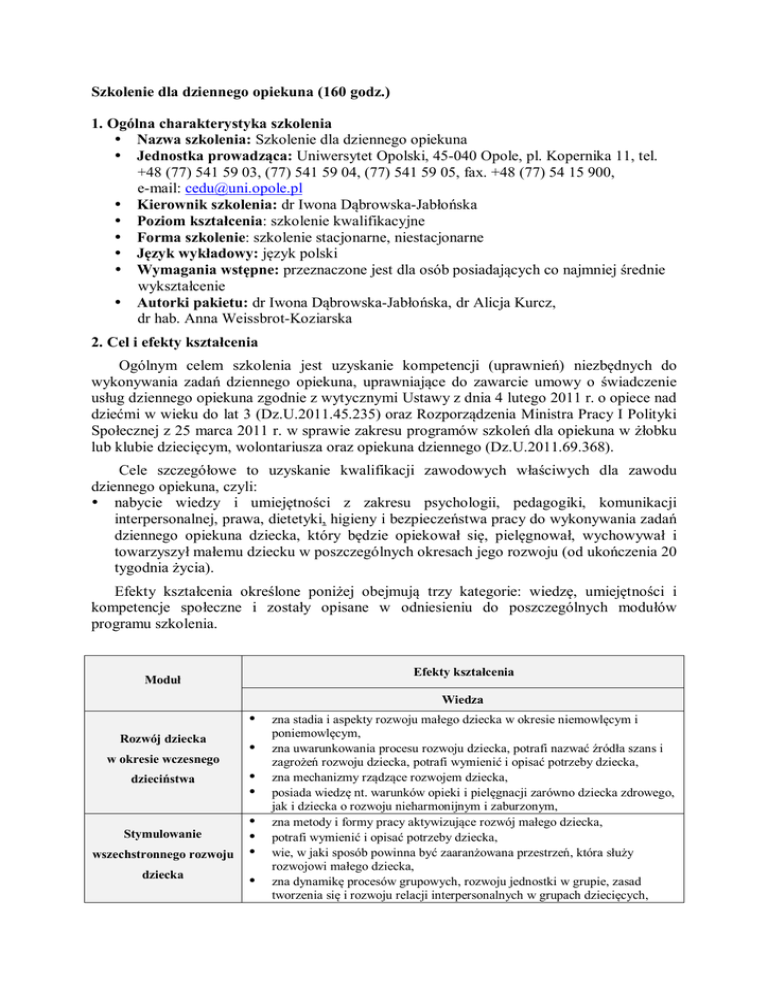 Szkolenie dla dziennego opiekuna (160 godz.) 1. Ogólna charakterystyka szkolenia Nazwa szkolenia: Szkolenie dla dziennego opiekuna Jednostka prowadząca: Uniwersytet Opolski, 45-040 Opole, pl. Kopernika 11, tel. +48 (77) 541 59 03, (77) 541 59 04, (77) 541 59 05, fax. +48 (77) 54 15 900, e-mail: [email protected] Kierownik szkolenia: dr Iwona Dąbrowska-Jabłońska Poziom kształcenia: szkolenie kwalifikacyjne Forma szkolenie: szkolenie stacjonarne, niestacjonarne Język wykładowy: język polski Wymagania wstępne: przeznaczone jest dla osób posiadających co najmniej średnie wykształcenie Autorki pakietu: dr Iwona Dąbrowska-Jabłońska, dr Alicja Kurcz, dr hab. Anna Weissbrot-Koziarska 2. Cel i efekty kształcenia Ogólnym celem szkolenia jest uzyskanie kompetencji (uprawnień) niezbędnych do wykonywania zadań dziennego opiekuna, uprawniające do zawarcie umowy o świadczenie usług dziennego opiekuna zgodnie z wytycznymi Ustawy z dnia 4 lutego 2011 r. o opiece nad dziećmi w wieku do lat 3 (Dz.U.2011.45.235) oraz Rozporządzenia Ministra Pracy I Polityki Społecznej z 25 marca 2011 r. w sprawie zakresu programów szkoleń dla opiekuna w żłobku lub klubie dziecięcym, wolontariusza oraz opiekuna dziennego (Dz.U.2011.69.368). Cele szczegółowe to uzyskanie kwalifikacji zawodowych właściwych dla zawodu dziennego opiekuna, czyli: nabycie wiedzy i umiejętności z zakresu psychologii, pedagogiki, komunikacji interpersonalnej, prawa, dietetyki, higieny i bezpieczeństwa pracy do wykonywania zadań dziennego opiekuna dziecka, który będzie opiekował się, pielęgnował, wychowywał i towarzyszył małemu dziecku w poszczególnych okresach jego rozwoju (od ukończenia 20 tygodnia życia). Efekty kształcenia określone poniżej obejmują trzy kategorie: wiedzę, umiejętności i kompetencje społeczne i zostały opisane w odniesieniu do poszczególnych modułów programu szkolenia. Efekty kształcenia Moduł Wiedza Rozwój dziecka w okresie wczesnego dzieciństwa wszechstronnego rozwoju Stymulowanie dziecka zna stadia i aspekty rozwoju małego dziecka w okresie niemowlęcym i poniemowlęcym, zna uwarunkowania procesu rozwoju dziecka, potrafi nazwać źródła szans i zagrożeń rozwoju dziecka, potrafi wymienić i opisać potrzeby dziecka, zna mechanizmy rządzące rozwojem dziecka, posiada wiedzę nt. warunków opieki i pielęgnacji zarówno dziecka zdrowego, jak i dziecka o rozwoju nieharmonijnym i zaburzonym, zna metody i formy pracy aktywizujące rozwój małego dziecka, potrafi wymienić i opisać potrzeby dziecka, wie, w jaki sposób powinna być zaaranżowana przestrzeń, która służy rozwojowi małego dziecka, zna dynamikę procesów grupowych, rozwoju jednostki w grupie, zasad tworzenia się i rozwoju relacji interpersonalnych w grupach dziecięcych, Kompetencje opiekuna dziecka wie, jakie warunki sprzyjają tworzeniu się więzi i relacji interpersonalnych małych dzieci, wie i zna kryteria doboru zabawek dla dziecka w różnych fazach jego rozwoju, zna i stosuje zasady pielęgnacji dziecka zdrowego, zna zasady bezpieczeństwa, udzielania pierwszej pomocy i odpowiedzialności prawnej opiekuna, zna zasady dotyczące profilaktyki i ochrony zdrowia oraz zapobiegania wypadkom, posiada wiedzę dotyczącą prawnych aspektów opieki nad dzieckiem oraz ochrony przed krzywdzeniem, Umiejętności Rozwój dziecka w okresie wczesnego dzieciństwa Stymulowanie wszechstronnego rozwoju dziecka Kompetencje opiekuna dziecka Rozwój dziecka w okresie wczesnego dzieciństwa Stymulowanie wszechstronnego rozwoju dziecka Kompetencje opiekuna potrafi obserwować i interpretować zachowania dziecka, potrafi zidentyfikować aktualne stadium rozwoju dziecka oraz rozpoznawać sygnały dzieci, dotyczące np. potrzeb fizjologicznych, zmęczenia itp., potrafi zidentyfikować czynniki sprzyjające i zagrażające rozwojowi dziecka istniejące w jego najbliższym środowisku, potrafi sprawować opiekę i pielęgnować zarówno dzieci zdrowe, jak i z objawami choroby, potrafi dostrzegać problemy rozwojowe, z którymi borykają się dzieci i ocenić czy potrzebne jest w danej sytuacji wsparcie specjalisty, potrafi zastosować odpowiednie metody i formy pracy aktywizujące rozwój małego dziecka, potrafi zdiagnozować stan zaspokojenia potrzeb małego dziecka, potrafi zaaranżować przestrzeń i zorganizować zajęcia wzbudzające zainteresowanie dzieci, np. zajęcia ruchowe, plastyczne, muzyczne, manipulacyjno-konstrukcyjne, dydaktyczne, kulinarne, przyrodnicze itp., potrafi zaproponować dziecku odpowiednią do jego wieku zabawę i bezpieczne zabawki, potrafi dostosować czynności pielęgnacyjne do specyficznych potrzeb dziecka, potrafi prawidłowo zareagować i wskazać możliwości pomocy i wsparcia w przypadku dostrzeżenia faktu krzywdzenia dziecka, potrafi udzielić dziecku pierwszej pomocy przedlekarskiej, np. w sytuacji zakrztuszenia, poparzenia itp., potrafi wcielać w życie zasady bezpieczeństwa i higieny pracy, Kompetencje społeczne akceptuje doznania dziecka związane np. z zaspokajaniem potrzeb fizjologicznych, takich jak karmienie, mycie, przewijanie itp., jest cierpliwy i akceptujący wobec swoich podopiecznych, zdając sobie sprawę z prawidłowości, jakie rządzą rozwojem dzieci, szanuje odrębność i niepowtarzalność drugiej osoby, jest uważny w obserwowaniu otoczenia i innych osób, ma przekonanie o potrzebie stosowania oddziaływań stymulujących we wszystkich sferach rozwoju małego dziecka, jest refleksyjny w wyborze programu stymulującego rozwój dziecka, potrafi komunikować się z dzieckiem, stawiać mu pytania, aktywnie słuchać, prowadzić rozmowę, stymulować rozwój językowy, posiada umiejętność pracy z grupą, potrafi stymulować interakcje między dziećmi, ma w sobie otwartość i gotowość do zabawy, jest twórczy, ale potrafi także podążać za pomysłami i propozycjami innych, cechuje go życzliwość wobec innych osób, elastyczność w dzia