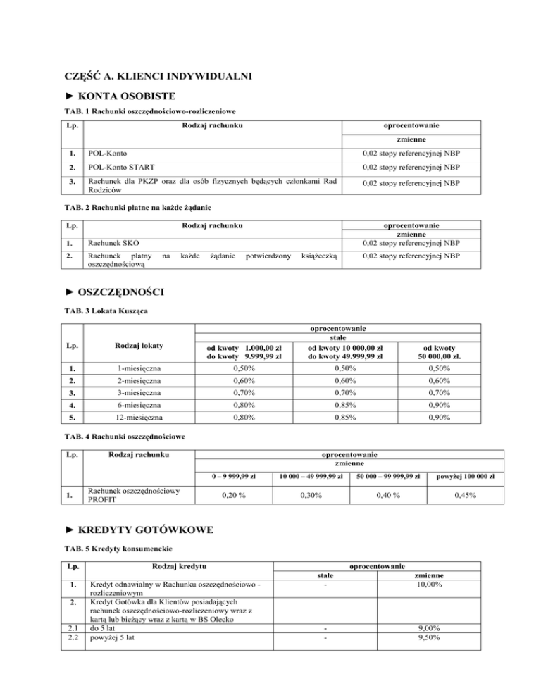CZĘŚĆ A. KLIENCI INDYWIDUALNI ► KONTA OSOBISTE TAB. 1 Rachunki oszczędnościowo-rozliczeniowe Lp. Rodzaj rachunku oprocentowanie zmienne 1. POL-Konto 0,02 stopy referencyjnej NBP 2. POL-Konto START 0,02 stopy referencyjnej NBP 3. Rachunek dla PKZP oraz dla osób fizycznych będących członkami Rad Rodziców 0,02 stopy referencyjnej NBP TAB. 2 Rachunki płatne na każde żądanie Lp. Rodzaj rachunku 1. Rachunek SKO 2. Rachunek płatny oszczędnościową na każde żądanie oprocentowanie zmienne 0,02 stopy referencyjnej NBP potwierdzony książeczką 0,02 stopy referencyjnej NBP ► OSZCZĘDNOŚCI TAB. 3 Lokata Kusząca Lp. Rodzaj lokaty od kwoty 1.000,00 zł do kwoty 9.999,99 zł oprocentowanie stałe od kwoty 10 000,00 zł do kwoty 49.999,99 zł 1. 1-miesięczna 0,50% 0,50% 0,50% 2. 2-miesięczna 0,60% 0,60% 0,60% 3. 3-miesięczna 0,70% 0,70% 0,70% 4. 6-miesięczna 0,80% 0,85% 0,90% 5. 12-miesięczna 0,80% 0,85% 0,90% od kwoty 50 000,00 zł. TAB. 4 Rachunki oszczędnościowe Lp. 1. Rodzaj rachunku oprocentowanie zmienne 0 – 9 999,99 zł 10 000 – 49 999,99 zł 50 000 – 99 999,99 zł powyżej 100 000 zł 0,20 % 0,30% 0,40 % 0,45% Rachunek oszczędnościowy PROFIT ► KREDYTY GOTÓWKOWE TAB. 5 Kredyty konsumenckie Lp. 1. 2. 2.1 2.2 Rodzaj kredytu Kredyt odnawialny w Rachunku oszczędnościowo rozliczeniowym Kredyt Gotówka dla Klientów posiadających rachunek oszczędnościowo-rozliczeniowy wraz z kartą lub bieżący wraz z kartą w BS Olecko do 5 lat powyżej 5 lat oprocentowanie stałe - zmienne 10,00% - 9,00% 9,50% Bank Spółdzielczy w Olecku 3. 3.1 3.2 Kredyt Gotówka dla Klientów nie posiadających rachunku oszczędnościowo-rozliczeniowego lub bieżącego w BS w Olecku do 5 lat powyżej 5 lat - 9,90% 10,00% ► KREDYTY KONSOLIDACYJNE TAB. 6 Kredyty konsolidacyjne Lp. 1.1 1.2 1.3 Rodzaj kredytu Kredyt konsolidacyjny - zabezpieczony hipotecznie (umowy zawarte od dnia 18 września 2012 roku) Kredyt konsolidacyjny – niezabezpieczony hipotecznie Kredyt konsolidacyjny - zabezpieczony hipotecznie (umowy zawarte do dnia 17 września 2012 roku) oprocentowanie zmienne WIBOR 3M + marża 7,00 p.p. 10,00% 8,90% W przypadku nieprzedstawienia zabezpieczenia przejściowego tj. do czasu otrzymania przez Bank odpisu z księgi wieczystej nieruchomości stanowiącej zabezpieczenie kredytu z prawomocnym wpisem hipoteki, podwyższa się oprocentowanie o 0,50 p.p. ► KREDYTY HIPOTECZNE TAB. 7 Kredyty mieszkaniowe Lp. 1. 1.1 1.2 2. 2.1 2.2 Rodzaj kredytu Kredyt mieszkaniowy dla Klientów posiadających rachunek oszczędnościowo-rozliczeniowy wraz z kartą lub bieżący wraz z kartą w BS w Olecku Kwota kredytu przekracza 80 % wartości nieruchomości będącej zabezpieczeniem Kwota kredytu nie przekracza 80 % wartości nieruchomości będącej zabezpieczeniem Kredyt mieszkaniowy dla Klientów nie posiadających rachunku oszczędnościowo-rozliczeniowego lub bieżącego w BS w Olecku Kwota kredytu przekracza 80 % wartości nieruchomości będącej zabezpieczeniem Kwota kredytu nie przekracza 80 % wartości nieruchomości będącej zabezpieczeniem oprocentowanie zmienne WIBOR 3M + marża 3,00 pp WIBOR 3M + marża 2,50 pp WIBOR 3M + marża 3,75 pp WIBOR 3M + marża 3,25 pp W przypadku nieprzedstawienia zabezpieczenia przejściowego tj. do czasu otrzymania przez Bank odpisu z księgi wieczystej nieruchomości stanowiącej zabezpieczenie kredytu z prawomocnym wpisem hipoteki, podwyższa się marżę o 0,50 p.p. TAB. 8 Kredyty hipoteczne Lp. 1. 1.1 2. 2.1 Rodzaj kredytu Kredyt hipoteczny dla Klientów posiadających rachunek oszczędnościoworozliczeniowy wraz z kartą lub bieżący wraz z kartą w BS Olecko do 15 lat Kredyt hipoteczny dla Klientów nie posiadających rachunku oszczędnościowo-rozliczeniowego lub bieżącego w BS Olecko do 15 lat oprocentowanie zmienne WIBOR 3M + marża 5,00 pp WIBOR 3M + marża 6,00 pp W przypadku nieprzedstawienia zabezpieczenia przejściowego tj. do czasu otrzymania przez Bank odpisu z księgi wieczystej nieruchomości stanowiącej zabezpieczenie kredytu z prawomocnym wpisem hipoteki, podwyższa się marżę o 0,50 p.p. Tabela oprocentowania produktów bankowych Banku Spółdzielczego w Olecku Bank Spółdzielczy w Olecku ► Produkty i usługi wycofane z oferty Banku TAB. 9 Lokaty terminowe Lp. Rodzaj lokaty 1. 2. 3. 4. 5. 6. 7. 1-miesięczna 2-miesięczna 3-miesięczna 6-miesięczna 12-miesięczna 24-miesięczna 36-miesięczna od kwoty 200,00 zł do kwoty 9.999,99 zł 0,01% 0,01% 0,01% 0,01% 0,01% 0,01% 0,01% oprocentowanie zmienne od kwoty 10 000,00 zł do kwoty 49.999,99 zł 0,01% 0,01% 0,01% 0,01% 0,01% 0,01% 0,01% od kwoty 50 000,00 zł. 0,01% 0,01% 0,01% 0,01% 0,01% 0,01% 0,01% TAB. 10 Książeczki mieszkaniowe Lp. 1. Rodzaj rachunku oprocentowanie zmienne 1,00% Książeczka mieszkaniowa TAB. 11 Kredyty konsumenckie udzielane do dnia 10 kwietnia 2016r. Lp. 3. 3.1 3.2 4. 5. 6. 6.1 6.2 7. 8. Rodzaj kredytu Kredyt gotówkowy dla Klientów posiadających rachunek oszczędnościowo-rozliczeniowy wraz z kartą lub bieżący wraz z kartą w BS w Olecku do 5 lat powyżej 5 lat Bezpieczna gotówka do 60 m-cy dla Klientów posiadających rachunek oszczędnościoworozliczeniowy wraz z kartą lub bieżący wraz z kartą w BS w Olecku Lekka gotówka do 60 m-cy dla Klientów posiadających rachunek oszczędnościoworozliczeniowy wraz z kartą lub bieżący wraz z kartą w BS w Olecku Kredyt gotówkowy dla Klientów nie posiadających rachunku oszczędnościowo-rozliczeniowego lub bieżącego w BS w Olecku do 5 lat powyżej 5 lat Bezpieczna gotówka do 60 m-cy dla Klientów nie posiadających rachunku oszczędnościoworozliczeniowego lub bieżącego w BS w Olecku Lekka gotówka do 60 m-cy dla Klientów nie posiadających rachunku oszczędnościoworozliczeniowego lub bieżącego w BS w Olecku Tabela oprocentowania produktów bankowych Banku Spółdzielczego w Olecku oprocentowanie stałe zmienne - 10,00% 10,00% 10,00% 9,90% - 10,00% 10,00% 10,00% 9,90% Bank Spół