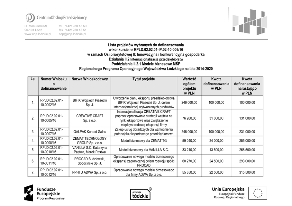 ul. Moniuszki7/9 90-101 Łódź www.cop.lodzkie.pl tel. /+42/ 230 15 50 fax /+42/ 230 15 51 [email protected] Lista projektów wybranych do dofinansowania w konkursie nr RPLD.02.02.01-IP.02-10-006/16 w ramach Osi priorytetowej II: Innowacyjna i konkurencyjna gospodarka Działania II.2 Internacjonalizacja przedsiębiorstw Poddziałania II.2.1 Modele biznesowe MŚP Regionalnego Programu Operacyjnego Województwa Łódzkiego na lata 2014-2020 Lp. Numer Wniosku o dofinansowanie Nazwa Wnioskodawcy 1. RPLD.02.02.0110-0002/16 BIFIX Wojciech Piasecki Sp. J. 2. RPLD.02.02.0110-0005/16 CREATIVE CRAFT Sp. z o.o. RPLD.02.02.0110-0007/16 RPLD.02.02.0110-0008/16 RPLD.02.02.0110-0010/16 ZEMAT TECHNOLOGY GROUP Sp. z o.o. VANILLA S.C. Katarzyna Pastwa, Marek Pastwa 6. RPLD.02.02.0110-0011/16 PROCAD Budziewski, Sobociński Sp. J. 7. RPLD.02.02.0110-0012/16 PPHTU ADWA Sp. z o.o. 3. 4. 5. GALPAK Konrad Galas Tytuł projektu Wartość ogółem projektu w PLN Kwota dofinansowania w PLN Kwota dofinansowania narastająco w PLN 246 000,00 100 000,00 100 000,00 76 260,00 31 000,00 131 000,00 246 000,00 100 000,00 231 000,00 Model biznesowy dla ZEMAT TG 59 040,00 24 000,00 255 000,00 Model biznesowy dla VANILLA S.C. 33 210,00 13 500,00 268 500,00 60 270,00 24 500,00 293 000,00 55 350,00 22 500,00 315 500,00 Utworzenie planu eksportu przedsiębiorstwa BIFIX Wojciech Piasecki Sp. J. celem internacjonalizacji wytwarzanych produktów Internacjonalizacja CREATIVE CRAFT poprzez opracowanie strategii wejścia na rynki eksportowe oraz zwiększenie międzynarodowej ekspansji firmy Zakup usług doradczych dla wzmocnienia potencjału eksportowego przedsiębiorstwa Opracowanie nowego modelu biznesowego ekspansji zagranicznej celem rozwoju spółki PROCAD Opracowanie nowego modelu biznesowego dla firmy ADWA Sp. z o.o. 8. RPLD.02.02.0110-0013/16 NOWA SZKOŁA Sp. z o.o. 9. RPLD.02.02.0110-0015/16 COMPLETE BRAND MANAGEMENT Sp. z o.o. Sp. k. 10. RPLD.02.02.0110-0016/16 ORION EXHAUST PARTS Rafał Matusiewicz 11. RPLD.02.02.0110-0017/16 GroMar Sp. z o.o. 12. RPLD.02.02.0110-0018/16 "FIORE" Gernant, Biernacki i Tomas Sp. J. 13. RPLD.02.02.0110-0019/16 BUSINESS CONSULTING Witold Łuczyński 14. RPLD.02.02.0110-0020/16 AGRECOL Sp. z o.o. 15. RPLD.02.02.0110-0021/16 GRANEX Sp. z o.o. 16. RPLD.02.02.0110-0023/16 SULIMAR Sp. z o.o. 17. RPLD.02.02.0110-0026/16 Staltech Polska Sp. z o.o. 18. RPLD.02.02.0110-0027/16 PACKSERVICE Sp. z o.o. Opracowanie nowego modelu biznesowego dla przedsiębiorstwa NOWA SZKOŁA Sp. z o.o. Internacjonalizacja działalności przedsiębiorstwa poprzez opracowanie modelu biznesowego zmierzającego do internacjonalizacji działalności Rozwój działań eksportowych przedsiębiorstwa ORION EXHAUST PARTS poprzez opracowanie kompleksowej strategii internacjonalizacji Opracowanie nowego modelu biznesowego dla firmy GroMar, zmierzającego do jego internacjonalizacji Internacjonalizacja firmy FIORE poprzez zakup nowego modelu biznesowego Opracowanie nowego modelu biznesowego określającego rozszerzenie działalności o sprzedaż eksportową Opracowanie planu rozwoju eksportu dla firmy AGRECOL w celu wejścia na nowe rynki zbytu Opracowanie strategii podboju rynków zagranicznych instrumentem rozwoju firmy Opracowanie strategii biznesowej firmy SULIMAR w kierunku rozpoczęcia eksportu prozdrowotnego napoju funkcjonalnego Nabycie usługi doradczej mającej na celu opracowanie nowego modelu biznesowego firmy dla rozpoczęcia jej działalności eksportowej Rozwój spółki poprzez eksport – przygotowanie nowego modelu biznesowego 73 800,00 30 000,00 345 500,00 76 260,00 31 000,00 376 500,00 76 260,00 31 000,00 407 500,00 233 700,00 95 000,00 502 500,00 43 050,00 17 500,00 520 000,00 97 170,00 39 500,00 559 500,00 123 000,00 50 000,00 609 500,00 61 500,00 25 000,00 634 500,00 36 900,00 15 000,00 649 500,00 55 350,00 22 500,00 672 000,00 49 200,00 20 000,00 692 000,00 19. RPLD.02.02.0110-0029/16 WZORCOWNIA Agnieszka DębeckaMurzyniak 20. RPLD.02.02.0110-0031/16 SAGITTARIUS GROUP Sp. z o.o. 21. RPLD.02.02.0110-0032/16 HIGIENIX Andrzej Baryga RPLD.02.02.0110-0033/16 RPLD.02.02.0110-0034/16 RPLD.02.02.0110-0035/16 Doradztwo Tomasz Wróblewski TW Consulting BUSINESS IN RUSSIA Sp. z o.o. TAMARA GIBUS – MARA GIBBUCCI 25. RPLD.02.02.0110-0037/16 ARES Bracia Maciołek Sp. z o.o. 26. RPLD.02.02.0110-0038/16 PPHU FEMI Sławomir Mikołajczyk 27. RPLD.02.02.0110-0039/16 Master Pharm S.A. 28. RPLD.02.02.0110-0041/16 Paweł Nowak – AGROMASZ 22. 23. 24. Opracowanie nowego modelu biznesowego firmy WZORCOWNIA Agnieszka DębeckaMurzyniak Opracowanie nowego modelu biznesowego internacjonalizacji przedsiębiorstwa SAGITTARIUS zmierzającego do wejścia na rynki Europy Zachodniej i Ameryki Północnej z narzędziem dla systemów nawigacji GPS Zielona Fala Opracowanie planu ekspansji na rynki zagraniczne podstawą dalszego rozwoju formy HIGIENIX 123 000,00 50 000,00 742 000,00 99 630,00 40 500,00 782 500,00 73 800,00 30 000,00 812 500,00 Model biznesowy dla TW Consulting 71 340,00 29 000,00 841 500,00 Nowe horyzonty dla BUSINESS IN RUSSIA 55 350,00 22 500,00 864 000,00 Perspektywy rozwoju MARY GIBBUCCI 36 900,00 15 000,00 879 000,00 76 260,00 31 000,00 910 000,00 76 260,00 31 000,00 941 000,00 76 260,00 31 000,00 972 000,00 49 200,00 20 000,00 992 000,00 Opracowanie strategii rozwoju eksportu w celu internacjonalizacji firmy ARES Bracia Maciołek Poszerzenie i dywersyfikacja ekspansji zagranicznej przedsiębiorstwa PPHU FEMI poprzez opracowanie modelu biznesowego zmierzającego do internacjonalizacji działalności Internacjonalizacja Master Pharm poprzez opracowanie strategii wejścia na rynki eksportowe oraz zwiększenie międzynarodowej ekspansji firmy Rozwój działalności eksportowej poprzez opracowanie nowego modelu biznesowego prowadzącego do internacjonalizacji przedsiębiorstwa 29. RPLD.02.02.0110-0044/16 SENSILAB POLSKA Sp. z o.o. Sp. k-a 30. RPLD.02.02.0110-0045/16 KĘDZIOREK Joanna Kędziorek RPLD.02.02.0110-0047/16 RPLD.02.0