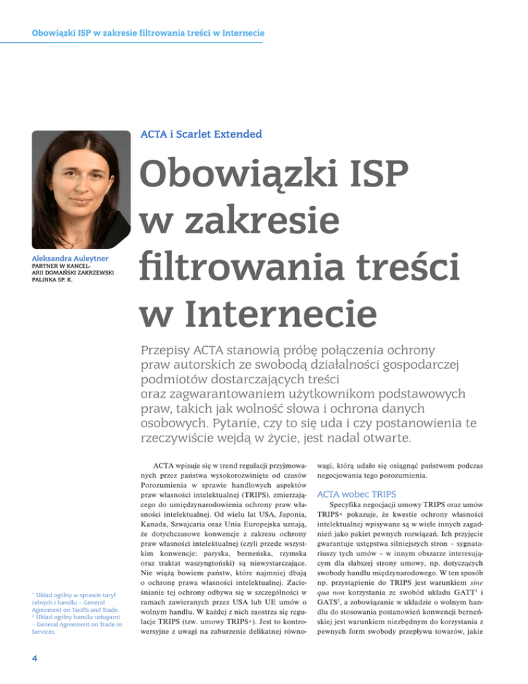 Obowiązki ISP w zakresie filtrowania treści w Internecie ACTA i Scarlet Extended Aleksandra Auleytner PARTNER W KANCELARII DOMAŃSKI ZAKRZEWSKI PALINKA SP. K. Obowiązki ISP w zakresie filtrowania treści w Internecie Przepisy ACTA stanowią próbę połączenia ochrony praw autorskich ze swobodą działalności gospodarczej podmiotów dostarczających treści oraz zagwarantowaniem użytkownikom podstawowych praw, takich jak wolność słowa i ochrona danych osobowych. Pytanie, czy to się uda i czy postanowienia te rzeczywiście wejdą w życie, jest nadal otwarte. Układ ogólny w sprawie taryf celnych i handlu – General Agreement on Tariffs and Trade. 2 Układ ogólny handlu usługami – General Agreement on Trade in Services. 1 4 ACTA wpisuje się w trend regulacji przyjmowanych przez państwa wysokorozwinięte od czasów Porozumienia w sprawie handlowych aspektów praw własności intelektualnej (TRIPS), zmierzającego do umiędzynarodowienia ochrony praw własności intelektualnej. Od wielu lat USA, Japonia, Kanada, Szwajcaria oraz Unia Europejska uznają, że dotychczasowe konwencje z zakresu ochrony praw własności intelektualnej (czyli przede wszystkim konwencje: paryska, berneńska, rzymska oraz traktat waszyngtoński) są niewystarczające. Nie wiążą bowiem państw, które najmniej dbają o ochronę prawa własności intelektualnej. Zacieśnianie tej ochrony odbywa się w szczególności w ramach zawieranych przez USA lub UE umów o wolnym handlu. W każdej z nich zaostrza się regulacje TRIPS (tzw. umowy TRIPS+). Jest to kontrowersyjne z uwagi na zaburzenie delikatnej równo- wagi, którą udało się osiągnąć państwom podczas negocjowania tego porozumienia. ACTA wobec TRIPS Specyfika negocjacji umowy TRIPS oraz umów TRIPS+ pokazuje, że kwestie ochrony własności intelektualnej wpisywane są w wiele innych zagadnień jako pakiet pewnych rozwiązań. Ich przyjęcie gwarantuje ustępstwa silniejszych stron – sygnatariuszy tych umów – w innym obszarze interesującym dla słabszej strony umowy, np. dotyczących swobody handlu międzynarodowego. W ten sposób np. przystąpienie do TRIPS jest warunkiem sine qua non korzystania ze swobód układu GATT1 i GATS2, a zobowiązanie w układzie o wolnym handlu do stosowania postanowień konwencji berneńskiej jest warunkiem niezbędnym do korzystania z pewnych form swobody przepływu towarów, jakie PRAWO I REGULACJE § Kontrowersje gwarantuje strefa wolnego handlu. ACTA swoim charakterem przypomina również umowy TRIPS+, ale różni się od nich m.in. tym, że jest pierwszym instrumentem międzynarodowego prawa własności intelektualnej, który podejmuje tak szczegółowo temat naruszeń praw własności intelektualnej w środowisku cyfrowym. W związku z tym ustanawia również ramy prawne regulujące zasady dotyczące ujawniania przez pośredników w dostępie do usług internetowych (ISP) informacji o podmiotach naruszających prawa własności intelektualnej. Filtrowanie treści w Internecie w prawie UE w Scarlet Extended Jak pamiętamy, do tej pory w prawie UE kwestie udostępniania tych informacji regulują m.in.: – dyrektywa 2000/31/WE w sprawie niektórych aspektów prawnych usług społeczeństwa informacyjnego (dyrektywa o handlu elektronicznym), – dyrektywa 2002/58/WE o prywatności i łączności elektronicznej, – dyrektywa 2001/29/WE w sprawie harmonizacji niektórych aspektów praw autorskich i pokrewnych w społeczeństwie informacyjnym oraz – dyrektywa 2004/48/WE o egzekwowaniu własności intelektualnej. Przepisy te zostały implementowane do polskiego prawa m.in. w Ustawie o świadczeniu usług drogą elektroniczną oraz w Ustawie o prawie autorskim i prawach pokrewnych. Szczegółowe relacje pomiędzy ACTA swoim charakterem przypomina również umowy TRIPS+, ale różni się od nich m.in. tym, że jest pierwszym instrumentem międzynarodowego prawa własności intelektualnej, który podejmuje tak szczegółowo temat naruszeń praw własności intelektualnej w środowisku cyfrowym. przepisami określone zostały w wyrokach Trybunału Sprawiedliwości Unii Europejskiej (TSUE), tj. Promusicae (C-275/06), L’Oréal (C‑324/09) oraz w najnowszym i najbardziej wyczerpującym orzeczeniu z 24.11.2011 r. w sprawie SABAM vs. Scarlet Extended (C-70/10). Z orzecznictwa TSUE wynika, że ochrona prawa własności intelektualnej (wymienionego w Karcie praw podstawowych3 jako jedno z praw podstawowych) powinna zostać wyważona względem ochrony innych praw podstawowych. Dlatego (zgodnie z wyrokiem w sprawie SABAM vs. Scarlet Extended) nakaz nakładający na danego ISP (Internet Service Provider – dostawcę usług internetowych) obowiązek wdrożenia sytemu filtrowania, który wymagałby od niego prowadzenia aktywnego, stałego nadzoru nad wszystkimi danymi każdego z jego klientów w celu zapobieżenia wszelkim przyszłym naruszeniom praw własności intelektualnej, byłby sprzeczny z art. 15 ust. 1 dyrektywy 2000/31/ WE (zakaz nakładania obowiązku monitorowania informacji). Nakaz taki byłby też niezgodny z art. 3 ust. 1 dyrektywy 2004/48/WE, który wymaga, by środki służące zapewnieniu poszanowania praw własności intelektualnej nie były nadmiernie skomplikowane czy kosztowne. Ponadto naruszałby: – swobodę prowadzenia działalności gospodarczej, z której korzystają ISP (chronioną na mocy art. 16 Karty praw podstawowych), ponieważ zobowiązywałby ISP do wprowadzenia złożonego, kosztownego i trwałego systemu informatycznego na jego własny koszt; – prawa podstawowe klientów ISP, tj. prawo do ochrony danych osobowych oraz wolność otrzymywania i przekazywania informacji, chronione przez art. 8 i 11 Karty praw podstawowych – pociągałby za sobą bowiem konieczność gromadzenia i identyfikację adresów IP użytkowników, od których pochodzą przesłane w sieci nielegalne treści. Adresy te stanowią dane osobowe, jako że pozwalają na precyzyjną identyfikację tych uż