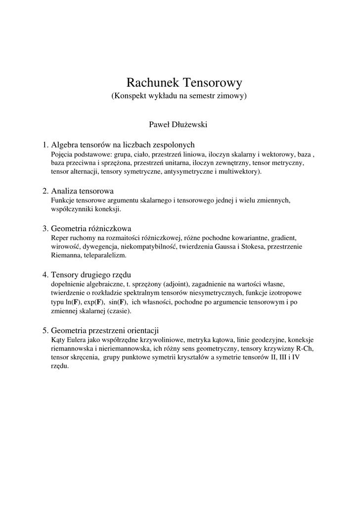 Rachunek Tensorowy (Konspekt wykładu na semestr zimowy) Paweł Dłużewski 1. Algebra tensorów na liczbach zespolonych Pojęcia podstawowe: grupa, ciało, przestrzeń liniowa, iloczyn skalarny i wektorowy, baza , baza przeciwna i sprzężona, przestrzeń unitarna, iloczyn zewnętrzny, tensor metryczny, tensor alternacji, tensory symetryczne, antysymetryczne i multiwektory). 2. Analiza tensorowa Funkcje tensorowe argumentu skalarnego i tensorowego jednej i wielu zmiennych, współczynniki koneksji. 3. Geometria różniczkowa Reper ruchomy na rozmaitości różniczkowej, różne pochodne kowariantne, gradient, wirowość, dywegencja, niekompatybilność, twierdzenia Gaussa i Stokesa, przestrzenie Riemanna, teleparalelizm. 4. Tensory drugiego rzędu dopełnienie algebraiczne, t. sprzężony (adjoint), zagadnienie na wartości własne, twierdzenie o rozkładzie spektralnym tensorów niesymetrycznych, funkcje izotropowe typu ln(F), exp(F), sin(F), ich własności, pochodne po argumencie tensorowym i po zmiennej skalarnej (czasie). 5. Geometria przestrzeni orientacji Kąty Eulera jako współrzędne krzywoliniowe, metryka kątowa, linie geodezyjne, koneksje riemannowska i nieriemannowska, ich różny sens geometryczny, tensory krzywizny R-Ch, tensor skręcenia, grupy punktowe symetrii kryształów a symetrie tensorów II, III i IV rzędu.