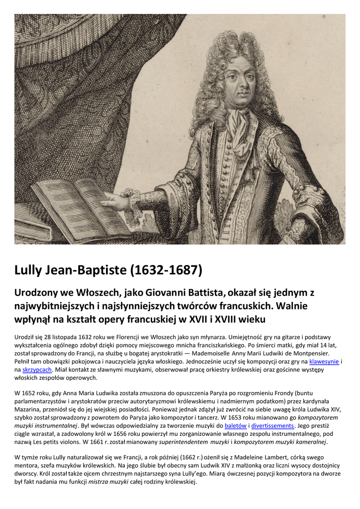 Lully Jean-Baptiste (1632-1687) Urodzony we Włoszech, jako Giovanni Battista, okazał się jednym z najwybitniejszych i najsłynniejszych twórców francuskich. Walnie wpłynął na kształt opery francuskiej w XVII i XVIII wieku Urodził się 28 listopada 1632 roku we Florencji we Włoszech jako syn młynarza. Umiejętność gry na gitarze i podstawy wykształcenia ogólnego zdobył dzięki pomocy miejscowego mnicha franciszkańskiego. Po śmierci matki, gdy miał 14 lat, został sprowadzony do Francji, na służbę u bogatej arystokratki — Mademoiselle Anny Marii Ludwiki de Montpensier. Pełnił tam obowiązki pokojowca i nauczyciela języka włoskiego. Jednocześnie uczył się kompozycji oraz gry na klawesynie i na skrzypcach. Miał kontakt ze sławnymi muzykami, obserwował pracę orkiestry królewskiej oraz gościnne występy włoskich zespołów operowych. W 1652 roku, gdy Anna Maria Ludwika została zmuszona do opuszczenia Paryża po rozgromieniu Frondy (buntu parlamentarzystów i arystokratów przeciw autorytaryzmowi królewskiemu i nadmiernym podatkom) przez kardynała Mazarina, przeniósł się do jej wiejskiej posiadłości. Ponieważ jednak zdążył już zwrócić na siebie uwagę króla Ludwika XIV, szybko został sprowadzony z powrotem do Paryża jako kompozytor i tancerz. W 1653 roku mianowano go kompozytorem muzyki instrumentalnej. Był wówczas odpowiedzialny za tworzenie muzyki do baletów i divertissements. Jego prestiż ciągle wzrastał, a zadowolony król w 1656 roku powierzył mu zorganizowanie własnego zespołu instrumentalnego, pod nazwą Les petits violons. W 1661 r. został mianowany superintendentem muzyki i kompozytorem muzyki kameralnej. W tymże roku Lully naturalizował się we Francji, a rok później (1662 r.) ożenił się z Madeleine Lambert, córką swego mentora, szefa muzyków królewskich. Na jego ślubie był obecny sam Ludwik XIV z małżonką oraz liczni wysocy dostojnicy dworscy. Król został także ojcem chrzestnym najstarszego syna Lully’ego. Miarą ówczesnej pozycji kompozytora na dworze był fakt nadania mu funkcji mistrza muzyki całej rodziny królewskiej. Jean-Baptiste Lully, Suita Alceste Na początku swej dworskiej kariery tworzył Lully głównie muzykę do baletów, w połowie lat 60. spróbował jednak nowego gatunku — komedii baletowych, które tworzył we współpracy z Molièrem, np. Le Bourgeois Gentilhomme (Mieszczanin szlachcicem) z 1670 roku. W nich eksperymentował, zmierzając do stworzenia francuskiego stylu komicznego w muzyce. Począwszy od lat 70. zaczął zaś pisać opery. Zaproponował dzieła oparte na włoskich modelach (centrum świata operowego były w owym czasie Włochy) lecz z francuskimi librettami, przyczyniając się znacznie do popularyzacji tego gatunku we Francji. W latach 1672-87 pisał prawie regularnie jedno takie dzieło rocznie, a każde z nich stawało się wielkim wydarzeniem artystycznym. Do najsłynniejszych oper Lully’ego należą m.in. Alceste (1674 r.), Roland (1685 r.), Armide (1686 r.) oraz Acis et Galatée (1686 r.). Ukoronowaniem sukcesów Lully’ego było nadanie mu szlachectwa i tytułu królewskiego sekretarza w 1681 roku. Kompozytor nie miał jednak łatwego charakteru, na dworze wikłał się w różne konflikty, obok zachwytów budził zawiść — nie tylko z powodu swego talentu muzycznego, ale też bogactwa i pozycji, którą bezwzględnie wykorzystywał. Umiał bowiem dbać o swe interesy. Od króla otrzymał na przykład przywilej, by w teatrach francuskich nie mogła być wykonywana bez jego zezwolenia żadna muzyka, ograniczał zatem liczbę przedstawień oper, których sam nie akceptował. Niespotykana kariera Lully’ego została jednak przerwana przez tragiczny wypadek. W 1687 roku, dyrygując Te Deum na mszy dziękczynnej za wyzdrowienie króla po ciężkiej chorobie, uderzył się w stopę ostrzem laski (za jej pomocą dyrygował). Wdała się infekcja, ale kompozytor nie zgodził się na amputację stopy i po dwóch miesiącach zmarł na gangrenę (22 marca 1687 roku w Paryżu). dr hab. Iwona Lindstedt Ciekawostki Po śmierci Lully pozostawił żonie i swym sześciorgu dzieciom wielką fortunę wartą 800 000 lirów. Była ona równoważna ponad 500 rocznym pensjom przeciętnego muzyka dworskiego.
