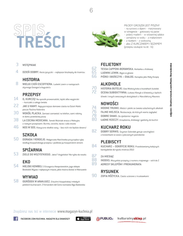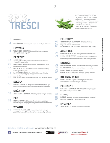 6 TREŚCI 3 4 8 WSTĘPNIAK DZIEŃ DOBRY. Kocie języczki – najlepsze biszkopty do tiramisu HISTORIA WIELKI CIEŃ ESCOFFIERA. Ludwik Lewin o następcach słynnego Georges’a Auguste’a 14 22 30 38 46 50 62 65 66 PRZEPISY 70 72 – kurczaki z całego świata piecze Paulina Kolondra WOKÓŁ PLACKA. Zamiast zamawiać na telefon, sami robimy w domu prawdziwą pizzę LA COCINA MEXICANA. Tomek Woźniak wraca z Meksyku z nowymi przepisami. Burrito, ceviche, tacos i cała reszta NOS W SOS. Klasyczne słodkie sosy – bez nich nie będzie deseru! SZKOŁA 74 76 78 80 82 według hiszpańskiego przepisu i podlewa ją hiszpańskim winem 53 54 58 ZIELE DO WSZYSTKIEGO. Jakie? Angielskie! Nie tylko do rosołu 84 EKO WYWIAD 90 OGRÓDEK W ARANJUEZ. O kuchni hiszpańskiej i młodych polskich kucharzach. Z Fernandem del Cerro rozmawia Olga Badowska Znajdziesz nas też w internecie www.magazyn-kuchnia.pl FACEBOOK.COM/KUCHNIA. MAGAZYN DLA SMAKOSZY HISTORIA BUTELKI. Ewa Wieleżyńska o kształtach butelek OCENA SUBIEKTYWNA. Łukasz Klesyk o śliwowicy z łąckich NOWOŚCI MODNE TRUNKI. Wieści i plotki ze świata szlachetnych alkoholi FAJNE MIEJSCA. Restauracje, do których warto zaglądać DOBRE SMAKI. Do zjedzenia i wypicia ŁADNE RZECZY. Urządzenia, drobiazgi i gadżety do kuchni KUCHARZ ROKU DOBRY SERWIS. Szymon Szlendak gotuje conchiglioni PLEBISCYT KUCHARZ – ODKRYCIE ROKU. Przedstawiamy kolejnych kandydatów do tytułu mistrza 2013 87 88 89 MIEJSKI KOWBOJ. O Grzegorzu Kwapniewskim, jego sklepie Beskidzki Wypas i najlepszym mięsie, jakie można dostać w Warszawie ALKOHOLE z krewetkami w sosie z pieczonych pomidorów DORADA I VERDEJO. Małgorzata Marchewka przyrządza rybę SPIŻARNIA TESSA CAPPONI-BORAWSKA. Herbatka u Królowej LUDWIK LEWIN. Bigos w głowie PIÓRO I BIEŃCZYK – DIALOG. Kanapka jako Mały Książę śliwek i innych owocowych destylatach z Manufaktury Maurera O, KURCZĘ! Na sposób prowansalski, tajski albo węgierski JAK U MAMY. Najpyszniejsze domowe ciasta na Dzień Matki FELIETONY ZA MIESIĄC INDEKS. Wszystkie przepisy z numeru majowego – od A do Z ADRESY SKLEPÓW I PRENUMERATA RYSUNEK ZOFIA RÓŻYCKA. Ciasto ucierane z truskawkami zdjęcie: Shutterstock.com/Maks Narodenko MŁODY GROSZEK JEST PYSZNY » na surowo z dipem » marynowany w winegrecie » gotowany na parze » polany masłem » w wiosennej sałatce » usmażony w woku » z makaronem » z risottem » z wołowiną » albo Z KURCZAKIEM I SEZAMEM (przepisu szukajcie na str. 16)
