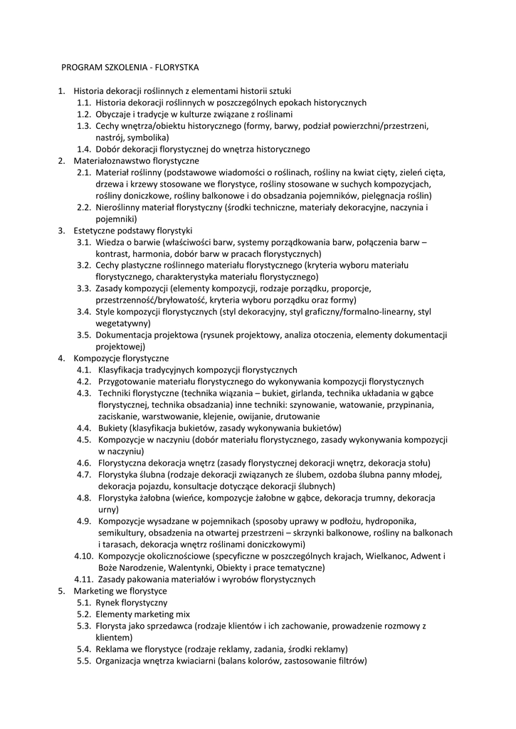 PROGRAM SZKOLENIA - FLORYSTKA 1. Historia dekoracji roślinnych z elementami historii sztuki 1.1. Historia dekoracji roślinnych w poszczególnych epokach historycznych 1.2. Obyczaje i tradycje w kulturze związane z roślinami 1.3. Cechy wnętrza/obiektu historycznego (formy, barwy, podział powierzchni/przestrzeni, nastrój, symbolika) 1.4. Dobór dekoracji florystycznej do wnętrza historycznego 2. Materiałoznawstwo florystyczne 2.1. Materiał roślinny (podstawowe wiadomości o roślinach, rośliny na kwiat cięty, zieleń cięta, drzewa i krzewy stosowane we florystyce, rośliny stosowane w suchych kompozycjach, rośliny doniczkowe, rośliny balkonowe i do obsadzania pojemników, pielęgnacja roślin) 2.2. Nieroślinny materiał florystyczny (środki techniczne, materiały dekoracyjne, naczynia i pojemniki) 3. Estetyczne podstawy florystyki 3.1. Wiedza o barwie (właściwości barw, systemy porządkowania barw, połączenia barw – kontrast, harmonia, dobór barw w pracach florystycznych) 3.2. Cechy plastyczne roślinnego materiału florystycznego (kryteria wyboru materiału florystycznego, charakterystyka materiału florystycznego) 3.3. Zasady kompozycji (elementy kompozycji, rodzaje porządku, proporcje, przestrzenność/bryłowatość, kryteria wyboru porządku oraz formy) 3.4. Style kompozycji florystycznych (styl dekoracyjny, styl graficzny/formalno-linearny, styl wegetatywny) 3.5. Dokumentacja projektowa (rysunek projektowy, analiza otoczenia, elementy dokumentacji projektowej) 4. Kompozycje florystyczne 4.1. Klasyfikacja tradycyjnych kompozycji florystycznych 4.2. Przygotowanie materiału florystycznego do wykonywania kompozycji florystycznych 4.3. Techniki florystyczne (technika wiązania – bukiet, girlanda, technika układania w gąbce florystycznej, technika obsadzania) inne techniki: szynowanie, watowanie, przypinania, zaciskanie, warstwowanie, klejenie, owijanie, drutowanie 4.4. Bukiety (klasyfikacja bukietów, zasady wykonywania bukietów) 4.5. Kompozycje w naczyniu (dobór materiału florystycznego, zasady wykonywania kompozycji w naczyniu) 4.6. Florystyczna dekoracja wnętrz (zasady florystycznej dekoracji wnętrz, dekoracja stołu) 4.7. Florystyka ślubna (rodzaje dekoracji związanych ze ślubem, ozdoba ślubna panny młodej, dekoracja pojazdu, konsultacje dotyczące dekoracji ślubnych) 4.8. Florystyka żałobna (wieńce, kompozycje żałobne w gąbce, dekoracja trumny, dekoracja urny) 4.9. Kompozycje wysadzane w pojemnikach (sposoby uprawy w podłożu, hydroponika, semikultury, obsadzenia na otwartej przestrzeni – skrzynki balkonowe, rośliny na balkonach i tarasach, dekoracja wnętrz roślinami doniczkowymi) 4.10. Kompozycje okolicznościowe (specyficzne w poszczególnych krajach, Wielkanoc, Adwent i Boże Narodzenie, Walentynki, Obiekty i prace tematyczne) 4.11. Zasady pakowania materiałów i wyrobów florystycznych 5. Marketing we florystyce 5.1. Rynek florystyczny 5.2. Elementy marketing mix 5.3. Florysta jako sprzedawca (rodzaje klientów i ich zachowanie, prowadzenie rozmowy z klientem) 5.4. Reklama we florystyce (rodzaje reklamy, zadania, środki reklamy) 5.5. Organizacja wnętrza kwiaciarni (balans kolorów, zastosowanie filtrów) 6. 7. 8. 9. 10. 11. 5.6. Malowanie i wypełnienia (malowanie narzędziem pędzel, zmiana parametrów malowania, wykorzystanie gotowych wzorów pędzla, wypełnienie obrazu kolorem, gradientem, tworzenie własnych gradientów) 5.7. Retusz obrazu (zastosowanie dostępnych narzędzi oraz technik wykorzystywanych do retuszu, wymazywanie narzędziem gumka, wykorzystanie dostępnych narzędzi w retuszu i modyfikacji fotografii) 5.8. Tworzenie nowych obiektów (wpisywanie tekstu i jego edycja, rysowanie obiektów geometrycznych, korzystanie z gotowych kształtów) 5.9. Przekształcanie obiektów (swobodne przekształcanie ścieżki, skalowanie, obracanie, pochylanie, odbijanie, zniekształcanie, zawijanie, tworzenie perspektywy) Tworzenie i edycja obrazów wektorowych 6.1. Omówienie i dostosowanie obszaru roboczego (ustawienie wyświetlania okien i narzędzi, zarządzanie położeniem i wyglądem okien aplikacji) 6.2. Podstawowe operacje wykonywane podczas tworzenia oraz edycji obrazów wektorowych (otwieranie istniejących obrazów, tworzenie nowych obrazów o określonych parametrach, edycja parametrów obrazu, zapisywanie obrazów) 6.3. Tworzenie obiektów wektorowych (rysowanie figur geometrycznych, podstawowe operacje na obiektach, transformacje obiektów, zmiana właściwości obiektów, tworzenie złożonych obiektów, operacje na krzywych) 6.4. Wprowadzanie i edycja tekstów (różnica pomiędzy tekstem ozdobnym a akapitowym, wprowadzanie i modyfikacje tekstu) Animacja obiektów 7.1. Omówienie narzędzi i obszaru roboczego 7.2. Tworzenie prostych animacji wykorzystując dostępne narzędzia Tworzenie obrazów pod konkretne zastosowanie 8.1. Przygotowanie obrazów do druku (podstawowe zasady związane z drukowaniem grafiki, rodzaje papieru i techniki druku, wybór modelu barw i rozdzielczości, eksport grafiki do formatów powszechnie wykorzystywanych na potrzeby druku, ustawienia druku i drukowanie) 8.2. Tworzenie grafiki na potrzeby Internetu (formaty plików na stronach WWW, podstawowe zasady związane z tworzeniem grafiki na potrzeby Internetu, wysyłanie wiadomości do adresata ukrytego, odbieranie wiadomości) Załączniki (dodawanie załączników, odbieranie załączników) 9.1. Ustawienia parametrów dla wiadomości (priorytet wiadomości, opcja potwierdzenia otrzymania wiadomości) Usługi dostępne za pomocą Internetu 10.1. Portale aukcyjne (przykłady portali aukcyjnych, zakładanie konta na portalu aukcyjnym, udział w licytacji) 10.2. Usługi online (rezerwacja biletów, zakupy) 10.3. Mapy (przykłady map, przeglądanie map) Komunikacja 11.1. Fora internetowe (przeglądanie, udział we forach internetowych) 11.2. Czaty (przeglądanie, udział w czatach) 11.3. Komunikatory internetowe (instalacja komunikato