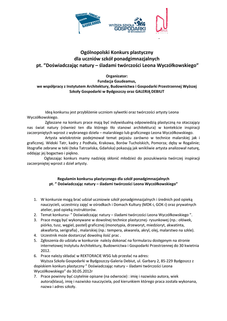 Ogólnopolski Konkurs plastyczny dla uczniów szkół ponadgimnazjalnych pt. ”Doświadczając natury – śladami twórczości Leona Wyczółkowskiego” Organizator: Fundacja Gaudeamus, we współpracy z Instytutem Architektury, Budownictwa i Gospodarki Przestrzennej Wyższej Szkoły Gospodarki w Bydgoszczy oraz GALERIĄ DEBIUT Ideą konkursu jest przybliżenie uczniom sylwetki oraz twórczości artysty Leona Wyczółkowskiego. Zgłaszane na konkurs prace mają być indywidualną odpowiedzią plastyczną na otaczający nas świat natury (również ten dla którego tło stanowi architektura) w kontekście inspiracji zaczerpniętych wprost z wybranego dzieła – malarskiego lub graficznego Leona Wyczółkowskiego. Artysta wielokrotnie podejmował temat pejzażu zarówno w technice malarskiej jak i graficznej. Widoki Tatr, kadry z Podhala, Krakowa, Borów Tucholskich, Pomorza; dęby w Rogalinie; litografie zebrane w teki (teka Tatrzańska, Gdańska) pokazują jak wnikliwie artysta analizował naturę, oddając jej bogactwo i piękno. Ogłaszając konkurs mamy nadzieję skłonić młodzież do poszukiwania twórczej inspiracji zaczerpniętej wprost z dzieł artysty. Regulamin konkursu plastycznego dla szkół ponadgimnazjalnych pt. ” Doświadczając natury – śladami twórczości Leona Wyczółkowskiego” 1. W konkursie mogą brać udział uczniowie szkół ponadgimnazjalnych i średnich pod opieką nauczycieli, uczestnicy zajęć w ośrodkach i Domach Kultury (MDK-i, GOK-i) oraz prywatnych atelier, pod opieką instruktorów. 2. Temat konkursu- ” Doświadczając natury – śladami twórczości Leona Wyczółkowskiego ”. 3. Prace mogą być wykonywane w dowolnej technice plastycznej- rysunkowej (np.: ołówek, piórko, tusz, węgiel, pastel) graficznej (monotypia, drzeworyt, miedzioryt, akwatinta, akwaforta, serigrafia) , malarskiej (np.: tempera, akwarela, akryl, olej, malarstwo na szkle). 4. Uczestnik może dostarczyć dowolną ilość prac . 5. Zgłoszenia do udziału w konkursie należy dokonać na formularzu dostępnym na stronie internetowej Instytutu Architektury, Budownictwa i Gospodarki Przestrzennej do 30 kwietnia 2012. 6. Prace należy składać w REKTORACIE WSG lub przesłać na adres: Wyższa Szkoła Gospodarki w Bydgoszczy-Galeria Debiut, ul. Garbary 2, 85-229 Bydgoszcz z dopiskiem konkurs plastyczny ” Doświadczając natury – śladami twórczości Leona Wyczółkowskiego” do 30.05.2012r 7. Prace powinny być czytelnie opisane (na odwrocie) : imię i nazwisko autora, wiek autora(klasa), imię i nazwisko nauczyciela, pod kierunkiem którego praca została wykonana, nazwa i adres szkoły. 8. Organizatorzy zastrzegają sobie prawo niedopuszczenia do konkursu prac nie spełniających powyższych wymogów. 9. Organizator zastrzega sobie prawo do: użycia prac na potrzeby wewnętrzne Galerii Debiut oraz Instytutu ABiGP WSG organizator zobowiązuje się, w razie użycia prac podać imię i nazwisko autora. 10. Przewiduje się przyznanie nagrody głównej oraz dwóch wyróżnień: I nagroda-profesjonalny zestaw materiałów plastycznych, nagroda książkowa z zakresu historii sztuki, II nagroda-nagroda książkowa III nagroda-nagroda książkowa nagroda dla nauczyciela prowadzącego (I miejsce) 11. Ocenie będą podlegały: technika wykonania, estetyka i walory artystyczne, nowatorstwo pomysłu (sposób i nietypowa forma przedstawienia pomysłu, może to dotyczyć np. samej kompozycji pracy, jej kształtu) zrozumienie tematu (zgodne z celem konkursu) 12. Prace będą podlegały ocenie Komisji Galerii Debiut, składającej się z artystów plastyków oraz historyków sztuki. 13. Komisja Oceniająca ma prawo do nie przyznania nagrody głównej lub innego podziału nagród przy zachowaniu łącznej puli. 14. W ciągu tygodnia od terminu oddania prac, Komisja zobowiązuje się ogłosić wyniki konkursu. 15. Wyniki konkursu ogłoszone przez Komisję Galerii Debiut są ostateczne. 16. Werdykt Komisji Galerii Debiut zostanie ogłoszony na stronach internetowych apk.byd.pl, www.wsg.byd.pl, www.kultura.byd.pl, galeria debiut.byd.pl 17. Wybrane prace wezmą udział w wystawie pokonkursowej . 18. Galeria Debiut nie pokrywa kosztów wysyłki i zwrotu prac. 19. Dodatkowe informacje na temat konkursu pod numerem tel. 52 567 00 20 wew. 21 (Instytut Architektury, Budownictwa i Gospodarki Przestrzennej WSG) Konkurs realizowany w ramach Roku Wyczółkowskiego i jest częścią projektu „Leon Wyczółkowski a region” Projekt współfinansowane jest przez Urząd Miasta Bydgoszcz Rok Leona Wyczółkowskiego "Honorowy Patronat Prezydenta Rzeczypospolitej Polskiej Bronisława Komorowskiego” Patroni medialni: