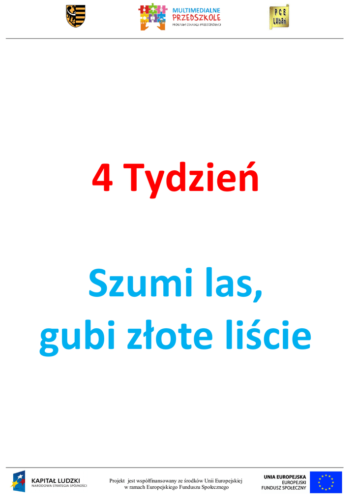 4 Tydzień Szumi las, gubi złote liście Projekt jest współfinansowany ze środków Unii Europejskiej w ramach Europejskiego Funduszu Społecznego IV. TEMAT TYGODNIA: SZUMI LAS, GUBI ZŁOTE LIŚCIE Dzień tygodnia: 1 Temat: Kolory jesiennego lasu Zabawa ilustracyjna oparta na treści wiersza B. Formy Witamy Panią Jesień Idzie przez świat Pani Jesień, nauczycielka recytuje tekst równocześnie obrazując treść za pomocą grzechotki psotny wiatr w worku niesie. Wypuścić go z worka trzeba, niech strąci liście z drzewa. Witamy Panią Jesień dzieci wykonują ukłon Liście wirują nad ziemią, nauczycielka recytuje tekst równocześnie obrazując treść za pomocą tamburyna ich barwy w słońcu się mienią. Dzieci się bardzo cieszą, nauczycielka recytuje tekst obrazując treść za pomocą grzechotki szybko do parku śpieszą. Witamy Panią Jesień dzieci ponownie się kłaniają Spadają kasztany, żołędzie, nauczycielka recytuje tekst obrazując treść za pomocą grzechotki wkoło pełno ich wszędzie. Jesień dary przyniosła, nauczycielka recytuje tekst obrazując treść za pomocą trójkąta piękna, bajkowa, radosna. Witamy Panią Jesień dzieci wykonują ukłon Lecz kiedy ma humor ponury nauczycielka recytuje tekst równocześnie obrazując treść za pomocą tamburyna maluje deszczowe chmury. Wtedy wita nas deszczem i chłodzi ciepłe powietrze. Dzień tygodnia: 2 Temat: Co tworzy las? Fragment opowiadania S. Karaszewskiego Las – czarodziejski dom zwierząt Najważniejsze w lesie są drzewa, Ich korzenie, pnie i korony, Od drzew niższe i mniejsze są krzewy, Runo leśne, ten dywan zielony! Projekt jest współfinansowany ze środków Unii Europejskiej w ramach Europejskiego Funduszu Społecznego Dachem lasu – gałęzie i liście, Ścianą lasu – pnie w korę obrosłe, Wśród korzeni – są ciemne piwnice, Korytarze i chłodne podziemia. Są tam drzewa wysokie, iglaste, Świerki, sosny, zielone rok cały, Dęby, klony – to drzewa liściaste, Wkrótce liście z nich będą spadały! Las to dom pełen magii i czarów, Każde piętro ma swoje tajemnice, Z mchu i traw czarodziejskie dywany, i z pajęczyn na świat okiennice! W czarodziejskim tym lesie zwierzęta Żyją zgodnie z przyrodą i czasem, Moc tajemna, w przyrodzie zaklęta, Szepcze, jak zaprzyjaźnić się z lasem Dzień tygodnia: 3 Temat: Liście malowane pod drzewami rozsypane Opowieść ruchowa Jesienne liście Dzieci siedzą na dywanie. W tle granego akompaniamentu (lub bez) N. rozpoczyna: Mówi cichym głosem: - Jesteście jesiennymi liśćmi, które leżą w parku pod drzewami i tworzą dywan. Coraz głośniej: - Nagle zerwał się lekki wiatr i porwał liście. Dzieci powoli przechodzą do przysiadu, następnie do pozycji stojącej, unoszą ręce w górę i na palcach poruszają rękami w nadgarstkach, obracając się wkoło. - Wiatr tańczy i śpiewa. Dzieci obracają się w dalszym ciągu naśladując wiatr. Zabawę można powtórzyć. Piosenka Kolorowe listki (m. T. Pabisiak; sł. A. Galica) Kolorowe listki z drzewa spaść nie chciały. Kolorowe listki na wietrze szumiały. Szu, szu, szu, szumiały wesoło. Szu, szu, szu, wirowały w koło. Kolorowe listki bardzo się zmęczyły. Kolorowe listki z drzewa zeskoczyły. Hop, hop, hop, tak sobie skakały. Hop, hop, hop, w koło wirowały. Kolorowe listki spadły już na trawę. Kolorowe listki skończyły zabawę. Cicho, sza, listki zasypiają. Cicho, sza, oczka zamykają Projekt jest współfinansowany ze środków Unii Europejskiej w ramach Europejskiego Funduszu Społecznego Dzień tygodnia: 4 Temat: Leśne rachunki Opowieść ruchowa Spacer (wg B. Formy) Dzieci spacerują po sali w rytmie muzyki o różnym charakterze dobranej przez prowadzącą, tak, by pozwalała na zobrazowanie prezentowanego tekstu. N. rozpoczyna opowiadanie. - Wyobrażamy sobie, że idziemy na wycieczkę do parku. Jest październik, przygrzewa słońce, chociaż nie tak mocno jak w czasie lata. Zatrzymujemy się przez chwilę. Wyciągamy ręce do góry, poruszamy palcami. Może uda nam się dotknąć przynajmniej jeden malutki promyczek. Czujecie, jak powiewa jesienny wietrzyk? Zrywa liście z drzew i zaprasza wszystkich do zabawy. Wyciągamy ręce na boki i tańczymy razem. Razem z nami tańczą drzewa. Zatrzymujemy się w lekkim rozkroku "jesteśmy drzewami". Ręce uniesione w górę "to gałęzie", kołyszemy nimi płynnie w różne strony. Teraz zamieniamy się "w ptaki". Szukamy ziarenek i małych robaczków. Przechodzimy do przysiadu i wykonujemy miarowe ruchy głowami w górę w dół. "Ptaki" przygotowują się do odlotu, fruwają ponad drzewami. Wyciągamy ręce na boki zginamy w łokciach "to nasze skrzydła" i biegniemy drobnymi krokami "fruniemy wysoko". - Nagle pojawiła się rodzina wiewiórek. "Zamieniamy się w wiewiórki". "Mamy uszy jak pędzelki i puszyste ogony". Uwaga "wiewiórki", zatrzymujemy się, pogładzimy nasze piękne ogony. Poskaczemy z gałęzi na gałąź. Widzę orzechy - myślę, że wystarczy dla całej naszej wiewiórczej rodziny. Opowiadanie B. Formy A jesienią tak bywa W niedzielne popołudnie Ewa poszła na spacer do parku. Nagle stanęła przed nią Pani Jesień. Piękny szal na jej szyi utkany z liści mienił się pięknymi barwami. Na głowie miała słomkowy kapelusz przystrojony koralami jarzębiny. W ręce trzymała kosz wypełniony grzybami, orzechami i dojrzałymi owocami. - Witaj Ewo. Czy masz ochotę na wspólny spacer? Powiał lekki wiaterek, pajęczyna babiego lata delikatnie drgnęła jak struna. Barwne liście posypały się z drzew. Pani Jesień zawirowała między nimi. - Jak pięknie - dziewczynka wyciągnęła dłonie, a liście ułożyły się w piękny bukiet. Tymczasem wiatr wiał coraz mocniej. Niebo pokryły gęste chmury. - Jak śmiesz mi przeszkadzać?! - Pani Jesień groźnie zmarszczyła czoło. - Uciekaj, bo cię złapię do worka. - Szszsz, nie boję się wcale - zawodził wiatr. - Niedługo będ
