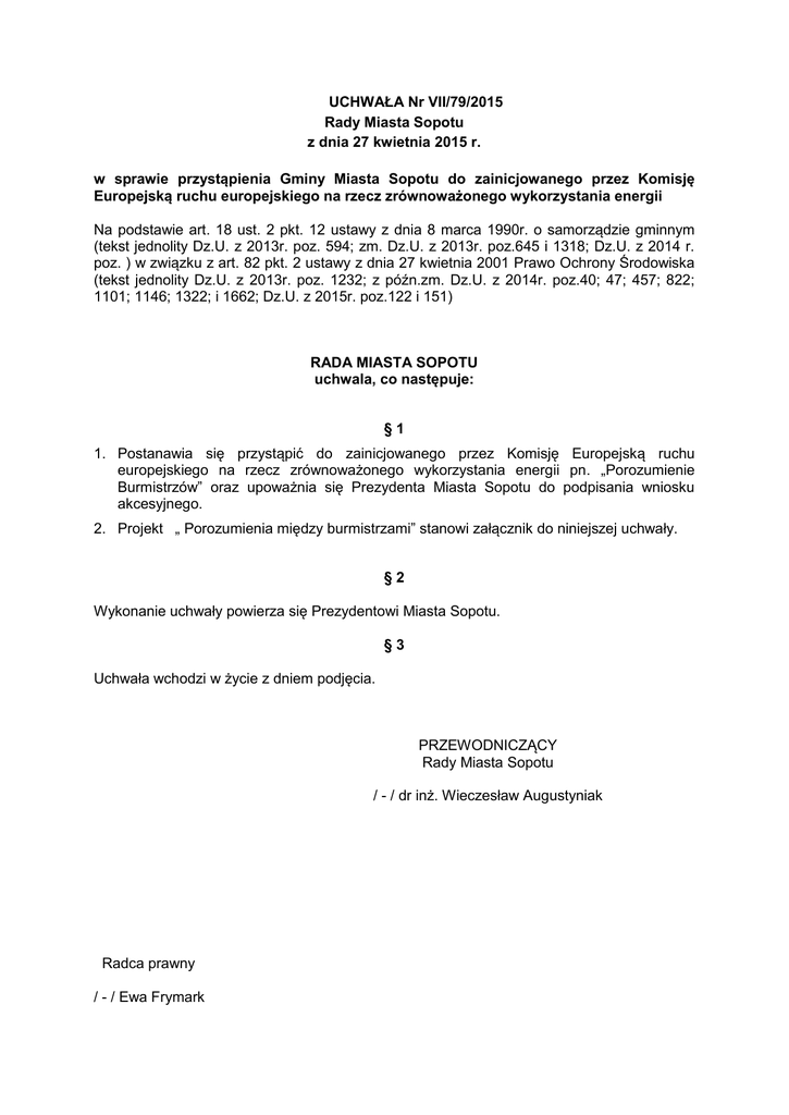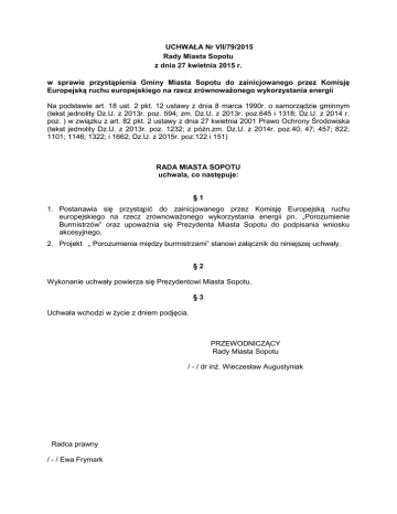 UCHWAŁA Nr VII/79/2015 Rady Miasta Sopotu z dnia 27 kwietnia 2015 r. w sprawie przystąpienia Gminy Miasta Sopotu do zainicjowanego przez Komisję Europejską ruchu europejskiego na rzecz zrównoważonego wykorzystania energii Na podstawie art. 18 ust. 2 pkt. 12 ustawy z dnia 8 marca 1990r. o samorządzie gminnym (tekst jednolity Dz.U. z 2013r. poz. 594; zm. Dz.U. z 2013r. poz.645 i 1318; Dz.U. z 2014 r. poz. ) w związku z art. 82 pkt. 2 ustawy z dnia 27 kwietnia 2001 Prawo Ochrony Środowiska (tekst jednolity Dz.U. z 2013r. poz. 1232; z późn.zm. Dz.U. z 2014r. poz.40; 47; 457; 822; 1101; 1146; 1322; i 1662; Dz.U. z 2015r. poz.122 i 151) RADA MIASTA SOPOTU uchwala, co następuje: §1 1. Postanawia się przystąpić do zainicjowanego przez Komisję Europejską ruchu europejskiego na rzecz zrównoważonego wykorzystania energii pn. „Porozumienie Burmistrzów” oraz upoważnia się Prezydenta Miasta Sopotu do podpisania wniosku akcesyjnego. 2. Projekt „ Porozumienia między burmistrzami” stanowi załącznik do niniejszej uchwały. §2 Wykonanie uchwały powierza się Prezydentowi Miasta Sopotu. §3 Uchwała wchodzi w życie z dniem podjęcia. PRZEWODNICZĄCY Rady Miasta Sopotu / - / dr inż. Wieczesław Augustyniak Radca prawny / - / Ewa Frymark Załącznik do uchwały nr VII/79/2015 Rady Miasta Sopotu z dnia 27 kwietnia 2015r. POROZUMIENIE BURMISTRZÓW POROZUMIENIE BURMISTRZÓW MAJĄC NA UWADZE, że Międzyrządowy Zespół ds. Zmian Klimatu (IPCC) potwierdził, że zmiany klimatyczne są zjawiskiem realnym, które spowodowane jest w dużej mierze wykorzystywaniem energii na potrzeby ludzkiej działalności; MAJĄC NA UWADZE, że 9 marca 2007 r. Unia Europejska przyjęła pakiet „Energia dla zmieniającego się świata”, zobowiązując się jednostronnie do ograniczenia swoich emisji dwutlenku węgla o 20% do roku 2020 w wyniku zwiększenia o 20% efektywności energetycznej i osiągnięcia 20-procentowego udziału energii ze źródeł odnawialnych w koszyku energetycznym; MAJĄC NA UWADZE, że „Plan działania Unii Europejskiej na rzecz racjonalizacji zużycia energii: sposoby wykorzystania potencjału” wymaga zawarcia „Porozumienia między burmistrzami” jako działania pierwszoplanowego; MAJĄC NA UWADZE, że Komitet Regionów podkreśla potrzebę połączenia sił lokalnych i regionalnych, ponieważ zarządzanie wieloszczeblowe jest efektywnym narzędziem zwiększania skuteczności działań podejmowanych w walce ze zmianami klimatycznymi, i w związku z tym zachęca regiony do zaangażowania się w porozumienie między burmistrzami; MAJĄC NA UWADZE, fakt, że wyrażamy wolę zastosowania się do zaleceń zawartych w Karcie lipskiej na rzecz zrównoważonego rozwoju miast europejskich, dotyczącej konieczności poprawienia efektywności energetycznej; MAJĄC NA UWADZE, zobowiązania z Aalborga, na których opiera się wiele podejmowanych aktualnie wysiłków na rzecz zrównoważonego rozwoju miast oraz procesów w ramach agendy lokalnej 21; MAJĄC NA UWADZE, że władze lokalne i regionalne ponoszą wspólną odpowiedzialność z władzami krajowymi za walkę z globalnym ociepleniem oraz że odpowiedzialność ta musi być niezależna od zobowiązań innych podmiotów; MAJĄC NA UWADZE, że miasta przyczyniają się bezpośrednio i pośrednio (poprzez produkty i usługi, z których korzystają ich obywatele) do ponad połowy emisji gazów cieplarnianych pochodzących z wykorzystania energii koniecznej na potrzeby ludzkiej działalności; MAJĄC NA UWADZE, że wywiązanie się UE ze zobowiązania do ograniczenia emisji będzie możliwe jedynie pod warunkiem zaangażowania podmiotów lokalnych, obywateli i ich ugrupowań; MAJĄC NA UWADZE, że konieczne jest, by władze lokalne i regionalne, jako jednostki administracyjne najbliższe obywatelom, inicjowały odpowiednie działania i świeciły przykładem; MAJĄC NA UWADZE, że wiele działań – dotyczących zapotrzebowania na energię i odnawialnych źródeł energii – koniecznych, by zapobiec rozregulowaniu klimatu, leży w kompetencjach władz lokalnych bądź też ich realizacja nie byłaby możliwa bez poparcia politycznego ze strony tych władz; MAJĄC NA UWADZE, że państwa członkowskie UE mogą wykorzystać skuteczne działania na szczeblu lokalnym, by wywiązać się ze swych zobowiązań w zakresie ograniczenia emisji gazów cieplarnianych; MAJĄC NA UWADZE, że władze lokalne i regionalne w całej Europie ograniczają emisje zanieczyszczeń powodujących globalne ocieplenie poprzez wprowadzanie programów efektywności energetycznej, obejmujących zrównoważoną mobilność w mieście oraz rozpowszechnianie wykorzystywania energii ze źródeł odnawialnych; MY, BURMISTRZOWIE, ZOBOWIĄZUJEMY SIĘ: MY, BURMISTRZOWIE, ZOBOWIĄZUJEMY SIĘ: wykroczyć poza cele wyznaczone dla UE do roku 2020 poprzez zmniejszenie emisji dwutlenku węgla w podlegających nam jednostkach terytorialnych o co najmniej 20% dzięki wdrożeniu planu działań na rzecz zrównoważonej energii w dziedzinach wchodzących w zakres naszych kompetencji; zobowiązanie takie oraz plan działań zostaną ratyfikowane w drodze odpowiednich procedur; przygotować służącą za punkt odniesienia inwentaryzację emisji jako podstawę planu działań na rzecz zrównoważonej energii; przedstawić plan działań na rzecz zrównoważonej energii w ciągu roku po oficjalnym przystąpieniu przez każdego z nas do niniejszego Porozumienia między burmistrzami; przystosować struktury miejskie, w tym zapewnić wystarczające zasoby ludzkie, by podjąć niezbędne działania; zmobilizować społeczeństwo obywatelskie na podlegających nam obszarach geograficznych do udziału w opracowaniu planu działań, określeniu strategii i środków koniecznych do wdrożenia i zrealizowania jego celów – każda jednostka terytorialna opracuje plan i prześle go do Sekretariatu Porozumienia w ciągu roku od przystąpienia do Porozumienia; przedstawiać co 