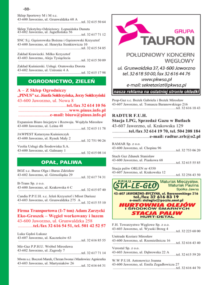 -88- Sklep Sportowy M i M s.c. 43-600 Jaworzno, ul. Grunwaldzka 68 A .....................................................................tel. 32 615 50 64 Sklep Tekstylny-Odzieżowy. Łopusińska Danuta 43-602 Jaworzno, ul. Jagiellońska 56 .....................................................................tel. 32 617 71 12 SNC S.j. Gąsiorowska Bożena i Gąsiorowski Krzysztof 43-600 Jaworzno, ul. Henryka Sienkiewicza 10 .....................................................................tel. 32 615 54 85 Zakład Krawiecki. Milko Krzysztof 43-603 Jaworzno, Aleja Tysiąclecia .....................................................................tel. 32 615 50 09 Zakład Kuśnierski. Usługi. Oratowska Dorota 43-602 Jaworzno, ul. Ustronie 4 A .....................................................................tel. 32 615 17 98 A – Z Sklep Ogrodniczy „PINUS” s.c. Józefa Sołdrzyńska, Jerzy Sołdrzyński 43-600 Jaworzno, ul. Nowa 8 .........................................tel./fax 32 614 10 56 ...........................................www.pinus.info.pl ...........................e-mail: [email protected] Expansion Biuro Inicjatyw i Rozwoju. Wojdyła Mirosław 43-600 Jaworzno, ul. Leśna 48 .....................................................................tel. 32 615 11 78 JAWPEST Katarzyna Kuśnierczyk 43-600 Jaworzno, ul. Rynek Mały 2 .....................................................................tel. 32 751 90 26 Veolia Usługi dla Środowiska S.A. 43-600 Jaworzno, ul. Galmany 1 .....................................................................tel. 32 615 08 14 BOZ s.c. Buras Olga i Buras Zdzisław 43-602 Jaworzno, ul. Górnośląska 29 .....................................................................tel. 32 617 74 31 B-Trans Sp. z o.o. 43-600 Jaworzno, ul. Krakowska 6 C .....................................................................tel. 32 615 07 40 Prop-Gaz s.c. Bożek Gabriela i Bożek Mirosław 43-607 Jaworzno, ul. Tomasza Baranowskiego 216 .....................................................................tel. 32 616 18 43 RADTUR F.U.H. Stacja LPG, Sprzedaż Gazu w Butlach 43-607 Jaworzno, ul. Krakowska 129 ..............tel./fax 32 614 19 70, tel. 504 208 184 ...............................e-mail: [email protected] RAMAR Sp. z o.o. 43-600 Jaworzno, ul. Chopina 96 .....................................................................tel. 32 753 06 20 Stach Gaz Zdunek Stanisław 43-600 Jaworzno, ul. Piaskowa 68 .....................................................................tel. 32 615 55 85 Stacja paliw ORLEN nr 4350 43-607 Jaworzno, ul. Krakowska 12 .....................................................................tel. 32 256 43 50 Candia P.P.U.H. s.c. Jeleń Krzysztof i Mlost Dariusz 43-603 Jaworzno, ul. Grunwaldzka 275 A .....................................................................tel. 32 615 55 10 Firma Transportowa (1-7 ton) Adam Zarzycki Eko-Groszek – Węgiel workowany i luzem 43-600 Jaworzno, ul. Grunwaldzka 258 .............tel./fax 32 616 54 51, tel. 501 42 52 57 Luka Gędoś Łukasz 43-607 Jaworzno, ul. Kaczeńców 63 .....................................................................tel. 32 616 85 55 Mir-Gaz P.P.H.U. Wróbel Mirosława 43-602 Jaworzno, ul. Zagrody 7 .....................................................................tel. 32 617 71 14 Mwm s.c. Boczoń Marek, Chrzan Iwona i Masłowiec Agnieszka 43-603 Jaworzno, ul. Martyniaków 26 .....................................................................tel. 32 616 64 31 F.H. Towarzystwo Węglowe Sp. z o.o. 43-603 Jaworzno, ul. Wysoki Brzeg 4 .....................................................................tel. 32 223 68 00 Unitrade Koziarz Mirosław 43-600 Jaworzno, ul. Rzemieślnicza 16 .....................................................................tel. 32 616 43 40 Verostal Sp. z o.o. 43-603 Jaworzno, ul. Dąbrowska 22 A .....................................................................tel. 32 615 59 20 W.W P.U.H. Antonowicz Joanna 43-600 Jaworzno, ul. Emila Zegadłowicza 27 .....................................................................tel. 32 616 44 70 -89- Gabinet Okulistyczny. lek. Bogdali Emilia 43-600 Jaworzno, ul. Farna 14 .....................................................................tel. 32 615 00 66 Photopartner mgr Śmigielski Grzegorz 43-603 Jaworzno, ul. św. Maksymiliana Kolbe 11 .....................................................................tel. 32 615 57 30 Zakład Optyczny s.c. J. Pyka, K. Ochudło, S. Wittek 43-600 Jaworzno, ul. Rynek 15 .....................................................................tel. 32 616 34 33 Zakład Optyczny Wójcik s.c. 43-600 Jaworzno, ul. Sienkiewicza 6 .....................................................................tel. 32 752 03 04 P.P.H.U. IVA Irena Wałęsa 43-600 Jaworzno, ul. Żółkiewskiego 1 .....................................................................tel. 32 751 95 17 KAMEA Halina Drożdż Prywatne Przedsiębiorstwo Usługowo-Handlowe 43-600 Jaworzno, ul. Mickiewicza 13 ................................................tel. 32 751 92 72 Kwiaciarnia „RONDO” Sojka Roman Artykuły Ogrodnicze, Upominki 43-608 Jaworzno, ul. Celników 2 ................................................tel. 32 616 71 91 P.P.U.H. Machowska 43-600 Jaworzno, ul. Grunwaldzka 98 .....................................................................tel. 32 616 48 44 Alfa F.H. s.c. Dubiel Agnieszka i Dubiel Robert 43-600 Jaworzno, ul. Jana Matejki 27 .....................................................................tel. 32 616 17 92 Ania Ciastkarnia. Wojciechowski Adam 43-603 Jaworzno, ul. Władysława Reymonta 3 .....................................................................tel. 32 616 36 80 Ba-Ja Z.P.H.U. s.c. Babula W. i Janicka D. 43-602 Jaworzno, ul. Kablowa 4 .....................................................................tel. 32 617 76 12 Dom Chleba s.c. Sob