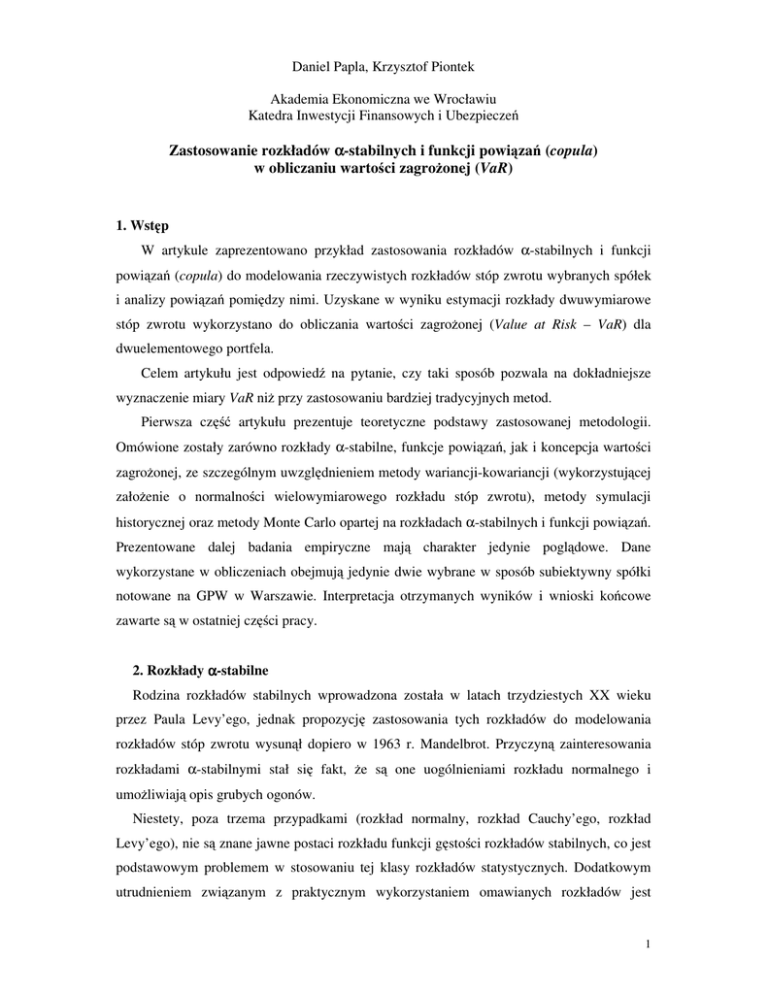 Daniel Papla, Krzysztof Piontek Akademia Ekonomiczna we Wrocławiu Katedra Inwestycji Finansowych i Ubezpieczeń Zastosowanie rozkładów α-stabilnych i funkcji powiązań (copula) w obliczaniu wartości zagrożonej (VaR) 1. Wstęp W artykule zaprezentowano przykład zastosowania rozkładów α-stabilnych i funkcji powiązań (copula) do modelowania rzeczywistych rozkładów stóp zwrotu wybranych spółek i analizy powiązań pomiędzy nimi. Uzyskane w wyniku estymacji rozkłady dwuwymiarowe stóp zwrotu wykorzystano do obliczania wartości zagrożonej (Value at Risk – VaR) dla dwuelementowego portfela. Celem artykułu jest odpowiedź na pytanie, czy taki sposób pozwala na dokładniejsze wyznaczenie miary VaR niż przy zastosowaniu bardziej tradycyjnych metod. Pierwsza część artykułu prezentuje teoretyczne podstawy zastosowanej metodologii. Omówione zostały zarówno rozkłady α-stabilne, funkcje powiązań, jak i koncepcja wartości zagrożonej, ze szczególnym uwzględnieniem metody wariancji-kowariancji (wykorzystującej założenie o normalności wielowymiarowego rozkładu stóp zwrotu), metody symulacji historycznej oraz metody Monte Carlo opartej na rozkładach α-stabilnych i funkcji powiązań. Prezentowane dalej badania empiryczne mają charakter jedynie poglądowe. Dane wykorzystane w obliczeniach obejmują jedynie dwie wybrane w sposób subiektywny spółki notowane na GPW w Warszawie. Interpretacja otrzymanych wyników i wnioski końcowe zawarte są w ostatniej części pracy. 2. Rozkłady α-stabilne Rodzina rozkładów stabilnych wprowadzona została w latach trzydziestych XX wieku przez Paula Levy’ego, jednak propozycję zastosowania tych rozkładów do modelowania rozkładów stóp zwrotu wysunął dopiero w 1963 r. Mandelbrot. Przyczyną zainteresowania rozkładami α-stabilnymi stał się fakt, że są one uogólnieniami rozkładu normalnego i umożliwiają opis grubych ogonów. Niestety, poza trzema przypadkami (rozkład normalny, rozkład Cauchy’ego, rozkład Levy’ego), nie są znane jawne postaci rozkładu funkcji gęstości rozkładów stabilnych, co jest podstawowym problemem w stosowaniu tej klasy rozkładów statystycznych. Dodatkowym utrudnieniem związanym z praktycznym wykorzystaniem omawianych rozkładów jest 1 niejednolita parametryzacja stosowana przez różnych autorów, która nie ułatwia porównania wyników. Podstawowe cechy rozkładów α-stabilnych oraz sposoby estymacji ich parametrów można znaleźć w takich pracach jak (Borak, Härdle, Weron (2004); Samorodnitsky, Taqqu (1994); Weron (1996)). Rozkłady α-stabilne definiowane są w ogólności poprzez funkcję charakterystyczną następującej postaci: πα α α , α ≠ 1, i µ t − σ t 1− i β sign (t ) tan 2 log φ (t ) = 2 α = 1, i µ t − σ t 1 + i β π sign (t ) ln t , (1) gdzie: α ∈ (0, 2] – współczynnik stabilności (zwany również współczynnikiem kształtu, wykładnikiem kształtu lub wykładnikiem charakterystycznym), β ∈ [−1,1] – parametr określający skośność rozkładu, σ > 0 – parametr skali (rozproszenia), µ ∈ – parametr położenia. Współczynnik stabilności α określa „szybkość”, z jaką zanikają ogony rozkładu. Dla α = 2 uzyskuj się rozkład normalny. Dla α < 2 wariancja rozkładu jest nieskończona, a rozkłady posiadają grubsze ogony od rozkładu normalnego. Dla α > 1 określona jest średnia rozkładu, równa µ. Dodatnia wartość parametr β skutkuje skośnością prawostronną, ujemna – lewostronną. Dla β = 0 rozkład jest symetryczny. Ważną właściwością jest fakt, iż dla α zdążającego do 2, wartość β przestaje wpływać na kształt funkcji gęstości i rozkład zbliża się do rozkładu normalnego, który jest symetryczny niezależnie od wartości parametru β. Rysunki 1. i 2. prezentują przykładowe rozkłady α-stabilne w zależności od współczynnika kształtu. α =1.1 α =1.4 α =1.7 α =2.0 0.3 -1 10 0.25 -2 10 0.2 -3 10 0.15 -4 10 0.1 -5 0.05 0 10 -6 -4 -2 0 2 4 6 Rys. 1. Przykładowe rozkłady α-stabilne (skala liniowa) Źródło: obliczenia własne. α =1.1 α =1.4 α =1.7 α =2.0 -6 -4 -2 0 2 4 6 Rys. 2. Przykładowe rozkłady α-stabilne (skala logarytmiczna) Źródło: obliczenia własne. 2 Rozkłady stabilne charakteryzują się jednomodalnością, mogą być skośne i mogą posiadać „grube ogony”. Biorąc pod uwagę już tylko te cechy, można zaryzykować hipotezę, że rozkłady stabilne o współczynniku α < 2, i β ≠ 0 będą lepiej dopasowywać się do rozkładów empirycznych stóp zwrotu niż rozkład normalny (Mittnik, Rachev (2000)). 3. Funkcje copula Zastosowanie funkcji copula pozwala częściowo rozwiązać najpoważniejszy problem związany z wykorzystaniem rozkładów wielowymiarowych, a mianowicie nieznajomość postaci analitycznej empirycznego łącznego rozkładu stóp zwrotu. Funkcja copula (w przypadku dwuwymiarowym, który łatwo uogólnić na przypadek wielowymiarowy) definiowana jest w sposób następujący (Nelsen (1999)): Dwumiarową funkcję C: [0, 1]2 → [0, 1] nazywamy funkcją copula, jeśli spełnia następujące warunki: a) C(u, v) jest rosnąca i ze względu na u, i ze względu na v, b) C(u, 0) = C(0, v) = 0, C(u, 1) = u, C(1, v) = v, c) ∀ u1, u2, v1, v2 ∈ [0, 1] takich, że u1 < u2 i v1 < v2, mamy C(u2, v2) – C(u2, v1) – C(u1, v2) + C(u1, v1) ≥ 0. Znaczenie funkcji copula w analizie zależności wielowymiarowych wynika z twierdzenia Sklara: Niech H będzie dystrybuantą łączną rozkładu dwuwymiarowego, którego rozkłady brzegowe oznaczone są odpowiednio przez F i G. Wtedy istnieje funkcja copula C taka, że H(x, y) = C(F(x), G(y)). Jeśli F i G są ciągłe, wtedy C jest jednoznacznie określona. (2) Dowód twierdzenia można znaleźć w pracy Sklara z 1959 r. Nieco prostszą postać tego dowodu przedstawili Schweizer i Sklar w pracy z 1974 r. Z twierdzenia tego wynika, że nieznany dwuwymiarowy rozkład łącz