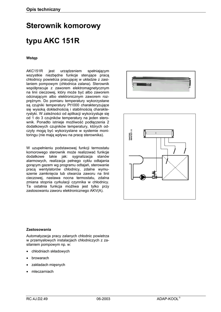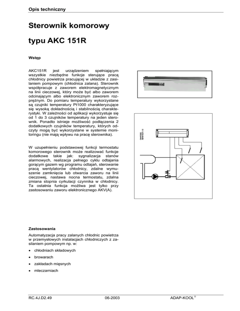 Opis techniczny Sterownik komorowy typu AKC 151R Wstęp AKC151R jest urządzeniem spełniającym wszystkie niezbędne funkcje sterujące pracą chłodnicy powietrza pracującej w układzie z zasilaniem pompowym (chłodnica zalana). Sterownik współpracuje z zaworem elektromagnetycznym na linii cieczowej, który może być albo zaworem odcinającym albo elektronicznym zaworem rozprężnym. Do pomiaru temperatury wykorzystane są czujniki temperatury Pt1000 charakteryzujące się wysoką dokładnością i stabilnością charakterystyki. W zależności od aplikacji wykorzystuje się od 1 do 3 czujników temperatury na jeden sterownik. Ponadto istnieje możliwość podłączenia 2 dodatkowych czujników temperatury, których odczyty mogą być wykorzystane w systemie monitoringu (nie mają wpływu na pracę sterownika). W uzupełnieniu podstawowej funkcji termostatu komorowego sterownik może realizować funkcje dodatkowe takie jak: sygnalizacja stanów alarmowych, realizacja pełnego cyklu odtajania gorącym gazem wg programu odtajań, sterowanie pracą wentylatorów chłodnicy, zdalne wymuszenie zamknięcia lub otwarcia zaworu na linii cieczowej, nastawa nocna termostatu, zdalna zmiana stopnia cyrkulacji czynnika w chłodnicy. Ta ostatnia funkcja możliwa jest tylko przy zastosowaniu zaworu elektronicznego AKV(A). Zastosowania Automatyzacja pracy zalanych chłodnic powietrza w przemysłowych instalacjach chłodniczych z zasilaniem pompowym np. w: • chłodniach składowych • browarach • zakładach mięsnych • mleczarniach RC.4J.D2.49 06-2003 ADAP-KOOL Funkcje Termostat Gdy temperatura mierzona czujnikiem termostatu osiąga zadaną wartość sterownik odcina dopływ czynnika do chłodnicy (i ewentualnie zamyka zawór na rurociągu ssawnym za chłodnicą). Jeśli zastosowano dwa czujniki temperatury (S3 i S4) termostat może reagować na średnią temperaturę mierzoną tymi czujnikami. W godzinach obowiązywania niższej taryfy opłat za energię elektryczną nastawa termostatu może być obniżana (“nastawa nocna”), co pozwala zakumulować zimno w towarze. Wartość zmiany nastawy ustalana jest dowolnie przez użytkownika. Zmiana nastawy następuje po podaniu sygnału zewnętrznego na jedno z wejść sterownika. Zasilanie chłodnicy czynnikiem Można wybrać jeden z dwóch sposobów zasilania chłodnicy. Pierwszy z nich to tradycyjne zasilanie przez zawór elektromagnetyczny odcinający (EVRA) i ręczny zawór rozprężny (REG). Drugi sposób pozwala na zastąpienie tych dwóch zaworów jednym elektronicznym zaworem rozprężnym AKVA. Dzięki temu możliwa jest zdalna zmiana stopnia otwarcia zaworu rozprężnego - jest to jedna z nastaw sterownika. Zastosowanie zaworu AKVA pozwala również na okresowe zwiększenie stopnia otwarcia zaworu przy rozruchu po zakończeniu cyklu odtajania, co zapewnia szybsze osiągnięcie pełnej wydajności przez chłodnicę. Funkcja alarmowa Funkcja alarmowa w sposób ciągły nadzoruje temperaturę przestrzeni chłodzonej oraz prawidłowość pracy sterownika i elementów z nim współpracujących (czujniki temperatury). Ewentualne stany alarmowe sygnalizowane są na wyjściu alarmowym, natomiast informację o przyczynie alarmu odczytać można za pomocą programatora podręcznego (służącego również do wprowadzania i zmiany nastaw). Przykładem sygnalizowanego alarmu jest alarm wysokiej lub niskiej temperatury. Limity alarmowe i opóźnienie sygnalizacji alarmu ustawiane są dowolnie przez użytkownika. Transmisja danych Do obsługi sterownika (konfiguracja, nastawy) może służyć programator podręczny AKA21 lub komputer PC z oprogramowaniem AKM. Możliwe jest też połączenie wielu sterowników w jeden system i ich centralna obsługa wraz z rejestracją dowolnych parametrów pracy. W przypadku rozbudowanych systemów wszystkie sterowniki są łączone między sobą dwuprzewodową magistralą cyfrowej transmisji danych zapewniającą dwustronny przepływ informacji między komputerem (znajdującym się np. w maszynowni) i każdym ze sterowników. Sterowniki mogą być rozmieszczone w dowolnych miejscach instalacji - jedynym warunkiem jest ich połączenie wspomnianą wyżej magistralą. 2 Opis techniczny RC.4J.D2.49 Danfoss 06/2003 AKC 151R Sterowanie odtajaniem Uniwersalna funkcja odtajania może być odpowiednio skonfigurowana do dowolnego systemu odtajania chłodnic powietrza. • Odtajanie elektryczne lub gorącym gazem • Start odtajania wg zegara wewnętrznego lub wg sygnału zewnętrznego • Koniec odtajania po osiągnięciu zadanej temperatury lub po przekroczeniu zadanego czasu • Wentylatory załączone lub wyłączone w czasie odtajania • Wyjście sterujące sprężarką załączone lub wyłączone w czasie odtajania Pełna sekwencja cyklu odtajania składa się z maksymalnie siedmiu kolejnych stanów pracy, których czas trwania może być odpowiednio zmieniany. Niektóre z tych stanów pracy mogą być również całkowicie pominięte. 1. Zamykanie zaworu głównego na ssaniu. 2. HP bypass (opróżnienie parownika) - przed rozpoczęciem właściwego cyklu odtajania ciekły czynnik znajdujący się w chłodnicy jest z niej usuwany (np. przez zawór obejściowy zaworu pływakowego, patrz rysunek na dole strony 6). 3. Właściwe odtajanie. 4. Wyrównanie ciśnień - zawór obejściowy głównego zaworu na ssaniu otwiera się aby zapewnić łagodne wyrównanie ciśnień między parownikiem a stroną ssawną. 5. Opóźnienie zasilania czynnikiem - zawór główny na ssaniu otwiera się, zawór na rurociągu cieczowym pozostaje zamknięty. 6. Opóźnienie startu wentylatorów - chłodnica jest zasilana czynnikiem, wentylatory pozostają wyłączone. 7. Rozruch po odtajaniu - zawór AKVA (patrz rysunek na górze strony 6) pracuje ze zwiększonym stopniem otwarcia w celu szybkiego napełnienia chłodnicy (ten stan pracy nie jest możliwy przy zastosowaniu zwykłego zaworu elektromagnetycznego i ręcznego zaworu rozprężnego).