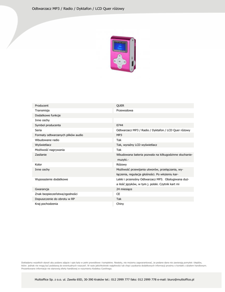 Odtwarzacz MP3 / Radio / Dyktafon / LCD Quer różowy Producent QUER Transmisja Przewodowa Dodatkowe funkcje Inne cechy Symbol producenta 0744 Seria Odtwarzacz MP3 / Radio / Dyktafon / LCD Quer różowy Formaty odtwarzanych plików audio MP3 Wbudowane radio Tak Wyświetlacz Tak, wyraźny LCD wyświetlacz Możliwość nagrywania Tak Zasilanie Wbudowana bateria pozwala na kilkugodzinne słuchaniemuzyki.- Kolor Różowy Inne cechy Możliwość przewijania utworów, przełączania, wyłączenia, regulacja głośności. Po włożeniu kar- Wyposażenie dodatkowe Lekki i przenośny Odtwarzacz MP3. Obsługiwana duża ilość języków, w tym j. polski. Czytnik kart mi Gwarancja 24 miesiące Znak bezpieczeństwa/zgodności CE Dopuszczenie do obrotu w RP Tak Kraj pochodzenia Chiny Dokładamy wszelkich starań aby podane zdjęcie i opis były w pełni prawidłowe i kompletne. Niestety, nie możemy zagwarantować, że podane dane nie zawierają pomyłek i błędów, które jednak nie mogą być podstawą do ewentualnych roszczeń. W razie jakichkolwiek wątpliwości lub chęci uzyskania dodatkowych informacji prosimy o kontakt z działem handlowym. Prezentowane informacje nie stanowią oferty handlowej w rozumieniu Kodeksu Cywilnego. Multioffice Sp. z o.o. ul. Zawiła 65D, 30-390 Kraków tel.: 012 2999 777 faks: 012 2999 778 e-mail: [email protected]