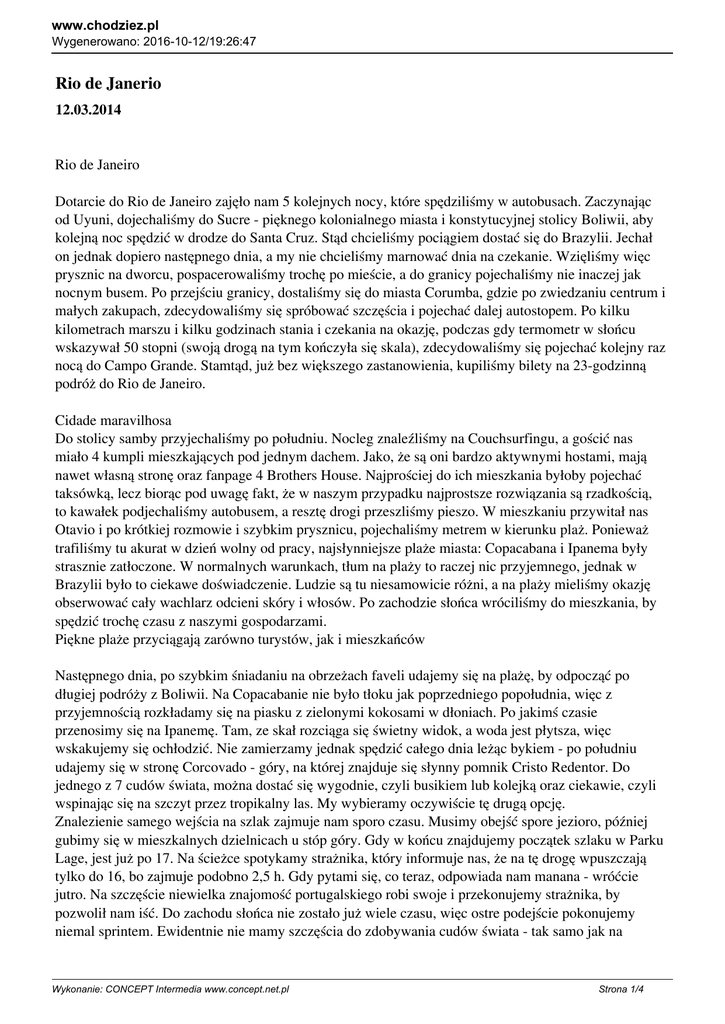 www.chodziez.pl Wygenerowano: 2016-10-12/19:26:47 Rio de Janerio 12.03.2014 Rio de Janeiro Dotarcie do Rio de Janeiro zajęło nam 5 kolejnych nocy, które spędziliśmy w autobusach. Zaczynając od Uyuni, dojechaliśmy do Sucre - pięknego kolonialnego miasta i konstytucyjnej stolicy Boliwii, aby kolejną noc spędzić w drodze do Santa Cruz. Stąd chcieliśmy pociągiem dostać się do Brazylii. Jechał on jednak dopiero następnego dnia, a my nie chcieliśmy marnować dnia na czekanie. Wzięliśmy więc prysznic na dworcu, pospacerowaliśmy trochę po mieście, a do granicy pojechaliśmy nie inaczej jak nocnym busem. Po przejściu granicy, dostaliśmy się do miasta Corumba, gdzie po zwiedzaniu centrum i małych zakupach, zdecydowaliśmy się spróbować szczęścia i pojechać dalej autostopem. Po kilku kilometrach marszu i kilku godzinach stania i czekania na okazję, podczas gdy termometr w słońcu wskazywał 50 stopni (swoją drogą na tym kończyła się skala), zdecydowaliśmy się pojechać kolejny raz nocą do Campo Grande. Stamtąd, już bez większego zastanowienia, kupiliśmy bilety na 23-godzinną podróż do Rio de Janeiro. Cidade maravilhosa Do stolicy samby przyjechaliśmy po południu. Nocleg znaleźliśmy na Couchsurfingu, a gościć nas miało 4 kumpli mieszkających pod jednym dachem. Jako, że są oni bardzo aktywnymi hostami, mają nawet własną stronę oraz fanpage 4 Brothers House. Najprościej do ich mieszkania byłoby pojechać taksówką, lecz biorąc pod uwagę fakt, że w naszym przypadku najprostsze rozwiązania są rzadkością, to kawałek podjechaliśmy autobusem, a resztę drogi przeszliśmy pieszo. W mieszkaniu przywitał nas Otavio i po krótkiej rozmowie i szybkim prysznicu, pojechaliśmy metrem w kierunku plaż. Ponieważ trafiliśmy tu akurat w dzień wolny od pracy, najsłynniejsze plaże miasta: Copacabana i Ipanema były strasznie zatłoczone. W normalnych warunkach, tłum na plaży to raczej nic przyjemnego, jednak w Brazylii było to ciekawe doświadczenie. Ludzie są tu niesamowicie różni, a na plaży mieliśmy okazję obserwować cały wachlarz odcieni skóry i włosów. Po zachodzie słońca wróciliśmy do mieszkania, by spędzić trochę czasu z naszymi gospodarzami. Piękne plaże przyciągają zarówno turystów, jak i mieszkańców Następnego dnia, po szybkim śniadaniu na obrzeżach faveli udajemy się na plażę, by odpocząć po długiej podróży z Boliwii. Na Copacabanie nie było tłoku jak poprzedniego popołudnia, więc z przyjemnością rozkładamy się na piasku z zielonymi kokosami w dłoniach. Po jakimś czasie przenosimy się na Ipanemę. Tam, ze skał rozciąga się świetny widok, a woda jest płytsza, więc wskakujemy się ochłodzić. Nie zamierzamy jednak spędzić całego dnia leżąc bykiem - po południu udajemy się w stronę Corcovado - góry, na której znajduje się słynny pomnik Cristo Redentor. Do jednego z 7 cudów świata, można dostać się wygodnie, czyli busikiem lub kolejką oraz ciekawie, czyli wspinając się na szczyt przez tropikalny las. My wybieramy oczywiście tę drugą opcję. Znalezienie samego wejścia na szlak zajmuje nam sporo czasu. Musimy obejść spore jezioro, później gubimy się w mieszkalnych dzielnicach u stóp góry. Gdy w końcu znajdujemy początek szlaku w Parku Lage, jest już po 17. Na ścieżce spotykamy strażnika, który informuje nas, że na tę drogę wpuszczają tylko do 16, bo zajmuje podobno 2,5 h. Gdy pytami się, co teraz, odpowiada nam manana - wróćcie jutro. Na szczęście niewielka znajomość portugalskiego robi swoje i przekonujemy strażnika, by pozwolił nam iść. Do zachodu słońca nie zostało już wiele czasu, więc ostre podejście pokonujemy niemal sprintem. Ewidentnie nie mamy szczęścia do zdobywania cudów świata - tak samo jak na Wykonanie: CONCEPT Intermedia www.concept.net.pl Strona 1/4 www.chodziez.pl Wygenerowano: 2016-10-12/19:26:47 Machu Picchu - szybko kończy się nam woda, jest gorąco, idzie się ciężko. Ale dajemy z siebie wszystko i po godzinie z hakiem jesteśmy na szczycie. Tu spotyka nas kolejna niemiła niespodzianka - nie można kupić biletów! Kobieta przy bramkach odsyła nas do kasy... w połowie góry. Podobno jakiś bus pojechał tam kupić bilety dla innych i prosimy, by wzięli dwa więcej dla nas. Gdy bus się pojawia, pozostali czekający odbierają swoje wejściówki, a dla nas niestety już nie starcza... Po całym wysiłku włożonym w dotarcie na miejsce jesteśmy trochę rozgoryczeni, ale z całych sił staramy się coś zrobić. Zagadujemy do mężczyzny z większej grupy czy nie mają przypadkiem dodatkowych biletów. Mówi, że najpierw oni wejdą, a potem zobaczy się, czy coś zostało. Czekamy chwilę i mamy szczęście! Znajdują się dwa dodatkowe bilety, które odkupujemy za 20 reali. Cena wysoka, ale zawiera też busika w dół. Jeszcze tylko ostatnie schody, obchodzimy gigantyczną figurę Chrystusa i naszym oczom ukazuje się widok, który nie ma sobie równych - wielkie Rio, cudowne miasto, jak nazywają je Brazylijczycy. Słońce zachodzi za Ipanemą, nad zatoką, na której stoją zacumowane okręty, powoli zapada zmrok. Ulice i budynki powoli się rozświetlają, a szerokie drogi zamieniają się w rzeki białych i czerwonych świateł samochodów. Nawet duża ilość ludzi na platformie widokowej nie niszczy tego niezwykłego przeżycia. Niestety, nie mamy tu dużo czasu pojawia się obsługa i informuje, że ostatni bus w dół odjeżdża teraz... Nie za 5 czy 10 minut, ale teraz. Nie chcąc wracać długą trasą w dół po ciemku, idziemy na parking. Tak mało czasu na szczycie było rozczarowaniem, ale jeszcze większym okazał się bus, który zabiera nas tylko do połowy drogi w dół, gdzie większość ludzi ma swoje auta. My musimy zejść pieszo, po ciemnej drodze w gęstym lasie deszczowym. Już samo to nie jest zbyt bezpieczne. Gdy zaś w ciemności piszę smsa - kończę na