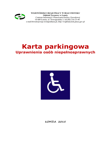 WOJEWÓDZKI URZĄD PRACY W BIAŁYMSTOKU Oddział Terenowy w Łomży Centrum Informacji i Planowania Kariery Zawodowej 18-400 Łomża, ul. Nowogrodzka 1; tel.(86) 216-23-46 e-mail:[email protected], http://wupbialystok.praca.gov.pl Karta parkingowa Uprawnienia osób niepełnosprawnych ŁOMŻA 2015 Karta parkingowa to jedyny dokument uprawniający osoby z niepełnosprawnością do parkowania na "kopertach". Jest wydawana na osobę (nie na samochód) lub placówkę. Karta parkingowa jest dokumentem o standardzie międzynarodowym, która obowiązuje nie tylko na terenie Polski, ale także w krajach Unii Europejskiej. Jednak w poszczególnych krajach członkowskich obowiązują odrębne przepisy wynikające z prawa drogowego dla danego kraju, a w związku z tym odrębne ulgi i uprawnienia dla osób z niepełnosprawnością. Kto może otrzymać kartę parkingową? Zgodnie z ustawą z 23 października 2013 r. o zmianie ustawy - Prawo o ruchu drogowym i niektórych innych ustaw (Dz. U. z 2013 r., poz. 1446) imienną kartę parkingową można otrzymać tylko na podstawie orzeczeń wydawanych przez Powiatowe lub Miejskie Zespoły do Spraw Orzekania o Niepełnosprawności. UWAGA! Stare karty parkingowe straciły ważność 30 czerwca 2015 r. Od 1 lipca 2014 r. nową kartę parkingową może otrzymać: osoba ze znacznym stopniem niepełnosprawności i znacznie ograniczonymi możliwościami samodzielnego poruszania się, osoba z umiarkowanym stopniem niepełnosprawności, znacznie ograniczonymi możliwościami samodzielnego poruszania się i kodami w orzeczeniu 04-O (choroby narządu wzroku) lub 05-R (upośledzenie narządu ruchu) lub 10-N (choroba neurologiczna), osoba do 16 roku życia ze znacznie ograniczonymi możliwościami samodzielnego poruszania się. W orzeczeniu o niepełnosprawności lub stopniu niepełnosprawności w punkcie 9 musi być zaznaczona przesłanka określona w art. 8 ust. 3a pkt 1 i 2 ustawy z 20 czerwca 1997 r. – Prawo o ruchu drogowym (Dz. U. z 2012 r. poz. 1137, z późn. zm.) o wskazaniu do wydania karty parkingowej. W przypadku osób z niepełnosprawnością zaliczonych do umiarkowanego stopnia niepełnosprawności spełnienie tych przesłanek może zostać stwierdzone jedynie w przypadku ustalenia przyczyny niepełnosprawności oznaczonej symbolem 04-O (choroby narządu wzroku) lub 05-R (upośledzenie narządu ruchu) lub 10-N (choroba neurologiczna). Osoba prywatna otrzymuje kartę parkingową orzeczenia, ale nie dłużej niż na 5 lat. na czas ważności Karta parkingowa dla placówki Kartę parkingową może uzyskać także placówka zajmująca się opieką, rehabilitacją lub edukacją osób z niepełnosprawnością, które mają znacznie ograniczone możliwości samodzielnego poruszania się. Placówka może otrzymać kartę parkingową że samochód jest własnością placówki. na 3 lata pod warunkiem, Gdzie można wyrobić kartę parkingową? Kartę parkingową wydaje przewodniczący powiatowego zespołu ds. orzekania o niepełnosprawności. Za wydanie karty parkingowej pobiera się opłatę w wysokości 21 zł na podstawie rozporządzenia Ministra Pracy i Polityki Społecznej z 24 czerwca 2014 r. (Dz. U. z 2014 r., poz. 843) w sprawie wysokości opłaty za wydanie karty parkingowej oraz warunków dystrybucji blankietów kart parkingowych. Jakie dokumenty będą potrzebne? Do otrzymania karty parkingowej potrzebne będą: wniosek o wydanie karty parkingowej, jedna fotografia o wymiarach 3,5 cm x 4,5 cm, odzwierciedlająca aktualny wizerunek osoby, której wniosek dotyczy, bez nakrycia głowy i okularów z ciemnymi szkłami, dowód uiszczenia opłaty za wydanie karty parkingowej, składając wniosek przedstawia się do wglądu oryginał prawomocnego orzeczenia o niepełnosprawności, o stopniu niepełnosprawności lub o wskazaniach do ulg i uprawnień - wraz ze wskazaniem do karty parkingowej. UWAGA! Osoby, które po 1 lipca 2014 r. muszą uzyskać nowe orzeczenie ze wskazaniem do uzyskania karty parkingowej – najpierw muszą stanąć na komisji orzekającej, natomiast opłatę za jej wyrobienie uiszczają dopiero po uzyskaniu uprawnienia. Co daje karta parkingowa? Osoba niepełnosprawna mająca znacznie ograniczone możliwości samodzielnego poruszania się, kierująca pojazdem samochodowym oznaczonym kartą parkingową, może nie stosować się do niektórych znaków drogowych. Przepis ten dotyczy również: kierującego pojazdem przewożącego osobę o znacznie ograniczonej możliwości samodzielnego poruszania się, pracowników placówek zajmujących się opieką, rehabilitacją lub edukacją osób z niepełnosprawnością mających znacznie ograniczone możliwości samodzielnego poruszania się, pozostających pod opieką tych placówek. Wszystkie przepisy dotyczące karty parkingowej stosują się także do osób, które posługują się kartą parkingową wydaną poza granicami Polski. Kartę parkingową należy umieścić w widocznym miejscu za przednią szybą samochodu, eksponując jej zabezpieczenia, i umożliwiając odczytanie jej numeru i daty ważności. Karta parkingowa potwierdza uprawnienia: do korzystania z miejsc parkingowych wyznaczonych dla osób z niepełnosprawnością (tzw. kopert) oraz do niestosowania się do następujących znaków drogowych: B-1 zakaz ruchu w obu kierunkach B-3 zakaz wjazdu pojazdów silnikowych z wyjątkiem motocykli jednośladowych B-3a zakaz wjazdu autobusów B-4 zakaz wjazdu motocykli B-10 zakaz wjazdu motorowerów B-35 zakaz postoju B-37 zakaz postoju w dni nieparzyste B-38 zakaz postoju w dni parzyste B-39 strefa ograniczonego postoju Wzór karty parkingowej dla osób z niepełnosprawnością Wzór karty parkingowej określony jest w rozporządzeniu Ministra Pracy i Polityki Społecznej z 25 czerwca 2014 r. w sprawie wzoru oraz trybu wydawania i zwrotu kart parkingowych. Awers: Rewers: źródło: http://www.niepelnosprawni.pl/ledge/x/3549