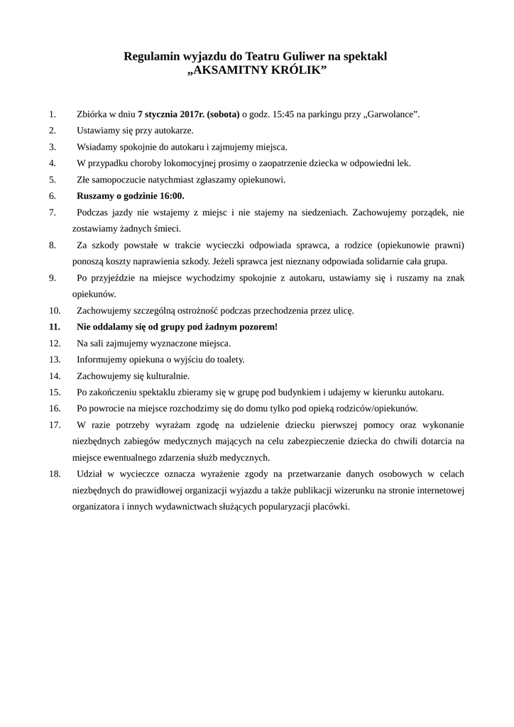 Regulamin wyjazdu do Teatru Guliwer na spektakl „AKSAMITNY KRÓLIK” 1. Zbiórka w dniu 7 stycznia 2017r. (sobota) o godz. 15:45 na parkingu przy „Garwolance”. 2. Ustawiamy się przy autokarze. 3. Wsiadamy spokojnie do autokaru i zajmujemy miejsca. 4. W przypadku choroby lokomocyjnej prosimy o zaopatrzenie dziecka w odpowiedni lek. 5. Złe samopoczucie natychmiast zgłaszamy opiekunowi. 6. Ruszamy o godzinie 16:00. 7. Podczas jazdy nie wstajemy z miejsc i nie stajemy na siedzeniach. Zachowujemy porządek, nie zostawiamy żadnych śmieci. 8. Za szkody powstałe w trakcie wycieczki odpowiada sprawca, a rodzice (opiekunowie prawni) ponoszą koszty naprawienia szkody. Jeżeli sprawca jest nieznany odpowiada solidarnie cała grupa. 9. Po przyjeździe na miejsce wychodzimy spokojnie z autokaru, ustawiamy się i ruszamy na znak opiekunów. 10. Zachowujemy szczególną ostrożność podczas przechodzenia przez ulicę. 11. Nie oddalamy się od grupy pod żadnym pozorem! 12. Na sali zajmujemy wyznaczone miejsca. 13. Informujemy opiekuna o wyjściu do toalety. 14. Zachowujemy się kulturalnie. 15. Po zakończeniu spektaklu zbieramy się w grupę pod budynkiem i udajemy w kierunku autokaru. 16. Po powrocie na miejsce rozchodzimy się do domu tylko pod opieką rodziców/opiekunów. 17. W razie potrzeby wyrażam zgodę na udzielenie dziecku pierwszej pomocy oraz wykonanie niezbędnych zabiegów medycznych mających na celu zabezpieczenie dziecka do chwili dotarcia na miejsce ewentualnego zdarzenia służb medycznych. 18. Udział w wycieczce oznacza wyrażenie zgody na przetwarzanie danych osobowych w celach niezbędnych do prawidłowej organizacji wyjazdu a także publikacji wizerunku na stronie internetowej organizatora i innych wydawnictwach służących popularyzacji placówki.