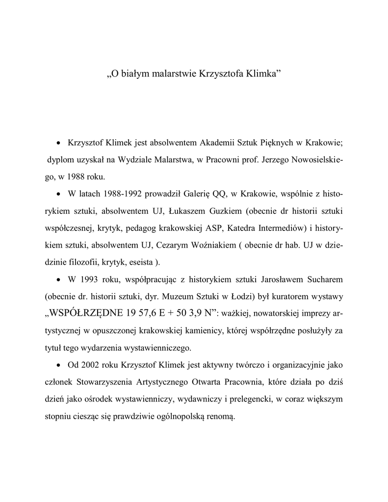 „O białym malarstwie Krzysztofa Klimka” Krzysztof Klimek jest absolwentem Akademii Sztuk Pięknych w Krakowie; dyplom uzyskał na Wydziale Malarstwa, w Pracowni prof. Jerzego Nowosielskiego, w 1988 roku. W latach 1988-1992 prowadził Galerię QQ, w Krakowie, wspólnie z historykiem sztuki, absolwentem UJ, Łukaszem Guzkiem (obecnie dr historii sztuki współczesnej, krytyk, pedagog krakowskiej ASP, Katedra Intermediów) i historykiem sztuki, absolwentem UJ, Cezarym Woźniakiem ( obecnie dr hab. UJ w dziedzinie filozofii, krytyk, eseista ). W 1993 roku, współpracując z historykiem sztuki Jarosławem Sucharem (obecnie dr. historii sztuki, dyr. Muzeum Sztuki w Łodzi) był kuratorem wystawy „WSPÓŁRZĘDNE 19 57,6 E + 50 3,9 N”: ważkiej, nowatorskiej imprezy artystycznej w opuszczonej krakowskiej kamienicy, której współrzędne posłużyły za tytuł tego wydarzenia wystawienniczego. Od 2002 roku Krzysztof Klimek jest aktywny twórczo i organizacyjnie jako członek Stowarzyszenia Artystycznego Otwarta Pracownia, które działa po dziś dzień jako ośrodek wystawienniczy, wydawniczy i prelegencki, w coraz większym stopniu ciesząc się prawdziwie ogólnopolską renomą. 1.Twórczość malarską Krzysztofa Klimka śledzę od akademickiego etapu jej rozwoju. W latach 1983-1986 młodego adepta sztuki uczyłem podstaw widzenia w Pracowni Rysunku, która była niejako odnogą katedralną Pracowni Malarstwa, prowadzonej przez prof. Jerzego Nowosielskiego. Z tamtego okresu dość dobrze pamiętam jego rysunki i obrazy. Utwory te cechował swoisty syntetyzm formy, bezbłędne wyczucie koloru oraz, by tak rzec, zgrzebny, po trosze romantyczny „pędzel”. Z czasem jakości te dzięki postępującej transformacji języka wyrazu — od figuracji w stronę abstrakcji — coraz bardziej się autonomizowały i uszlachetniały formalnie i artystycznie; dziś, po wielu już latach rozwoju Krzysztofa Klimka, stanowią idiomatyczny znak rozpoznawczy jego malarstwa. 2.Opus minor — to tytuł pięknej, wręcz bibliofilskiej książeczki, którą Krzysztof Klimek wydał w 2006 roku w ramach działalności Stowarzyszenia Otwarta Pracownia. W tomiku tym twórca użył pojęcia opus minor w odniesieni do ówczesnej fazy swej wędrówki artystycznej, mając na myśli „dzieło mniejsze”, poboczne, jakby wycofane. Osobiście poszerzyłbym zakres semantyczny tego pojęcia: twórczość malarską Krzysztofa Klimka można odczytywać i interpretować jako opus w tonacji mollowej — posępnej, smętnej, nostalgicznej, melancholijnej: jako dzieło wyciszone, bezgłośne, w dosłownym znaczeniu m i n o r o w e . Nie wiem, w jakiej mierze, określając konkretną fazę rozwoju swej twórczości pojęciem opus minor, autor miał na uwadze również ten, wskazany przezemnie i znacznie poszerzony zakres semantyczny tego pojęcia. Tak czy inaczej, w moim odczuciu melodyka sporej części dzieł zarówno abstrakcyjnych, jak i figuratywnych Krzysztofa Klimka jest melancholijna bo takie jest wnętrze artysty. W syntetycznych abstraktach Krzysztofa Klimka dominuje pastelowy, monochromatyczny świat barw. Pod muzycznym względem konstytuują go głównie sfumata różnorakich odcieni beży i kremów, w mniejszym czy większym stopniu rozbielanych, często przyszarzanych żółci i brązów, a także laserunkowo malowanych, gradientowych lub płaskich połaci sepii i brązów. Istotną, bodaj czy nie najważniejszą funkcję narracyjną pełni w tym malarstwie biel. Fizyczny, quasireliefowy byt nadaje owym minorowym klimatom zgrzebna faktura powierzchni obrazów, uzyskiwana pędzlem bądź szpachlą, raz cieńsza, raz grubsza. Jak wspomniałem, ta fakturowa zgrzebność ma quasiromantyczny charakter; z pozoru zdawać się może cokolwiek niechlujna, w gruncie rzeczy jest owocem wyrafinowanej strategii artystycznej i estetycznej autora. I co znamienne: niewielki format prac Krzysztof Klimka skutkuje tym, że naturalna powierzchnia farby — jej faktura — monumentalizuje się : reliefowe efekty obrazów potęgują skalę i materialność swych mikrofragmentów. Im obraz jest mniejszy, tym fakturowy ślad pędzla czy szpachli jest wyrazistszy, mocniejszy, a zarazem bardziej zgrzebny. 3.Pod językowym, formalnym, stylistycznym względem abstrakcyjne obrazy Krzysztofa Klimka mają wiele rodowodowych odniesień i zakotwiczeń. W pierwszym rzędzie musimy wskazać na Malewiczowską transprzedmiotową filozofię suprematyzmu i Mondrianowską abstrakcję o teozoficznej proweniencji. Dostrzegam też paralele między formalno-muzycznymi abstraktami artysty a pracami późnego - klasycznego - Kandinskiego. Bardzo mocno wybrzmiewa w Klimkowych dziełach głęboko przetrawiona lektura barwnych struktur harmonicznych magicznego uniwersum Paula Klee. Z pewnością nie wymieniłem wszystkich antenatów formy malarstwa abstrakcyjnego omawianych prac, ale już te kilka nazwisk jednoznacznie wskazuje na rodowód artystyczny i estetyczny Krakowianina. Wywodzi się on z kręgu abstrakcji, duchowej czy metafizycznej; jej istotowym celem nie jest abstrakcyjny, czysto matematyczny konkret lub hedonizujący estetyzm, lecz taki rodzaj obrazowania, który opierając się na środkach abstrakcyjnej narracji, wysublimowanych z Rzeczywistości, wykracza poza mimetyczne czy estetyczne struktury dzieła — dokonuje prawdziwej transcendencji. Taki rodzaj praktyki twórczej od dawna zwykłem określać jako „poznanie poprzez malarstwo”, w stricte gnostycznym rozumieniu tego fundamentalnego pojęcia. 4.Choć malarstwo Krzysztofa Klimka ma typowo geometryczną proweniencję, trudno uznać je za czysto geometryczne. Nie ma ono nic wspólnego z zimną, kalkulacyjną, ortodoksyjną geometryką abstrakcji, często określaną mianem „abstrakcji konkretnej”. Jego obrazy w większości są modelowymi lirykami, o różnych odcieniach introwertycznej emocjonalności (stąd ich wspomniana już wcześniej minorowość – melancholiczność). Ja