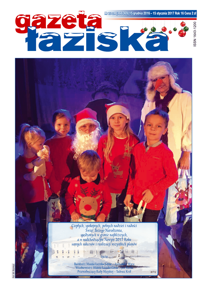 Nr 23-24 (368-369) 15 grudnia 2016 – 15 stycznia 2017 Rok 16 Cena 2 zł Ciepłych, spokojnych, pełnych nadziei i radości Świąt Bożego Narodzenia, spędzonych w gronie najbliższych, a w nadchodzącym Nowym 2017 Roku samych sukcesów i realizacji wszystkich planów Fot. M. Rozmus życzą Burmistrz Miasta Łaziska Górne – Aleksander Wyra Wiceburmistrz Miasta Łaziska Górne – Jan Ratka Przewodniczący Rady Miejskiej – Tadeusz Król informator gazeta łaziska INFORMATOR NUMERY ALARMOWE Państwowa Straż Pożarna (998) 32 326 23 10 OSP Ł. Górne 32 224 21 20 OSP Ł. Średnie 32 224 21 22 OSP Ł. Dolne 32 224 21 21 Policja (997) 32 226 85 10 Straż Miejska (986) 32 224 44 71 POGOTOWIA Ratunkowe (999) 32 226 21 00 32 226 26 65 Centrum Medyczne 32 325 76 00 Gazowe (992) 32 227 31 24 Energetyczne (991) 32 303 21 55 Ciepłownicze 32 226 21 36 Wodno-kanalizacyjne 32 224 18 37 32 224 14 52 PGKiM 32 224 10 88, 32 224 15 50 Punkt konsultacyjny Gminnej Komisji Rozwiązywania Problemów Alkoholowych 32 224 23 90 PRZYCHODNIE Proelmed (ul. Wyzwolenia 30)32 324 31 23 Przychodnia (ul. Staszica 4a)32 737 02 30 Przychodnia (ul. Chopina 17)32 736 76 70 32 736 76 55 APTEKI „Arnika” (os. Centrum 7) 32 224 38 39 „Moja Apteka” (ul. Staszica 2/2) 32 736 80 90 „Moja Apteka” (ul. Barlickiego 2) 32 738 90 90 „Dbam o Zdrowie” (ul. Wiejska 1) 32 322 70 95 „Dbam o Zdrowie” (ul. Chopina 17) 32 736 76 37 „Apteka św. Anny” (ul. Wyrska 12B) 32 216 11 14 MDK zaprasza... ...8 stycznia o godz. 17.00 do sali widowiskowej na Koncert Kolędowy Narodził się Jedyny Król. Wystąpią Gabi Gąsior & Holy Noiz oraz Dziecięcy Zespół Artystyczny Radość. Wejściówki w cenie 5 zł będzie można nabyć w kasie MDK od 19 grudnia. ...15 stycznia na 25. finał Wielkiej Orkiestry Świątecznej Pomocy. Szczegóły na s.15. …od 16 stycznia na Ferie z MDK. Szczegóły wkrótce na www.mdk.laziska.pl. Zapisy od 2 stycznia. ...22 stycznia o godz. 17.00 do sali widowiskowej na Wieczór kolęd i pastorałek. Podczas koncertu wystąpią chóry: Echo i Wanda z Łazisk, Zorza z Wyr i Lutnia z Pszczyny, a także Orkiestra Dęta Tauron Wytwarzanie oddział Elektrownia Łaziska. …11 lutego o godz. 17.00 do sali nr 16 na V Łaziską Biesiadę. Wystąpią: Dariusz Niebudek oraz zespół Chopcy z Łazisk, gościnnie pojawi się również Lala Supryn. Bilety wstępu w cenie 80 zł można nabyć w kasie biletowej MDK. Zapraszamy do Holandii Zostało jeszcze kilka wolnych miejsc na wyjazd do Holandii. Wyjazd jest zaplanowany w terminie – 7–12 maja 2017 r. – czyli w okresie, kiedy w Holandii jest najpiękniej, ponieważ kwitnie większość kwiatów cebulowych, z których ten kraj słynie. Głównym punktem wyjazdu będzie wizyta w Keukenhof – najpiękniejszym ogrodzie wiosennym świata. Poza tym m.in.: zwiedzanie Amsterdamu, Hagi, Rotterdamu, wizyta w skansenie wiatraków, wiosce rybackiej nad Morzem Północnym, warsztacie serowym, szliŻ INNE Urząd Miasta 32 324 80 00 Starostwo Powiatowe 32 324 81 00 MDK Ł. Górne 32 224 10 33 MDK Ł. Średnie 32 224 48 18 MDK Ł. Dolne 32 322 94 46 PiMBP (biblioteka) 32 224 14 12 Parafia Ł. Górne 32 224 10 13 Parafia Ł. Średnie 32 224 10 03 Parafia Ł. Dolne 32 224 18 42 MOSiR 32 221 11 38 ORS „Żabka” 32 322 93 82 Środowiskowy Dom 32 737 00 46 Samopomocy 698 639 036 OPS 32 326 23 40, 32 326 23 42 SZKOŁY Szkoła Podstawowa nr 1 32 224 10 44 Szkoła Podstawowa nr 5 32 224 12 07 Szkoła Podstawowa nr 6 32 224 32 46 Gimnazjum nr 1 32 224 10 66 Gimnazjum nr 3 32 737 01 17 Zespół Szkół im. Piastów Śląskich 32 224 10 12 Zespół Szkół Energetycznych i Usługowych 32 224 24 15 2 15 grudnia 2016 – 15 stycznia 2017 Y C Z fierni diamentów, rejs po kanałach w Amsterdamie i wiele innych atrakcji. Koszt wyjazdu wynosi 1450 zł. W cenie: 5 noclegów w Euro Hotel Centrum w Rotterdamie, 5 śniadań, transport, ubezpieczenie, usługa przewodnika. Cena nie zawiera biletów wstępu – szacowany koszt ok. 45 euro. Zapisy i wpłaty zaliczki w wysokości 250 zł są przyjmowane w sekretariacie MDK do 30 grudnia. Terminy pozostałych wpłat zostaną podane później. mred. E N I Pięknych, spokojnych i rodzinnych Świąt Bożego Narodzenia oraz wszelkiej pomyślności i radości w Nowym 2017 Roku życzą redakcja Gazety Łaziskiej oraz dyrekcja i pracownicy Miejskiego Domu Kultury Niech ten szczególny czas Świąt Bożego Narodzenia będzie dla Was okazją do spędzenia miłych chwil w gronie najbliższych, w atmosferze pełnej miłości i wzajemnej życzliwości a Nowy 2017 Rok, by stał się czasem spełnionych marzeń i nadziei. Spokojnych Świąt życzy Prezes Zarządu Fundacji Pracowniczej PRO-EKO Jerzy Moryc A z życia miasta gazeta łaziska Przychodnia 19 miesięcy trwała budowa przychodni w centrum miasta – 29 kwietnia 2015 r. podpisano umowę na realizację zadania, a 28 listopada 2016 r. burmistrz Aleksander Wyra odebrał symboliczny klucz do nowo powstałego obiektu. Teraz pozostaje już tylko cierpliwie czekać na uruchomienie usług medycznych, które ma nastąpić w lutym B Maj 2015 r. – roboty ziemne Czerwiec 2015 r. – wykonywanie fundamentów że przy budowie przychodni konieczne było wyburzenie siedziby łaziskiej straży miejskiej, ok. 170 m2 w nowym budynku będą zajmowali strażnicy. Osobne wejście do ich pomieszczeń zlokalizowane jest od północnej strony obiektu. Kończą się prace związane z przygotowaniem infrastruktury wokół nowej przychodni, gdzie zmienił się układ i powstało 140 miejsc parkingowych. W okolice budynku można dojechać trzema drogami – dwoma od ul. Energetyków i jedną od Orzeskiej. Nadal trwają prace związane z wyposażeniem poszczególnych pomieszczeń przychodni. mms Lipiec 2015 r. – murowanie ścian z porothermu Październik 2016 r. – odbiory końcowe Październik 2015 r. – zalewanie stropu I piętra – informuje Krzysztof Jedliński z PGKiM, organizatora bezpłatnej komunikacji na tere