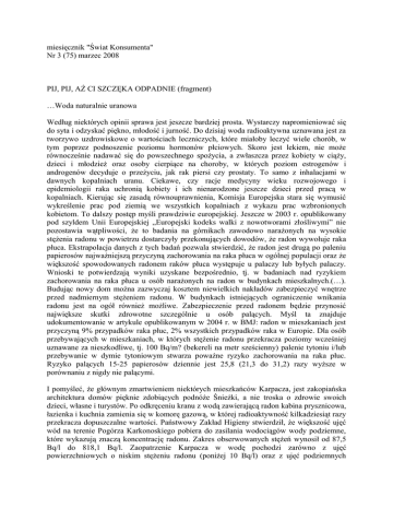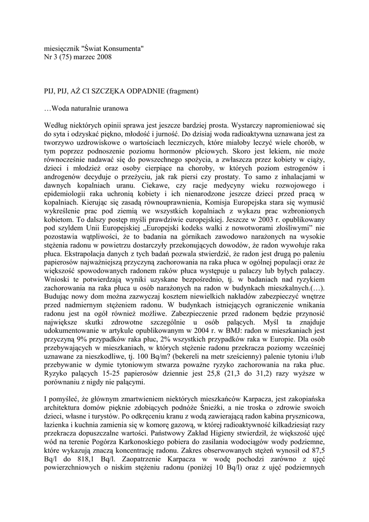 miesięcznik "Świat Konsumenta" Nr 3 (75) marzec 2008 PIJ, PIJ, AŻ CI SZCZĘKA ODPADNIE (fragment) …Woda naturalnie uranowa Według niektórych opinii sprawa jest jeszcze bardziej prosta. Wystarczy napromieniować się do syta i odzyskać piękno, młodość i jurność. Do dzisiaj woda radioaktywna uznawana jest za tworzywo uzdrowiskowe o wartościach leczniczych, które miałoby leczyć wiele chorób, w tym poprzez podnoszenie poziomu hormonów płciowych. Skoro jest lekiem, nie może równocześnie nadawać się do powszechnego spożycia, a zwłaszcza przez kobiety w ciąży, dzieci i młodzież oraz osoby cierpiące na choroby, w których poziom estrogenów i androgenów decyduje o przeżyciu, jak rak piersi czy prostaty. To samo z inhalacjami w dawnych kopalniach uranu. Ciekawe, czy racje medycyny wieku rozwojowego i epidemiologii raka uchronią kobiety i ich nienarodzone jeszcze dzieci przed pracą w kopalniach. Kierując się zasadą równouprawnienia, Komisja Europejska stara się wymusić wykreślenie prac pod ziemią we wszystkich kopalniach z wykazu prac wzbronionych kobietom. To dalszy postęp myśli prawdziwie europejskiej. Jeszcze w 2003 r. opublikowany pod szyldem Unii Europejskiej „Europejski kodeks walki z nowotworami złośliwymi” nie pozostawia wątpliwości, że to badania na górnikach zawodowo narażonych na wysokie stężenia radonu w powietrzu dostarczyły przekonujących dowodów, że radon wywołuje raka płuca. Ekstrapolacja danych z tych badań pozwala stwierdzić, że radon jest drugą po paleniu papierosów najważniejszą przyczyną zachorowania na raka płuca w ogólnej populacji oraz że większość spowodowanych radonem raków płuca występuje u palaczy lub byłych palaczy. Wnioski te potwierdzają wyniki uzyskane bezpośrednio, tj. w badaniach nad ryzykiem zachorowania na raka płuca u osób narażonych na radon w budynkach mieszkalnych.(…). Budując nowy dom można zazwyczaj kosztem niewielkich nakładów zabezpieczyć wnętrze przed nadmiernym stężeniem radonu. W budynkach istniejących ograniczenie wnikania radonu jest na ogół również możliwe. Zabezpieczenie przed radonem będzie przynosić największe skutki zdrowotne szczególnie u osób palących. Myśl ta znajduje udokumentowanie w artykule opublikowanym w 2004 r. w BMJ: radon w mieszkaniach jest przyczyną 9% przypadków raka płuc, 2% wszystkich przypadków raka w Europie. Dla osób przebywających w mieszkaniach, w których stężenie radonu przekracza poziomy wcześniej uznawane za nieszkodliwe, tj. 100 Bq/m? (bekereli na metr sześcienny) palenie tytoniu i/lub przebywanie w dymie tytoniowym stwarza poważne ryzyko zachorowania na raka płuc. Ryzyko palących 15-25 papierosów dziennie jest 25,8 (21,3 do 31,2) razy wyższe w porównaniu z nigdy nie palącymi. I pomyśleć, że głównym zmartwieniem niektórych mieszkańców Karpacza, jest zakopiańska architektura domów pięknie zdobiących podnóże Śnieżki, a nie troska o zdrowie swoich dzieci, własne i turystów. Po odkręceniu kranu z wodą zawierającą radon kabina prysznicowa, łazienka i kuchnia zamienia się w komorę gazową, w której radioaktywność kilkadziesiąt razy przekracza dopuszczalne wartości. Państwowy Zakład Higieny stwierdził, że większość ujęć wód na terenie Pogórza Karkonoskiego pobiera do zasilania wodociągów wody podziemne, które wykazują znaczą koncentrację radonu. Zakres obserwowanych stężeń wynosił od 87,5 Bq/l do 818,1 Bq/l. Zaopatrzenie Karpacza w wodę pochodzi zarówno z ujęć powierzchniowych o niskim stężeniu radonu (poniżej 10 Bq/l) oraz z ujęć podziemnych (głębinowych) o wysokim stężeniu radonu (do 541,0 Bq/l). Stężenie radonu w wodzie ze studni indywidualnych było podobne do stężenia radonu w wodzie pochodzącej z ujęć głębinowych. Radon jest jednym z produktów rozpadu uranu. Według Państwowego Instytutu Geologicznego koncentracje uranu w warstwie powierzchniowej w Polsce wahają się w granicach od 0 do 13,3 g/tonę. Prawie całe Sudety charakteryzuje wartość powyżej 2 g/tonę, w bloku karkonosko-izerskim – 3-5 g/tonę, w pojedynczych punktach ponad 13 g/tonę. Wody pobrane z tamtejszych podziemnych ujęć z reguły zawierają radon, który ulatuje w powietrze, ale też izotopy radu 226Ra i 228Ra. Podobnie wody karpackie, co wykazały badania Państwowego Instytutu Górniczego opublikowane w 2000 r. Im woda wyżej zmineralizowana, tym więcej izotopów radu. W przedwojennej Ameryce woda wzbogacona radem była hitem rynkowym, na którym zbił fortunę niejaki William J. A. Bailey, fałszywy lekarz wyrzucony już z college’u. Twierdził, że opatentowany przez niego Radithor leczy wiele chorób poprzez stymulację hormonalną. Współpracującym lekarzom oferował 17% rabatu za receptę na każdą dawkę wody z radem. Do czasu. Prawie 1 400 butelek Radithoru wypił sławny przemysłowiec, sportowiec i playboy Eben McBurney Byers, zanim nagromadzony w kościach rad doprowadził do ich licznych złamań, a nawet ubytków kości czaszki i szczęki. Zmarł w 1932 r. żegnany tytułem w Wall Street Journal „Zanim mu szczęka odpadła, woda z radem działała świetnie”. dr Zbigniew Hałat lekarz specjalista epidemiolog, w latach 90. w trzech kolejnych rządach główny inspektor sanitarny i zastępca ministra zdrowia ds. sanitarno-epidemiologicznych Prezes Stowarzyszenia Ochrony Zdrowia Konsumentów www.halat.pl/stowarzyszenie.html http://www.halat.pl/radon.html